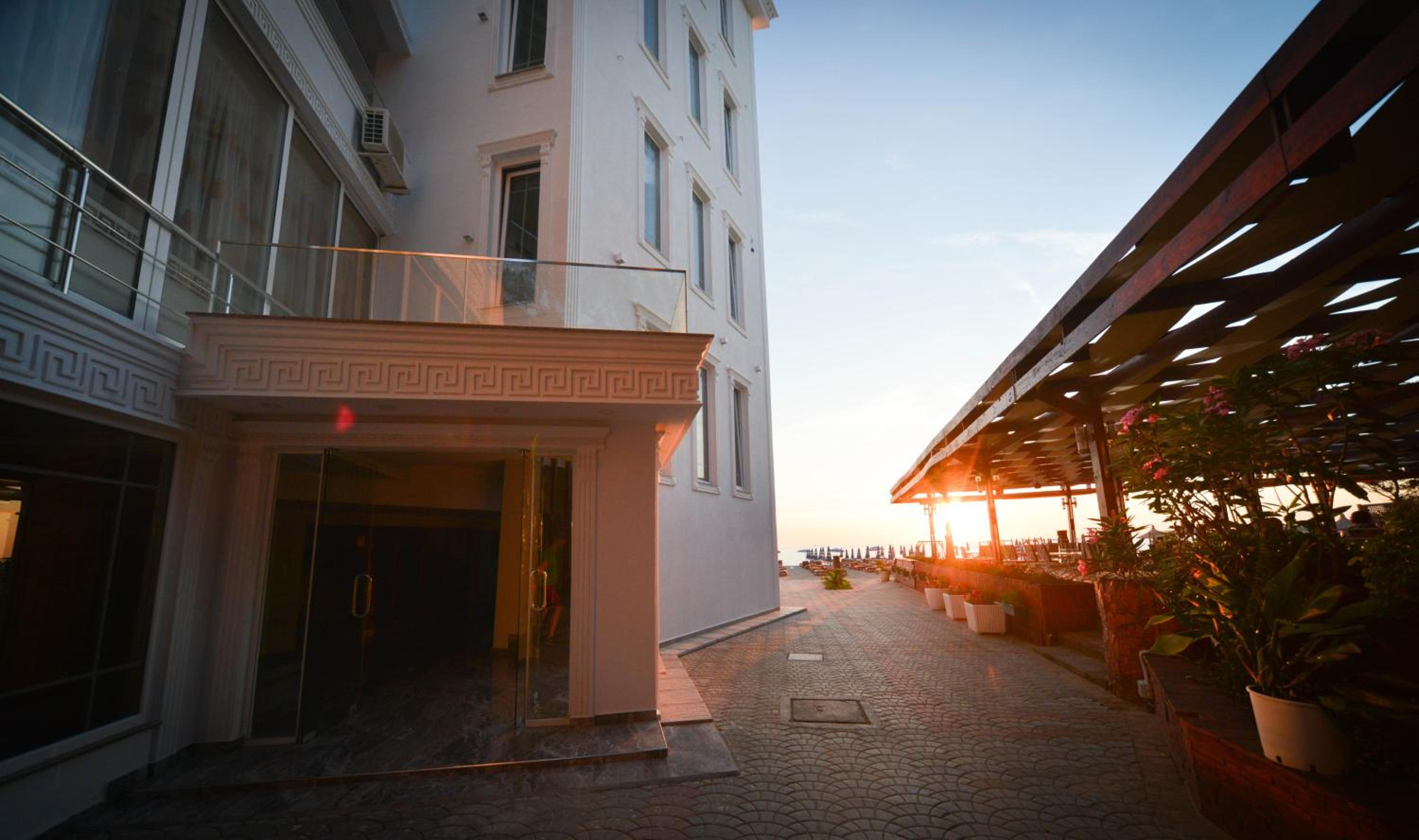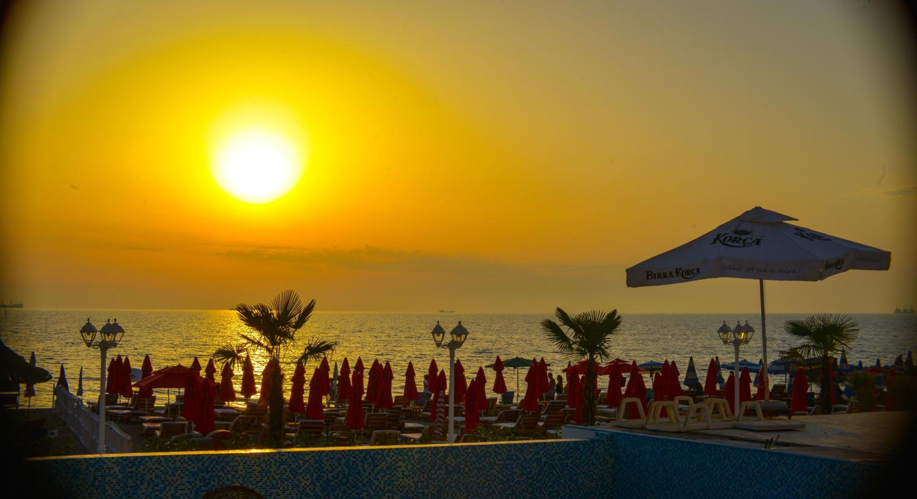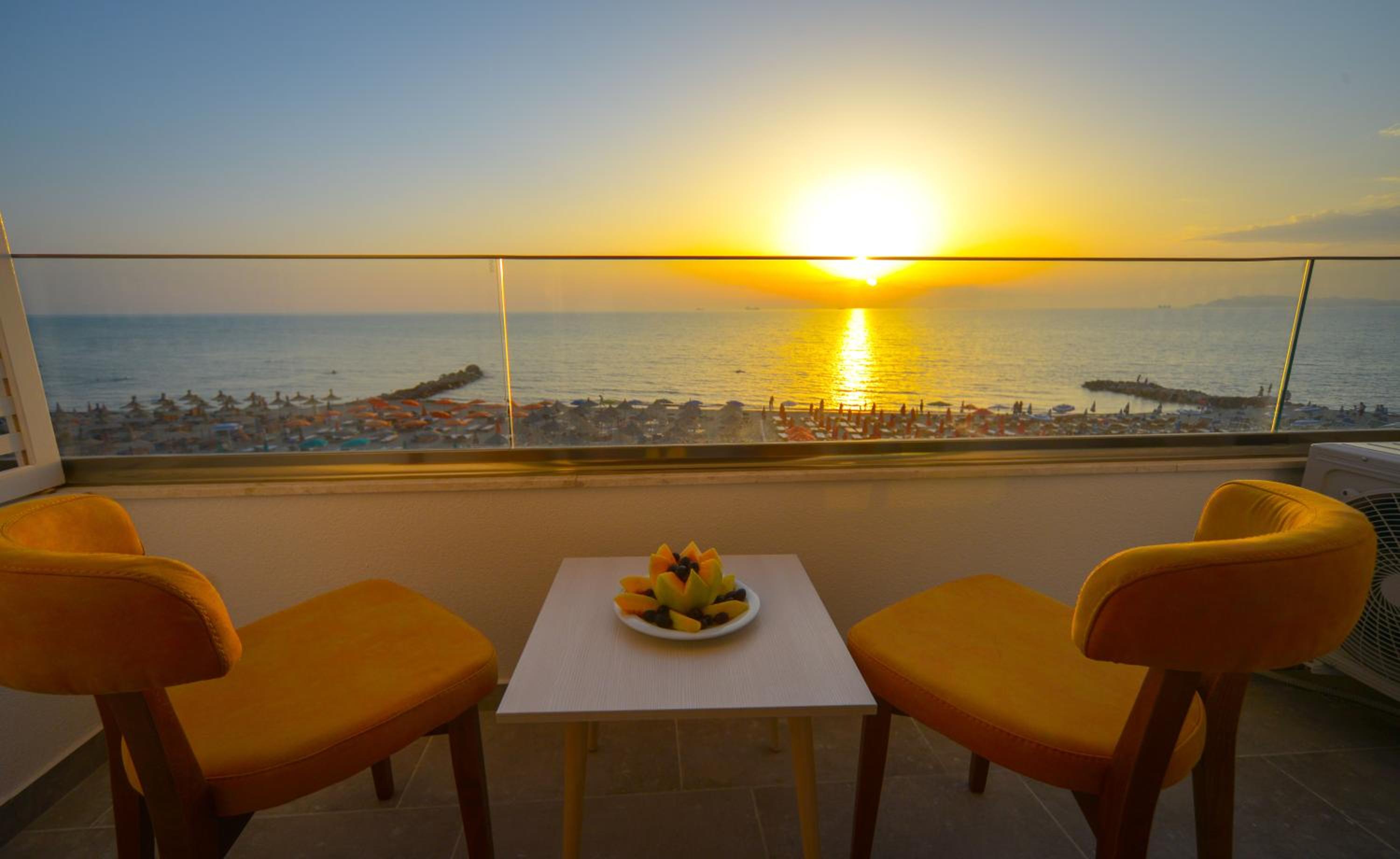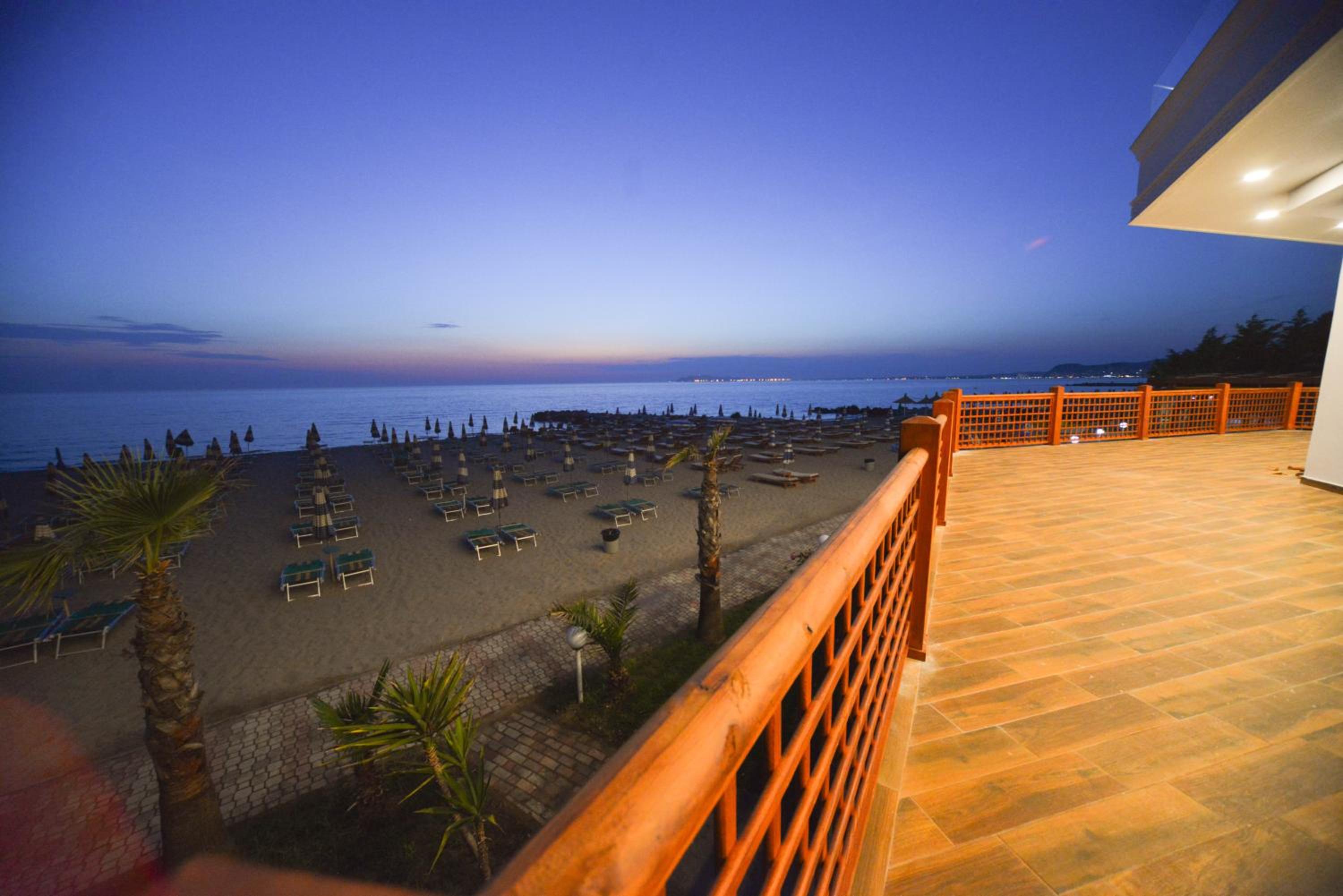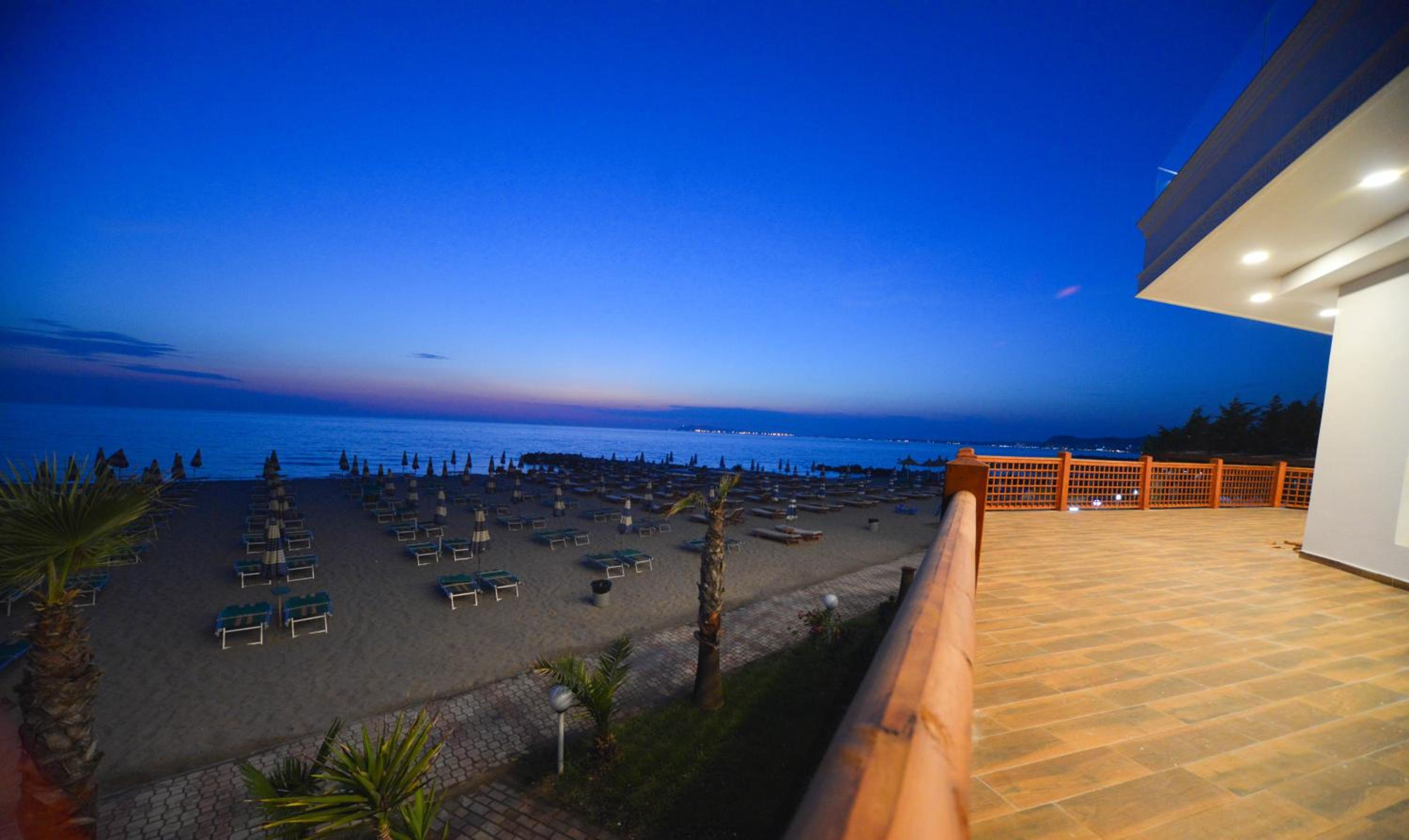 The hotel is right on the beach. I had a room with balcony to the pool and the sea. Beautiful view and the roar of the sea... Very good breakfast including local food. Buffet dinner is available with a nice variety of food. Very polite and very nice young waiter helped me choose a bottle of wine from Albania. I recommend it.