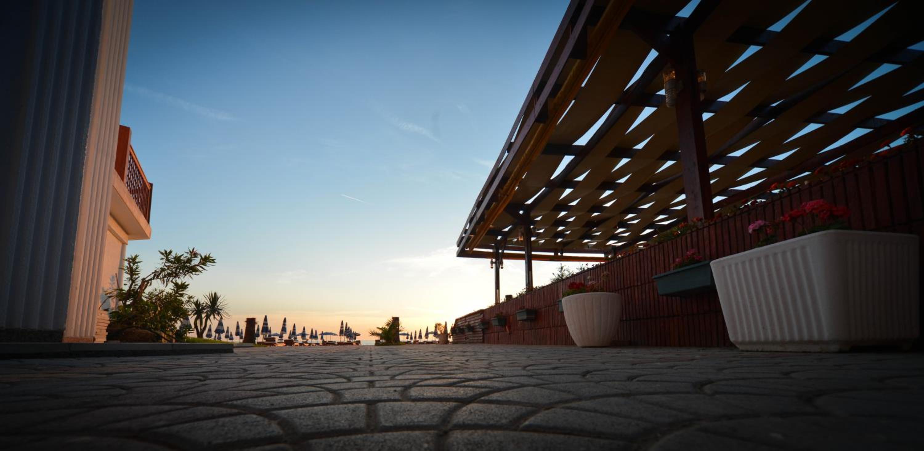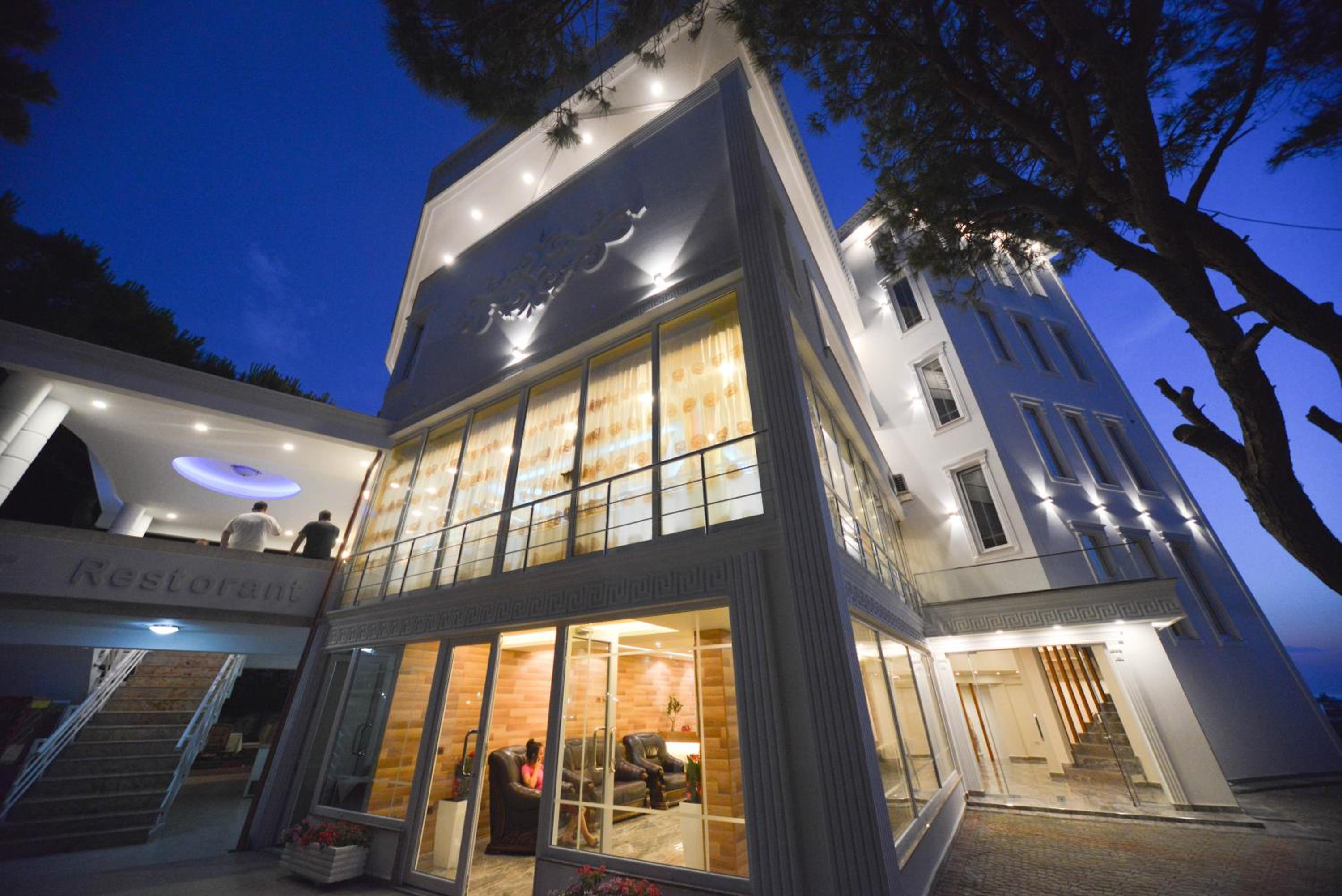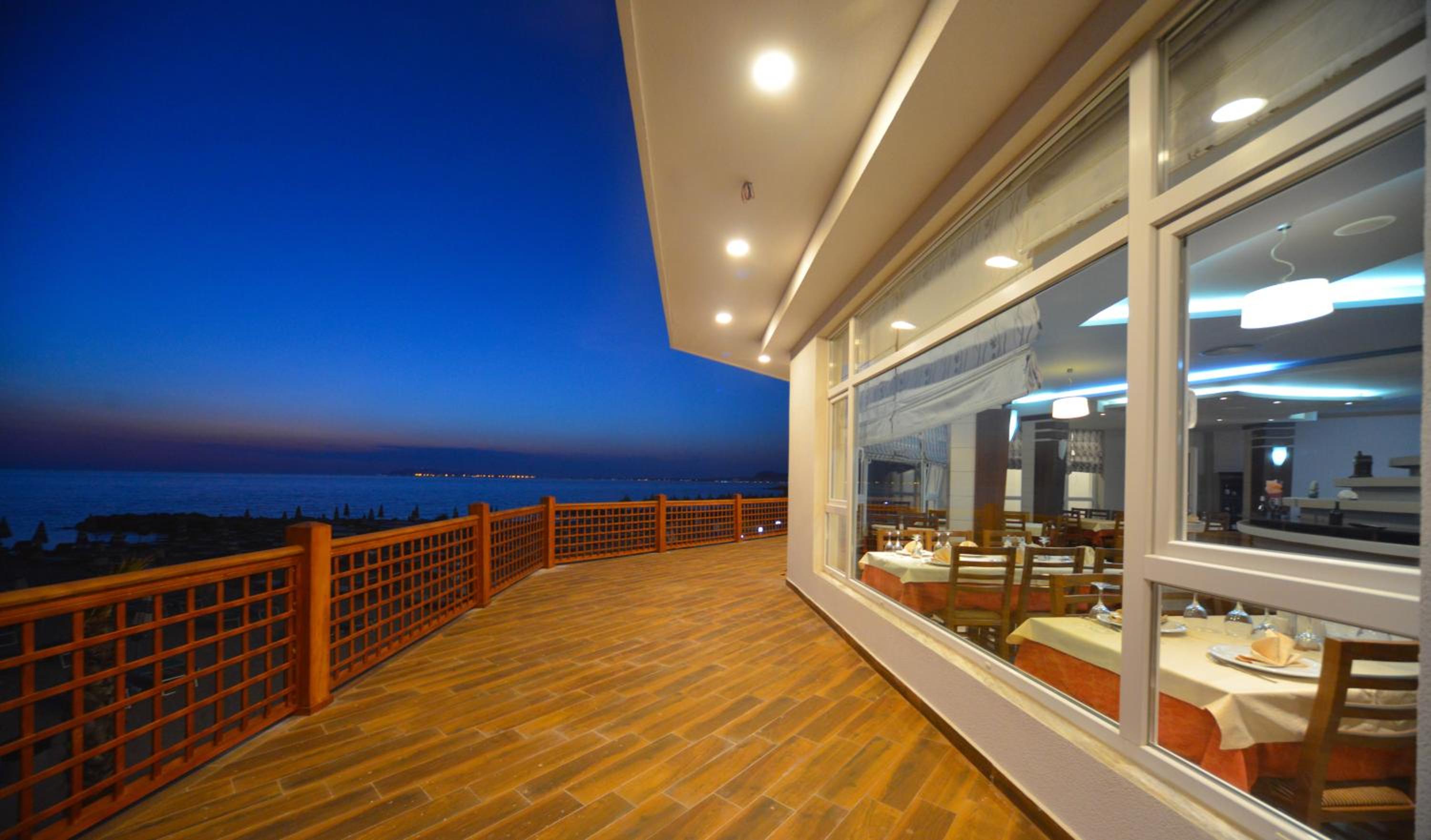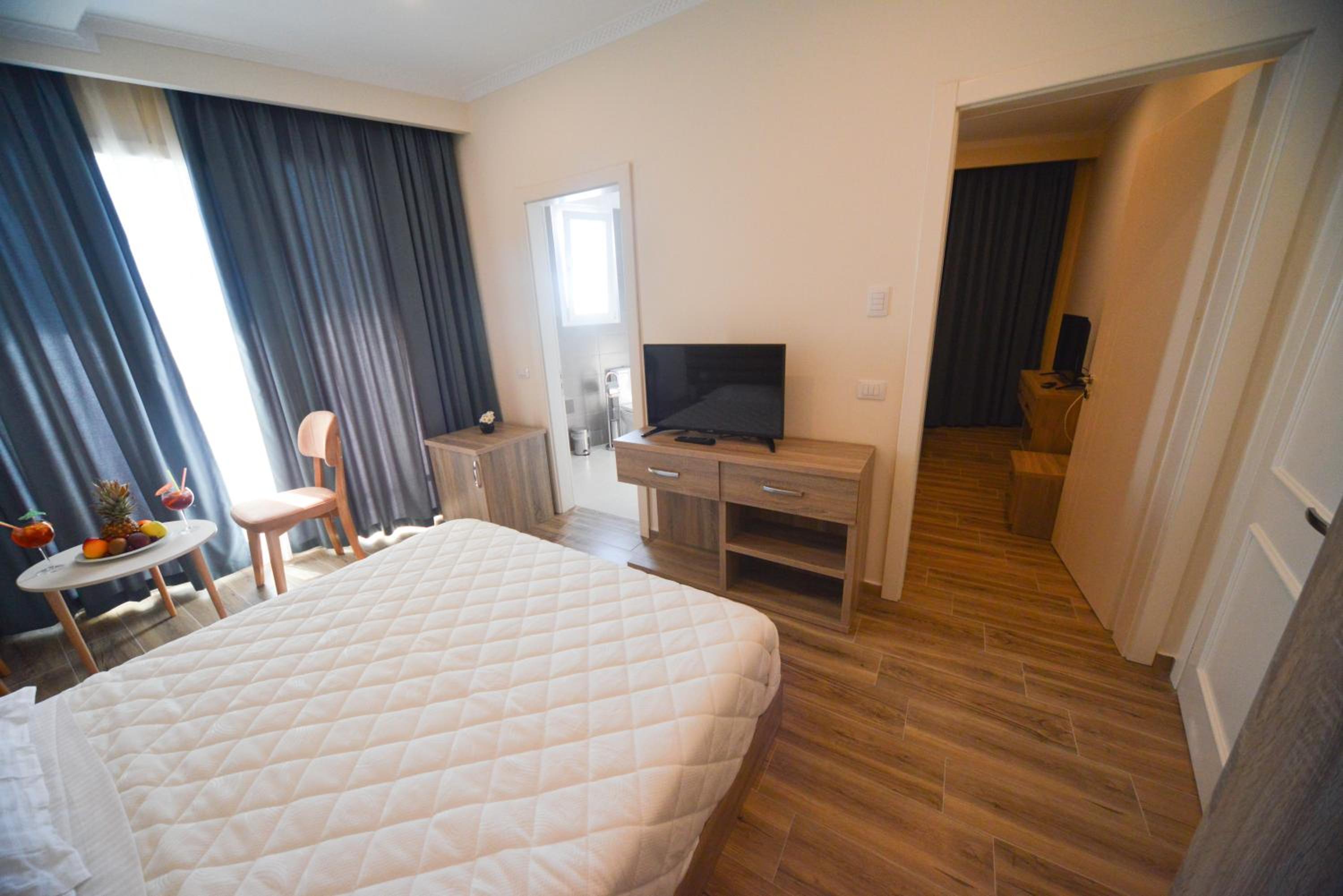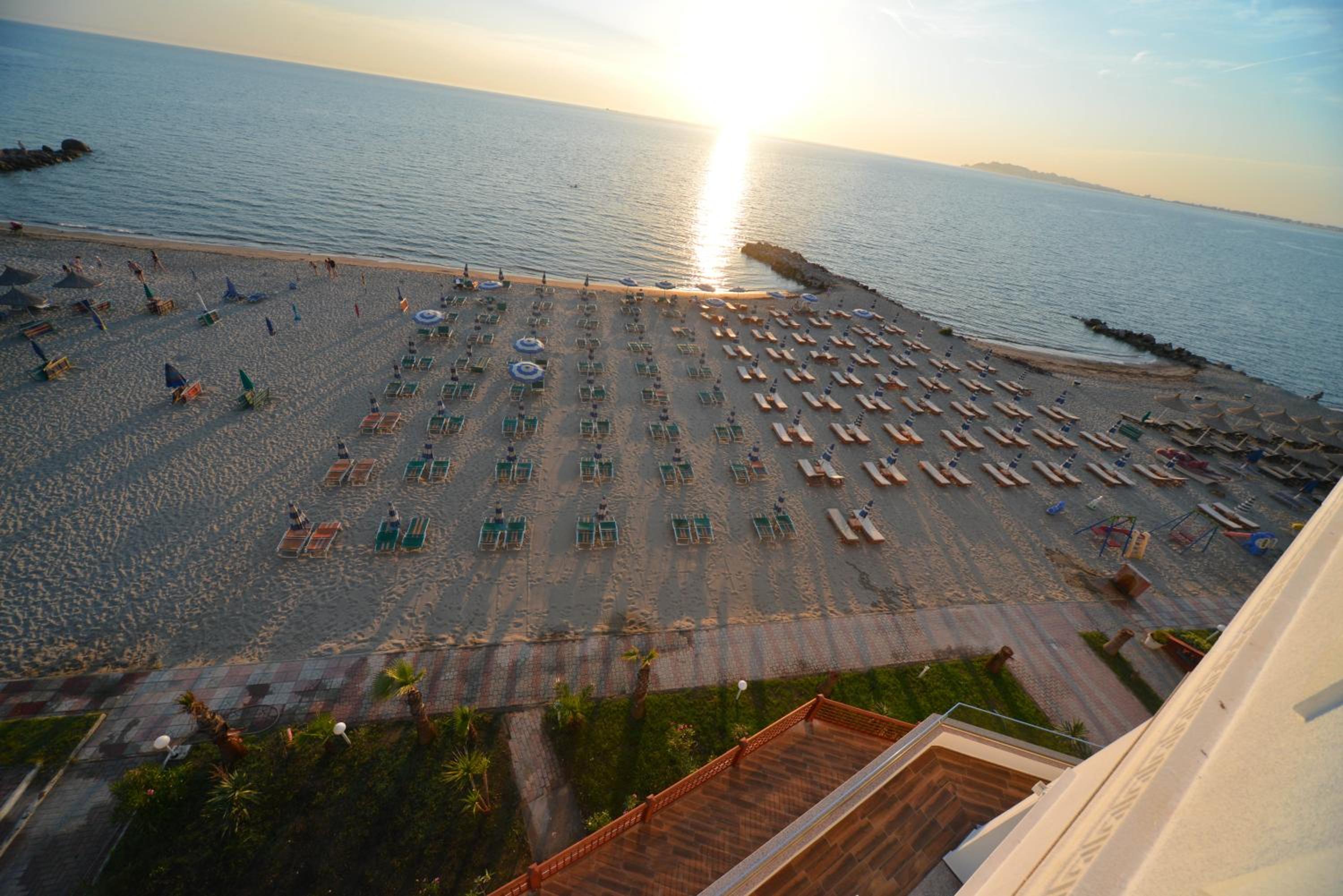 The hotel is right on the beach. I had a room with balcony to the pool and the sea. Beautiful view and the roar of the sea... Very good breakfast including local food. Buffet dinner is available with a nice variety of food. Very polite and very nice young waiter helped me choose a bottle of wine from Albania. I recommend it.