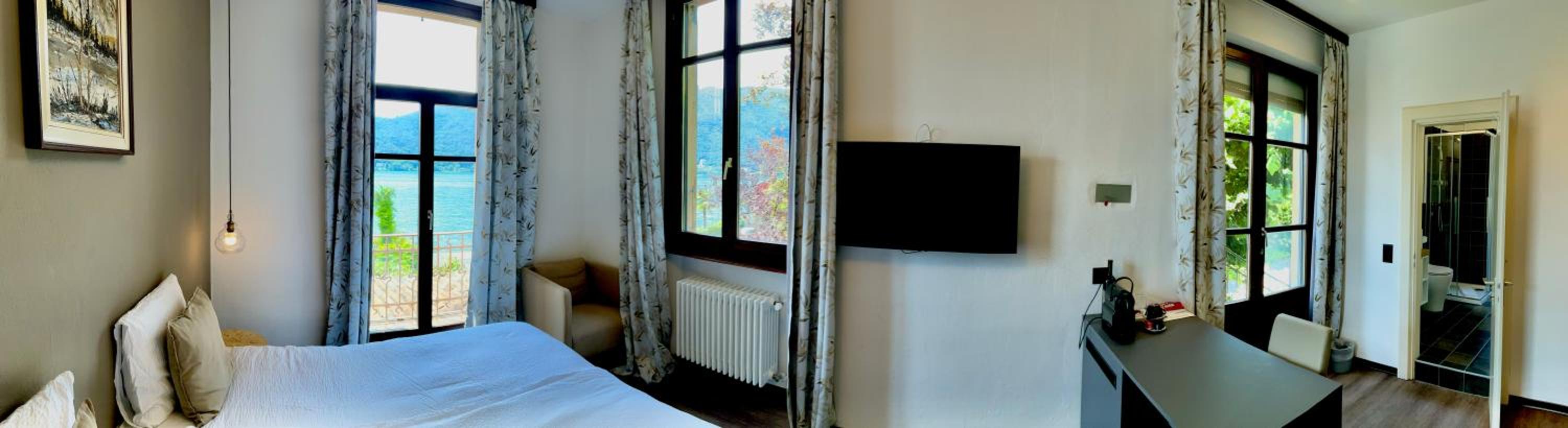 Sehr gutes Essen (super Crépe Suzette) und sehr nettes Personal. Hübsches Zimmer mit Balkon. Schöne Lage am See.