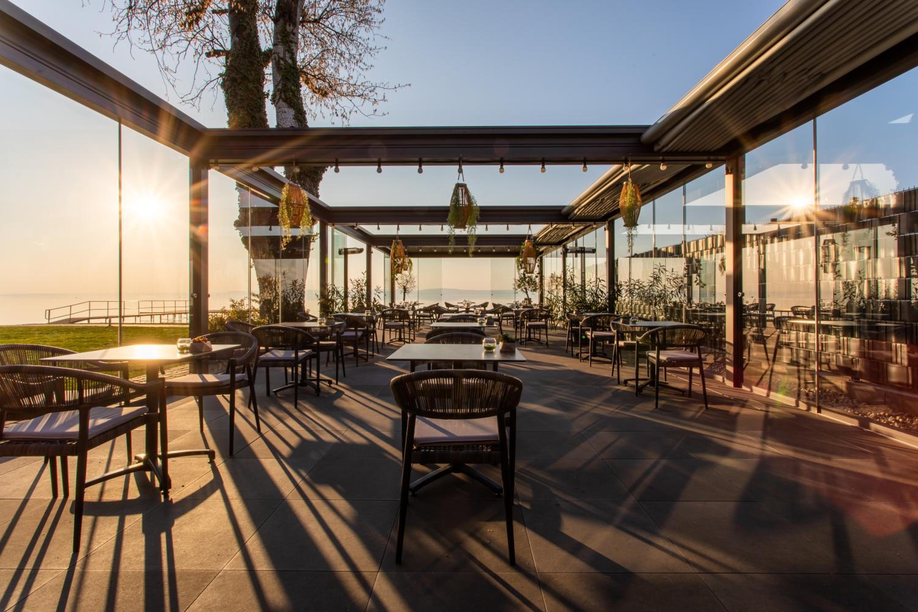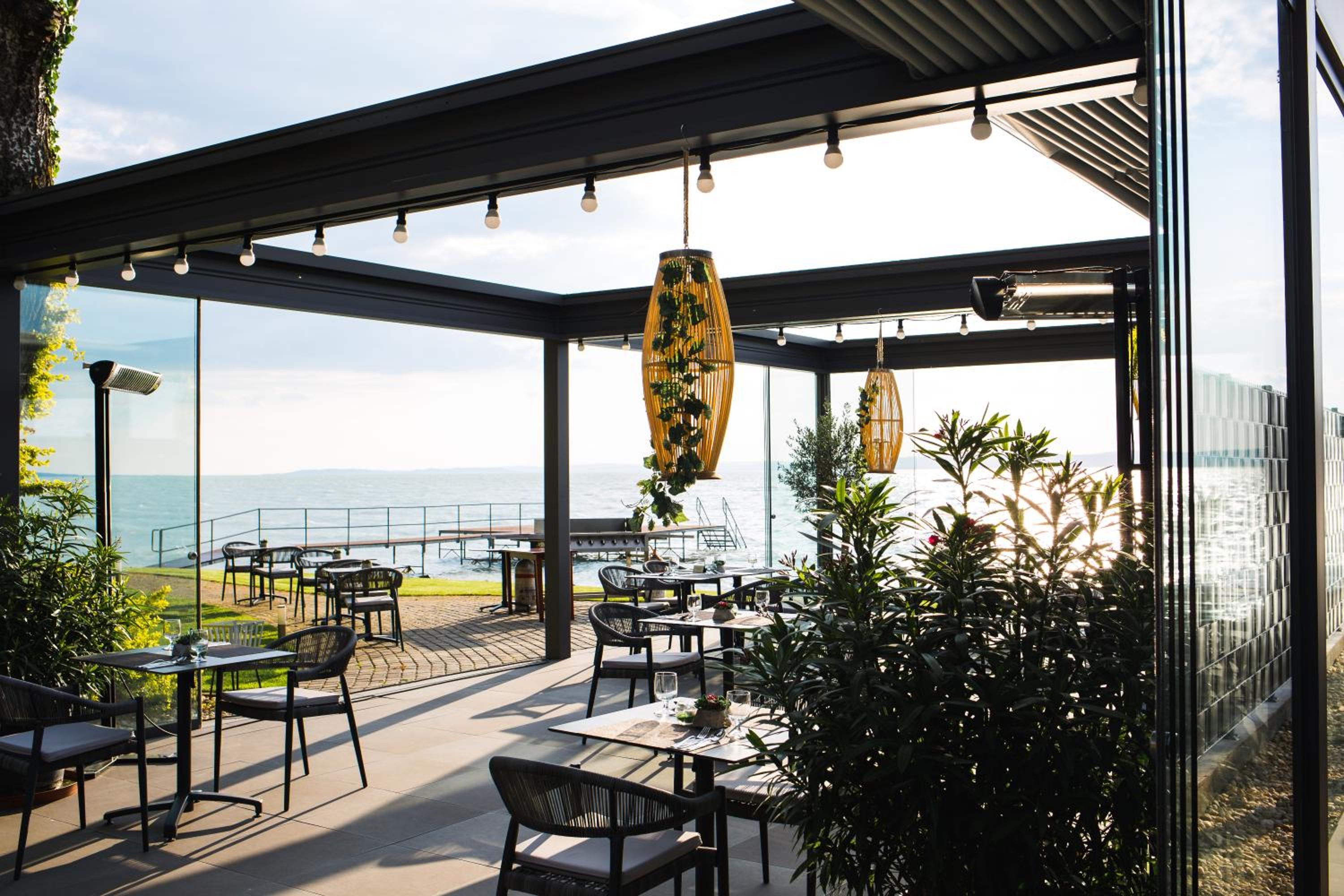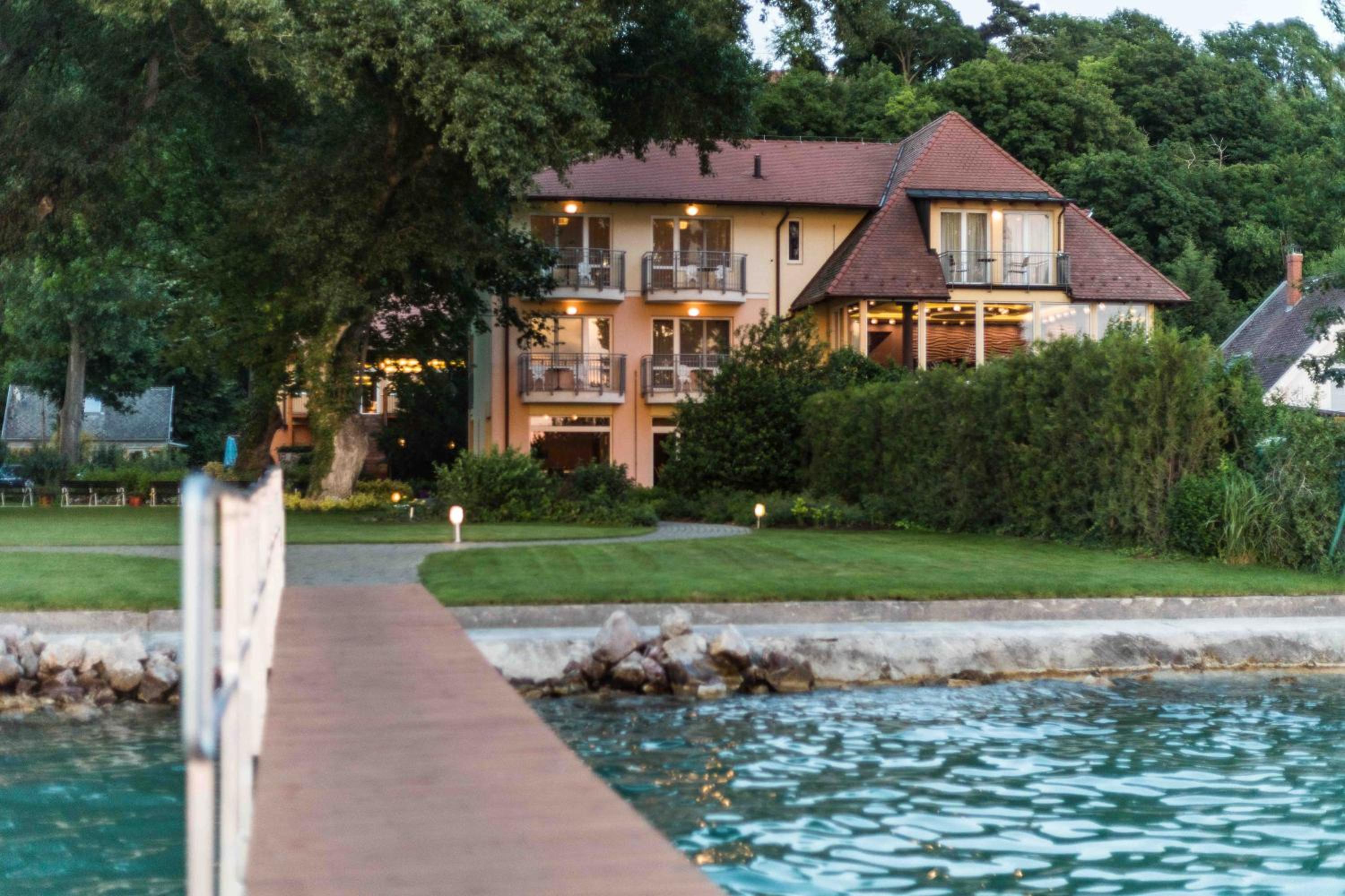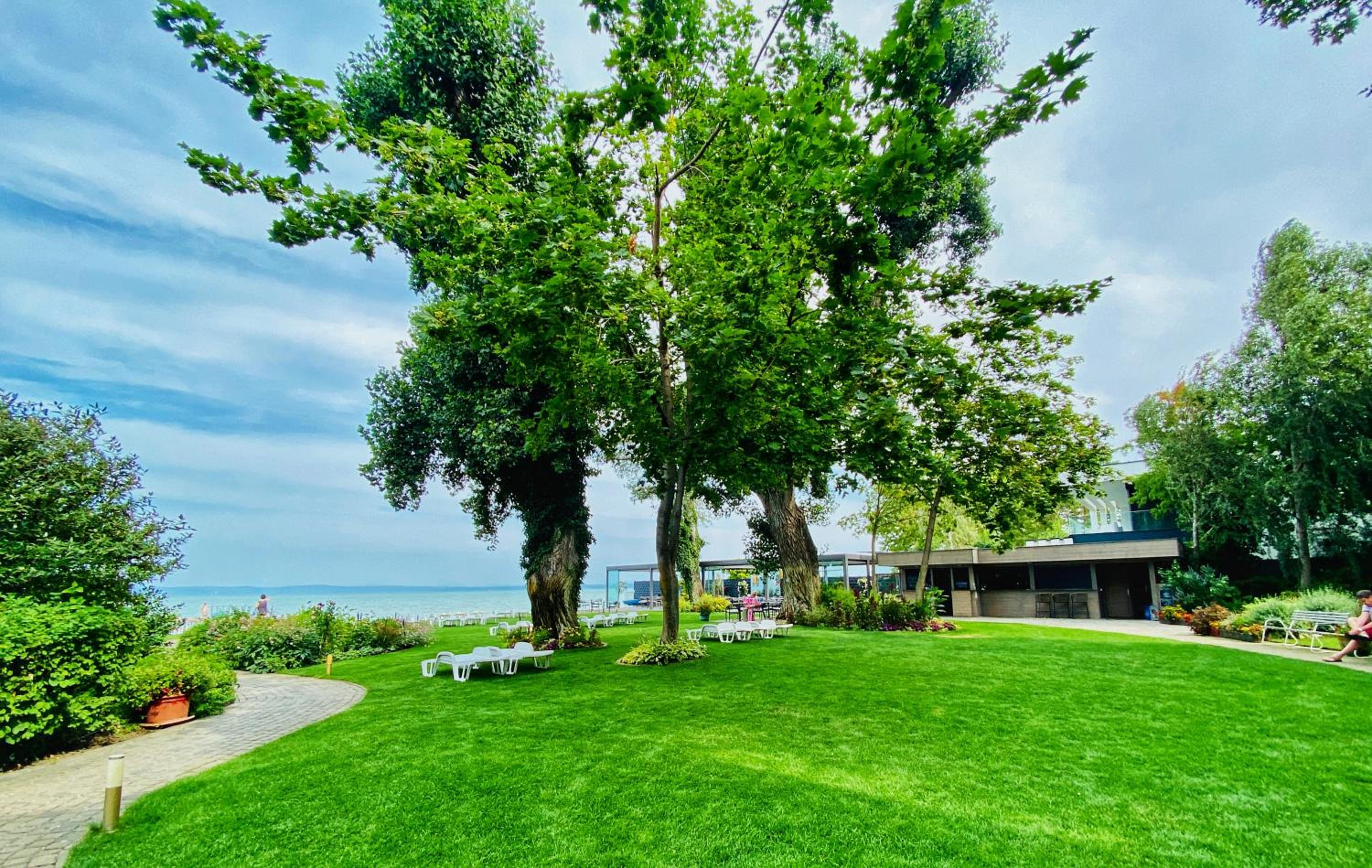 Very beautiful place, nature, flowerbeds, good restaurant on the territory with delicious dishes. Sun loungers on the lawn with a view of Balaton. The hotel has a Maine Coon cat). The room is small, but clean, comfortable bed. Quiet. There is a lift to the upper floors. The room has air conditioning.