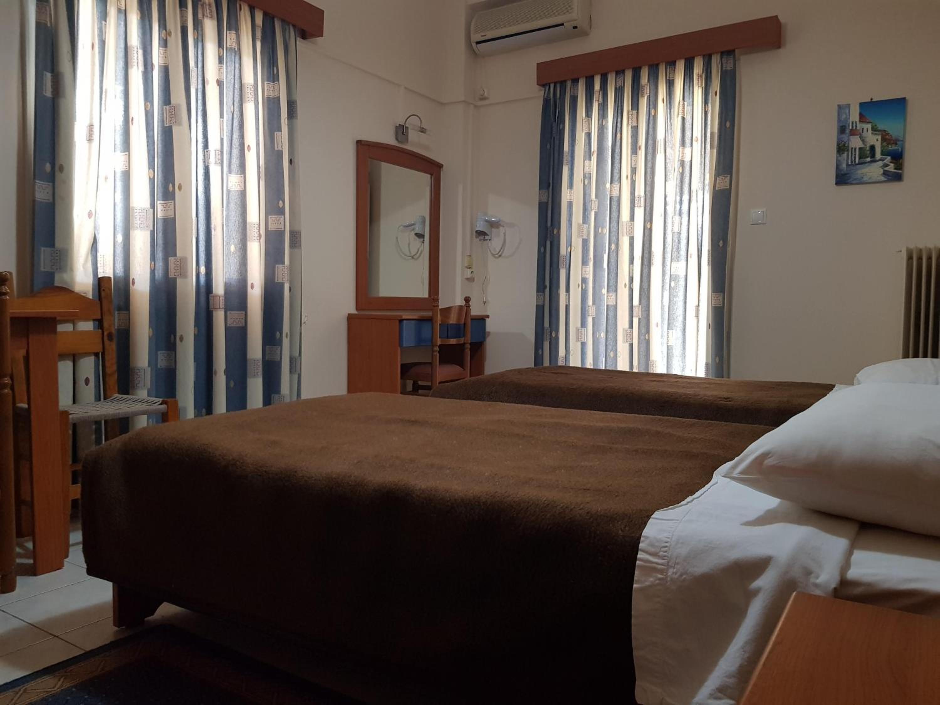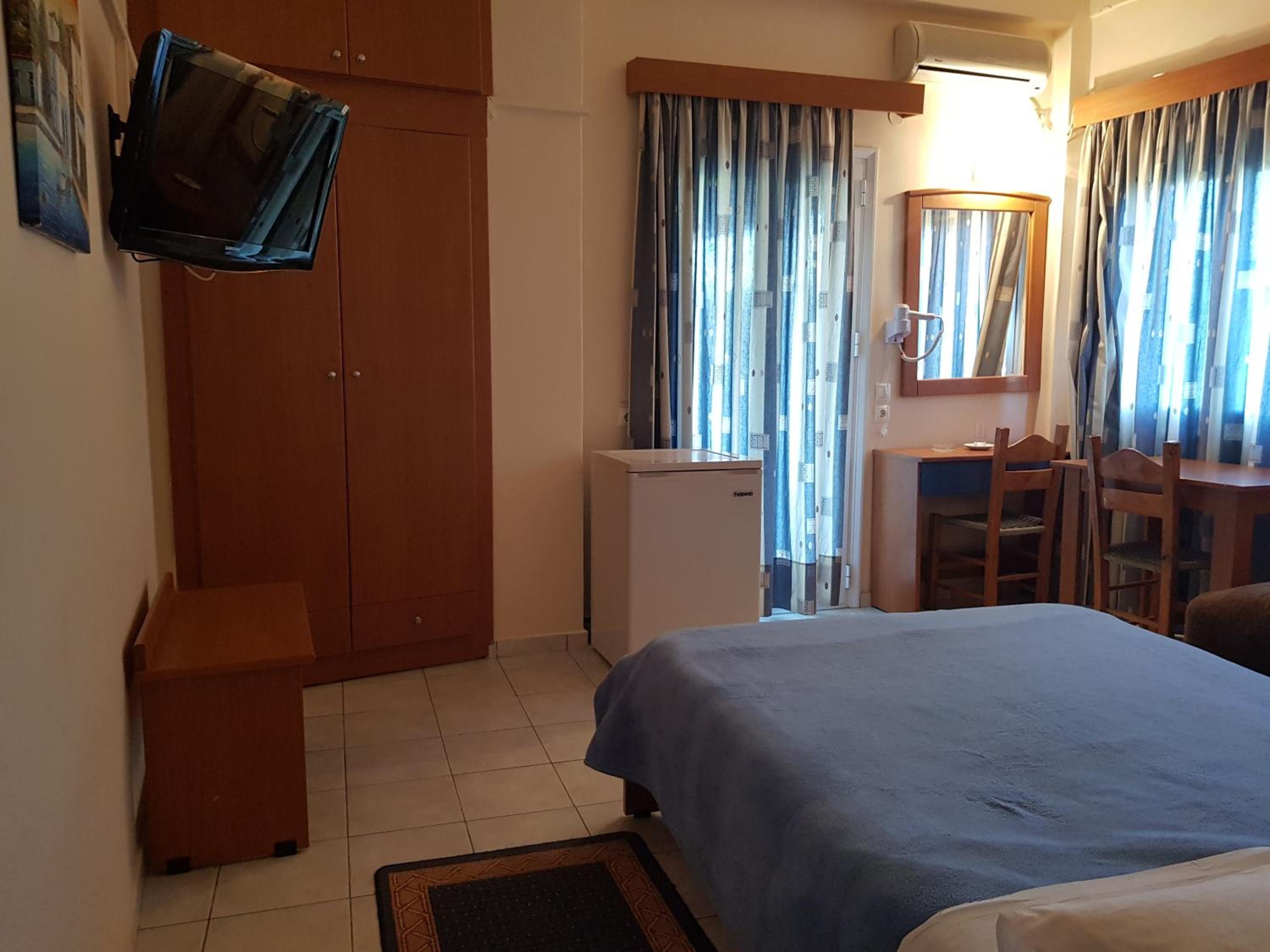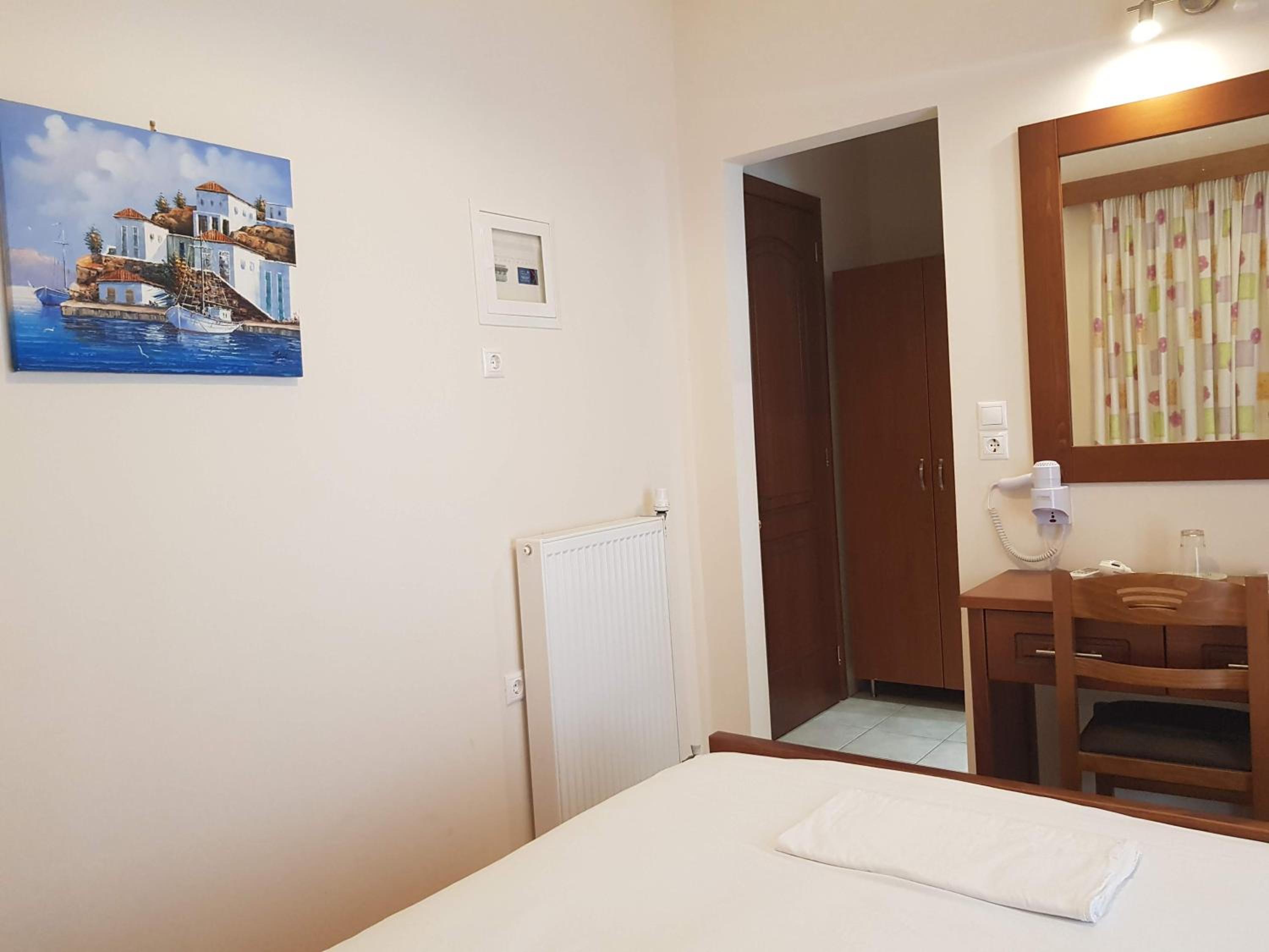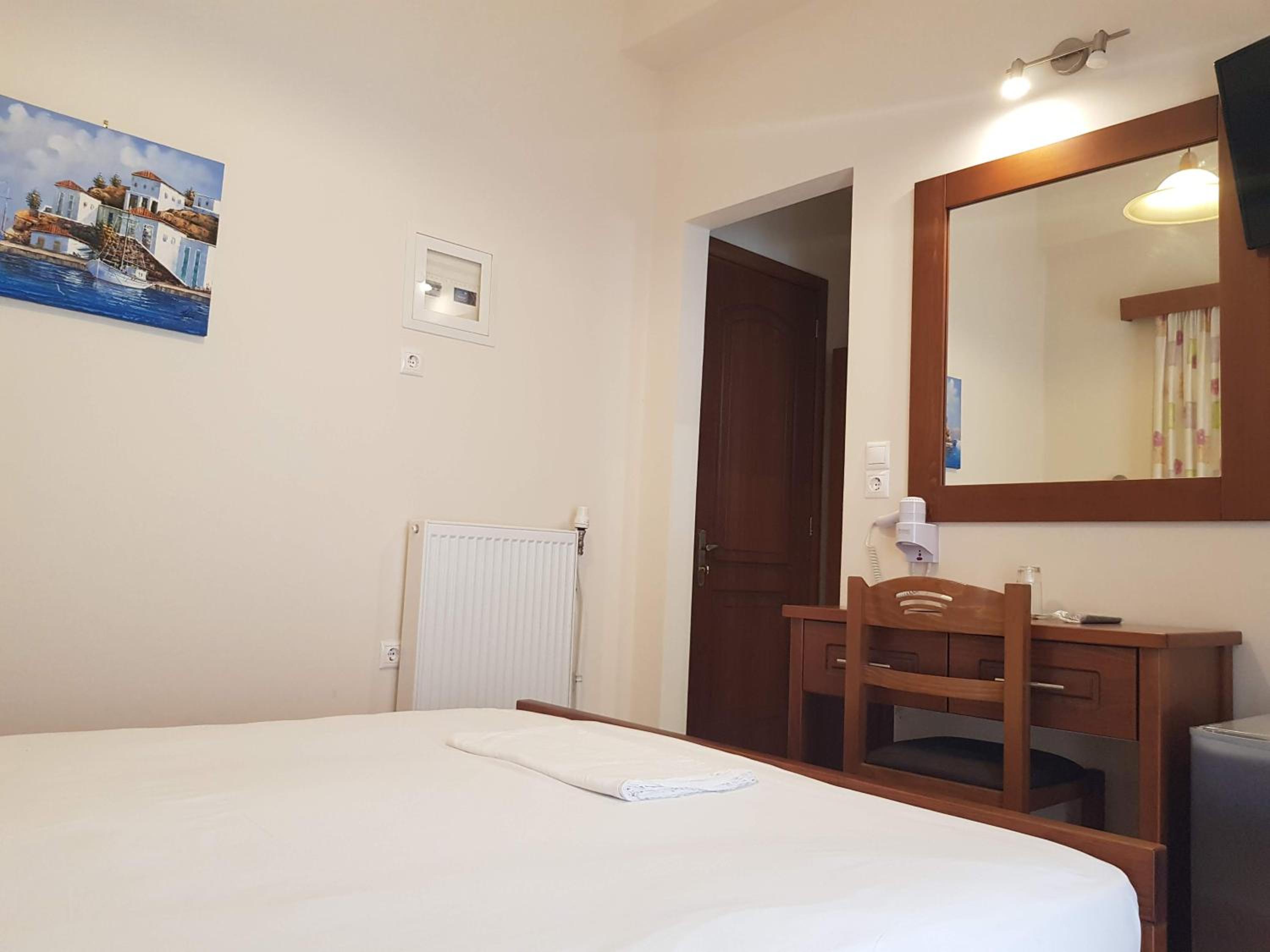 Great location next to port. 2 minute walk to a nice beach and a few tavernas and markets. Nice clean room. Plenty of free parking in front. Friendly family run hotel.