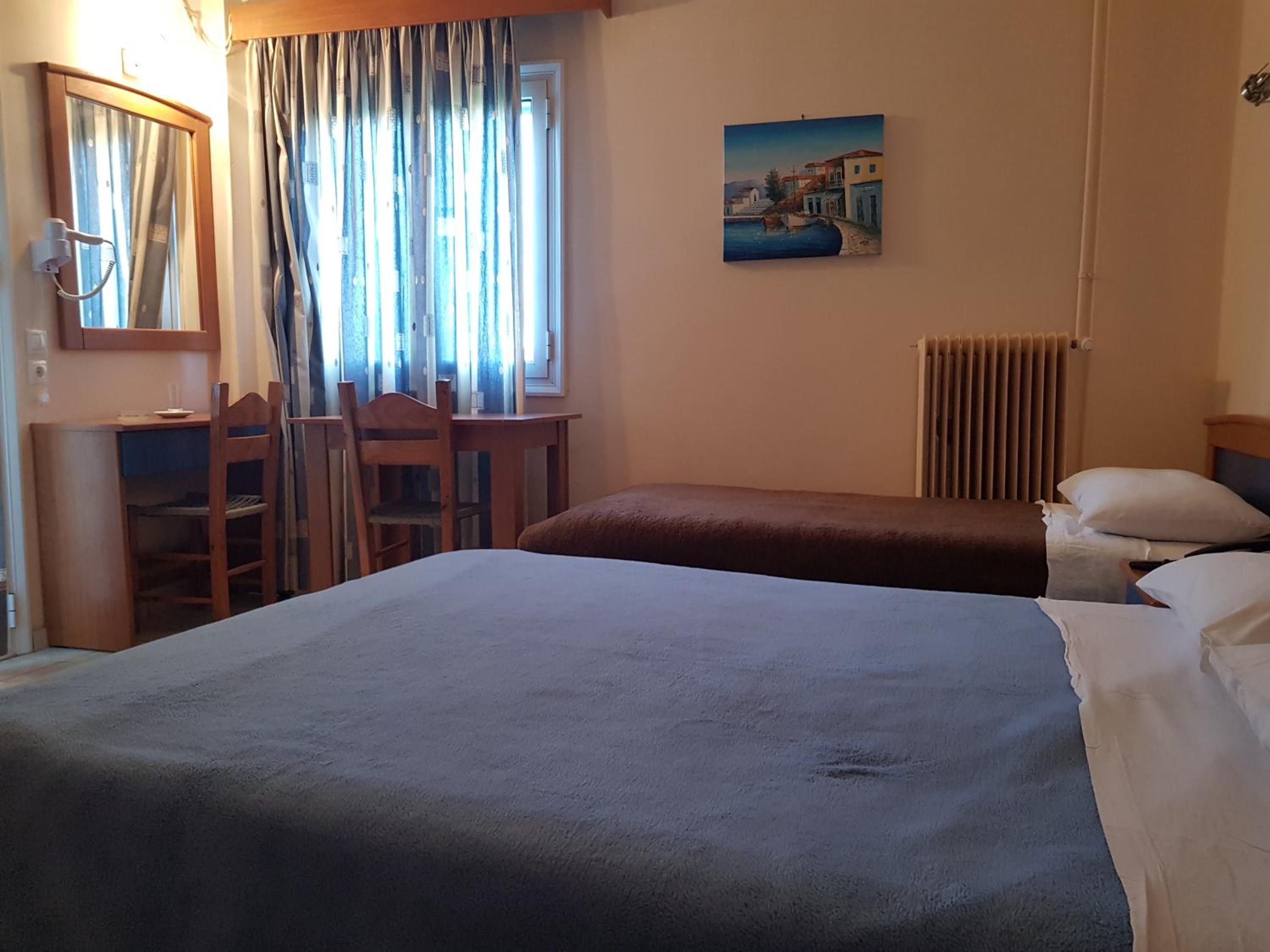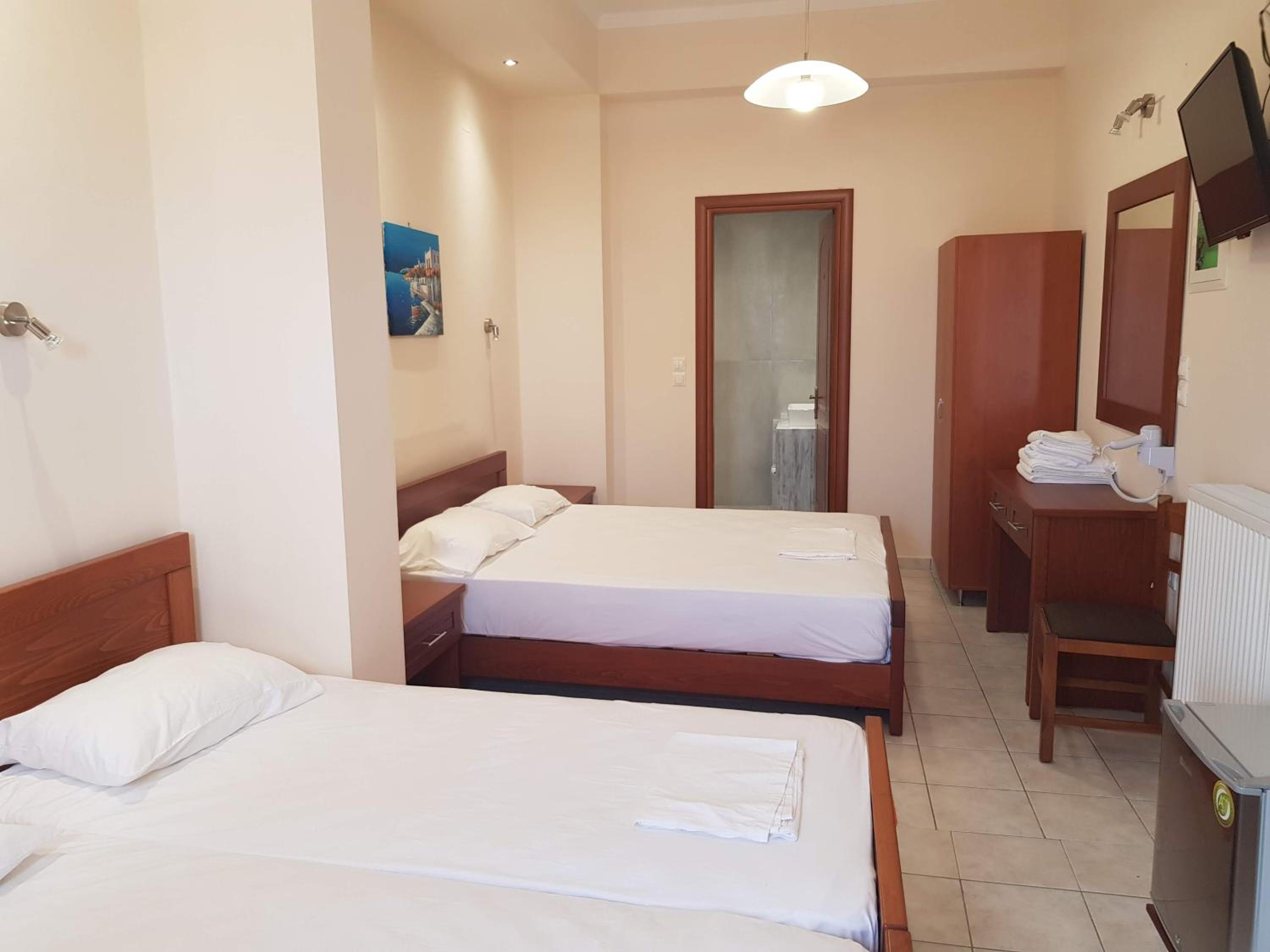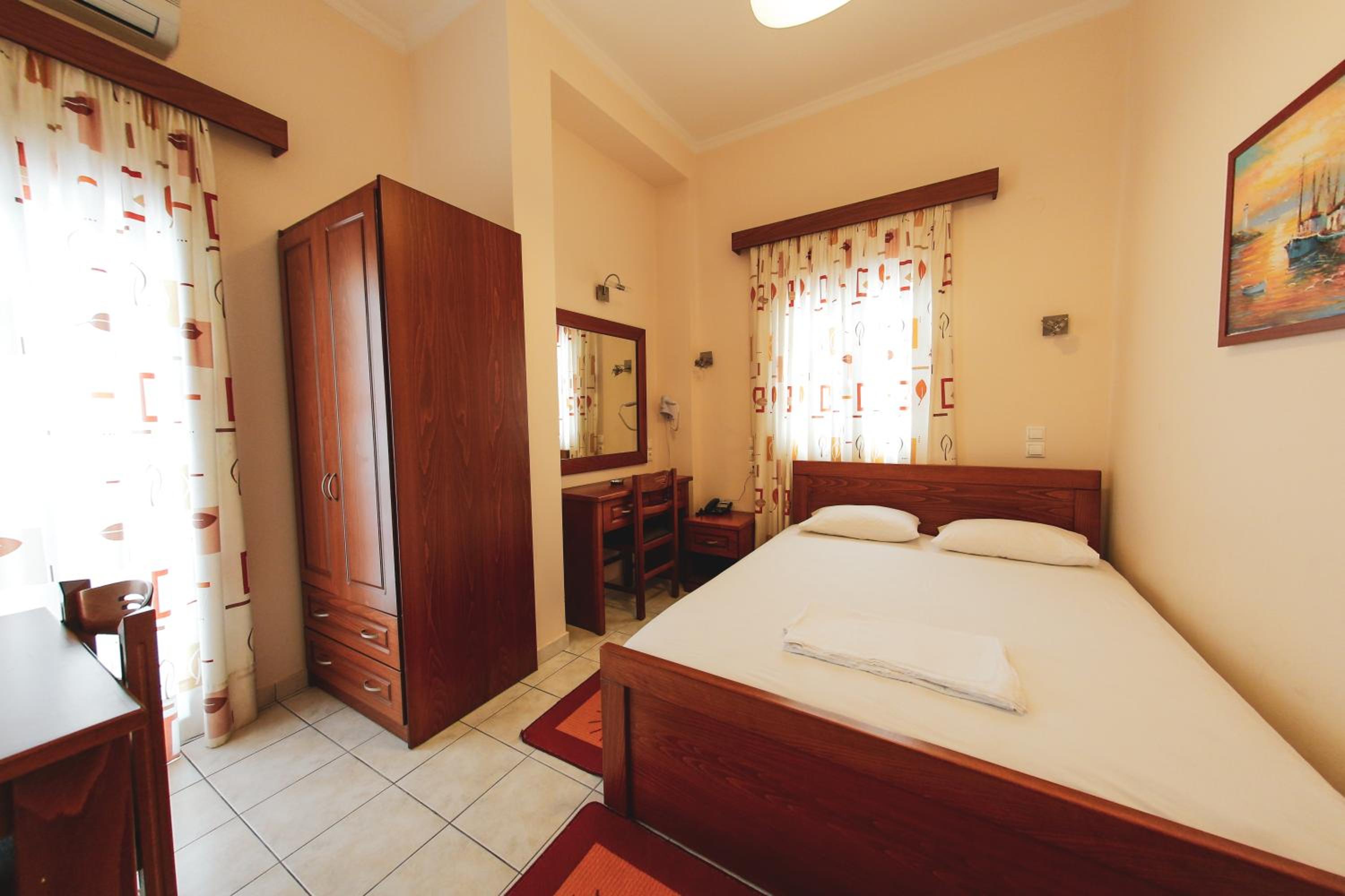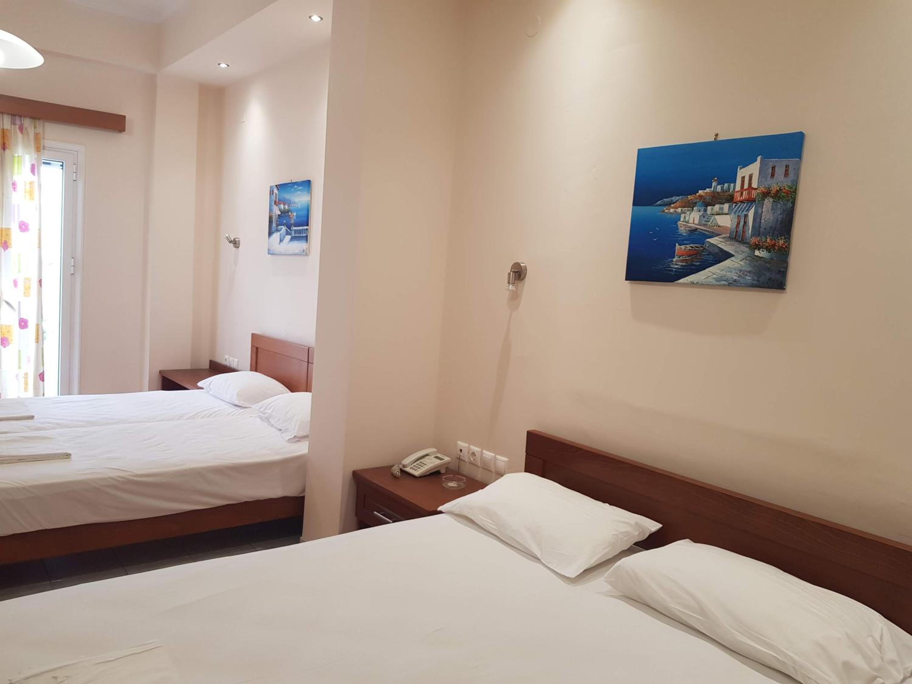 Great location next to port. 2 minute walk to a nice beach and a few tavernas and markets. Nice clean room. Plenty of free parking in front. Friendly family run hotel.