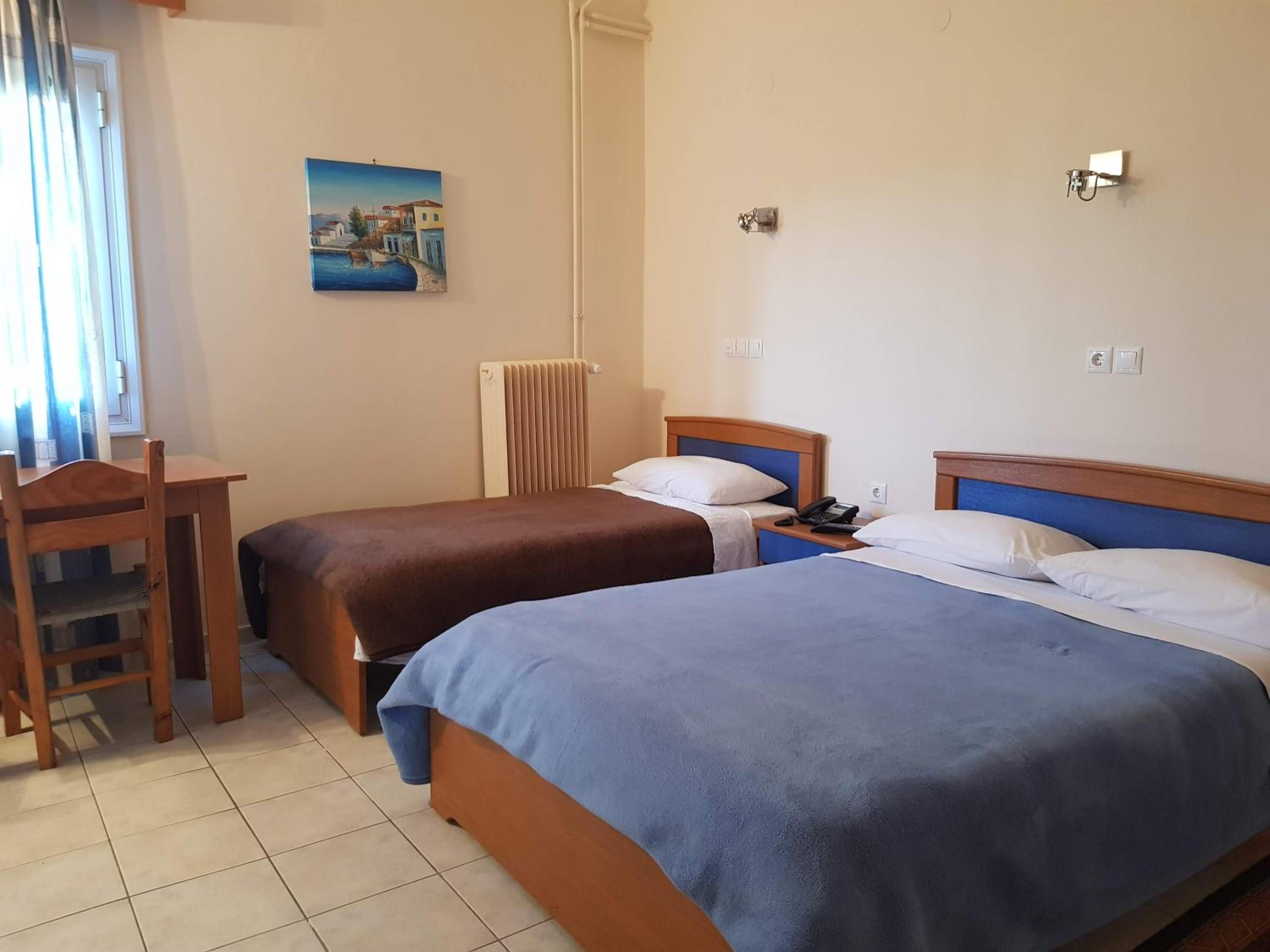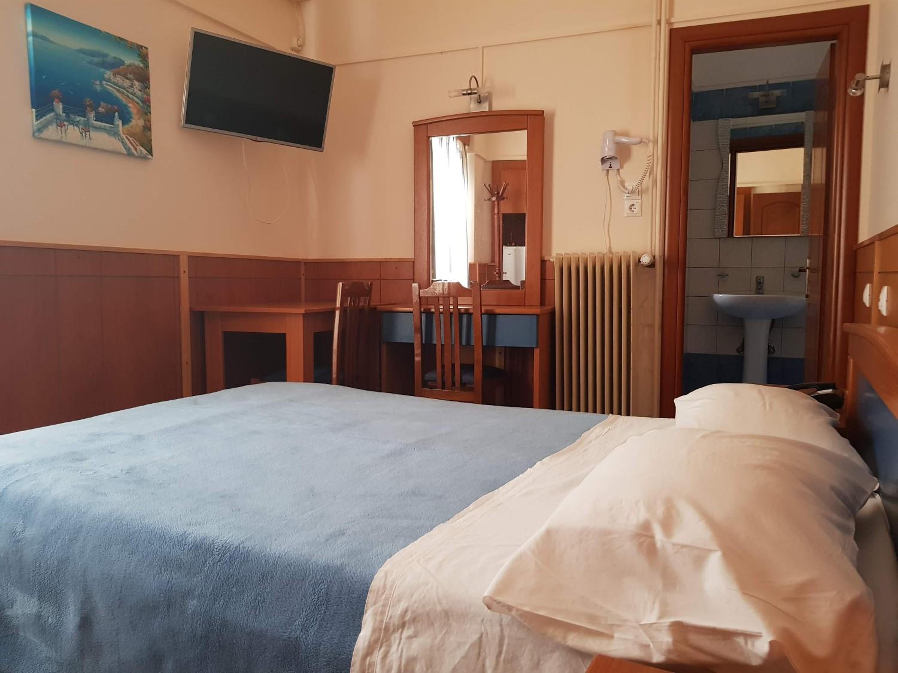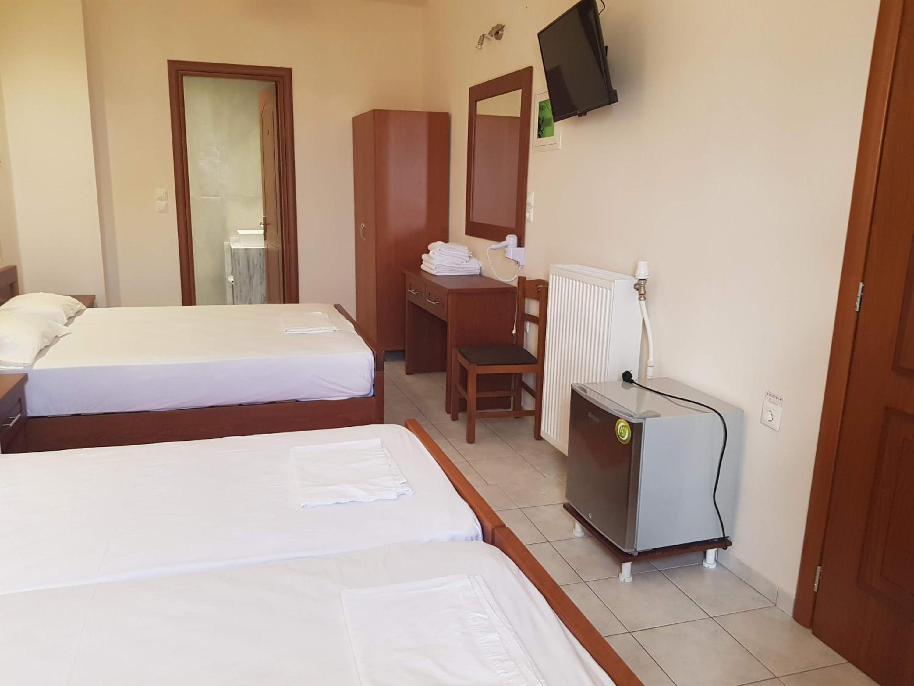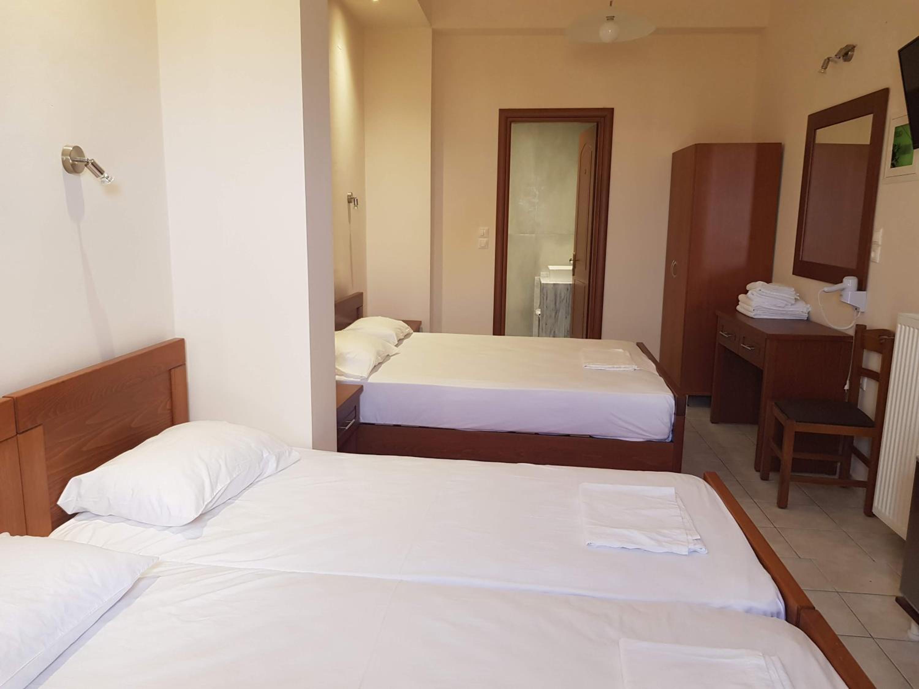 Great location next to port. 2 minute walk to a nice beach and a few tavernas and markets. Nice clean room. Plenty of free parking in front. Friendly family run hotel.