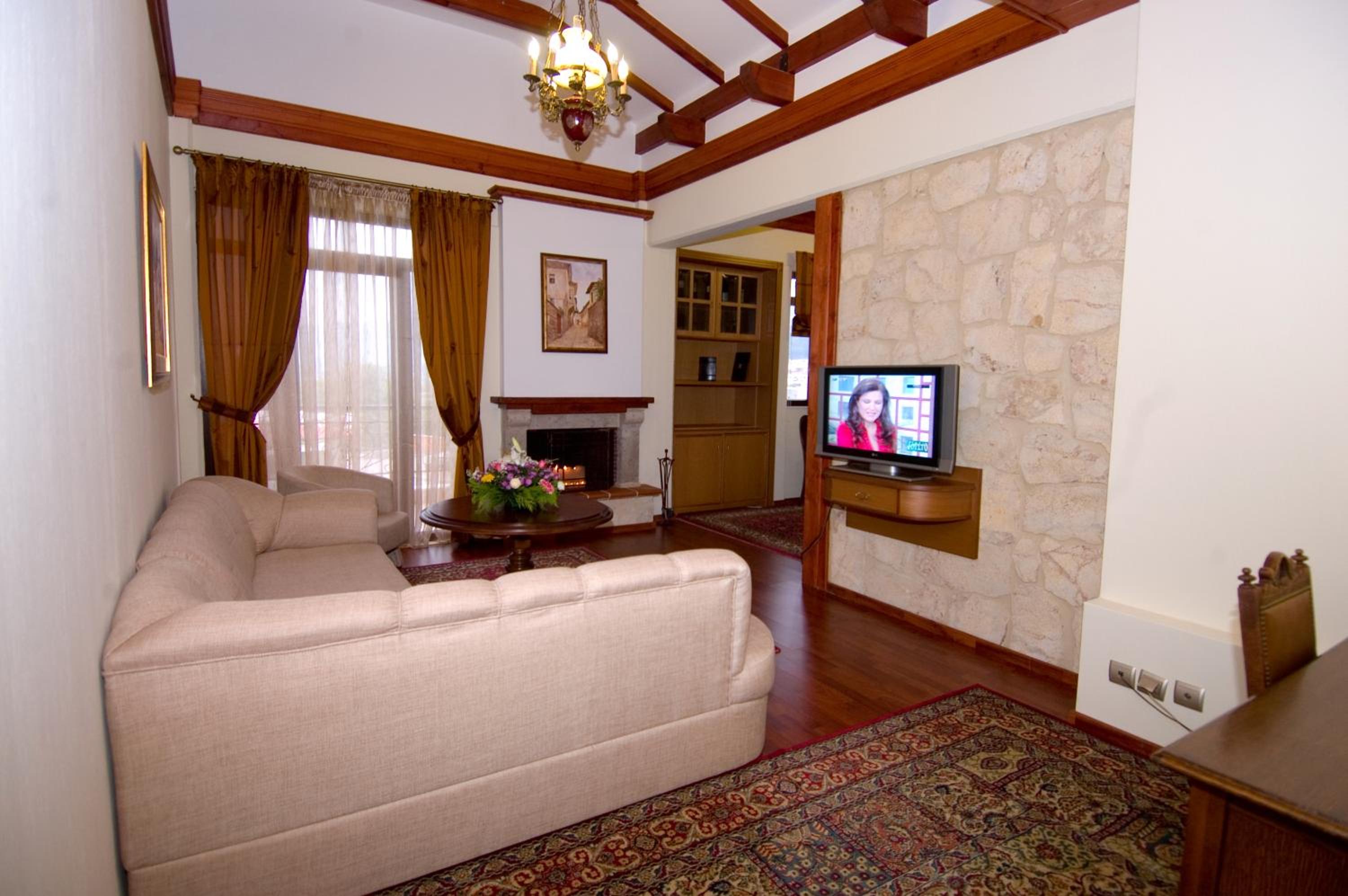 Experience comfort and style in our air-conditioned rooms at Aiges Melathron. Admire the modern wood furnishings and relax on the patios with stunning countryside views. Enjoy the convenience of satellite TV and a private bathroom in every room, with some even featuring a cozy fireplace.