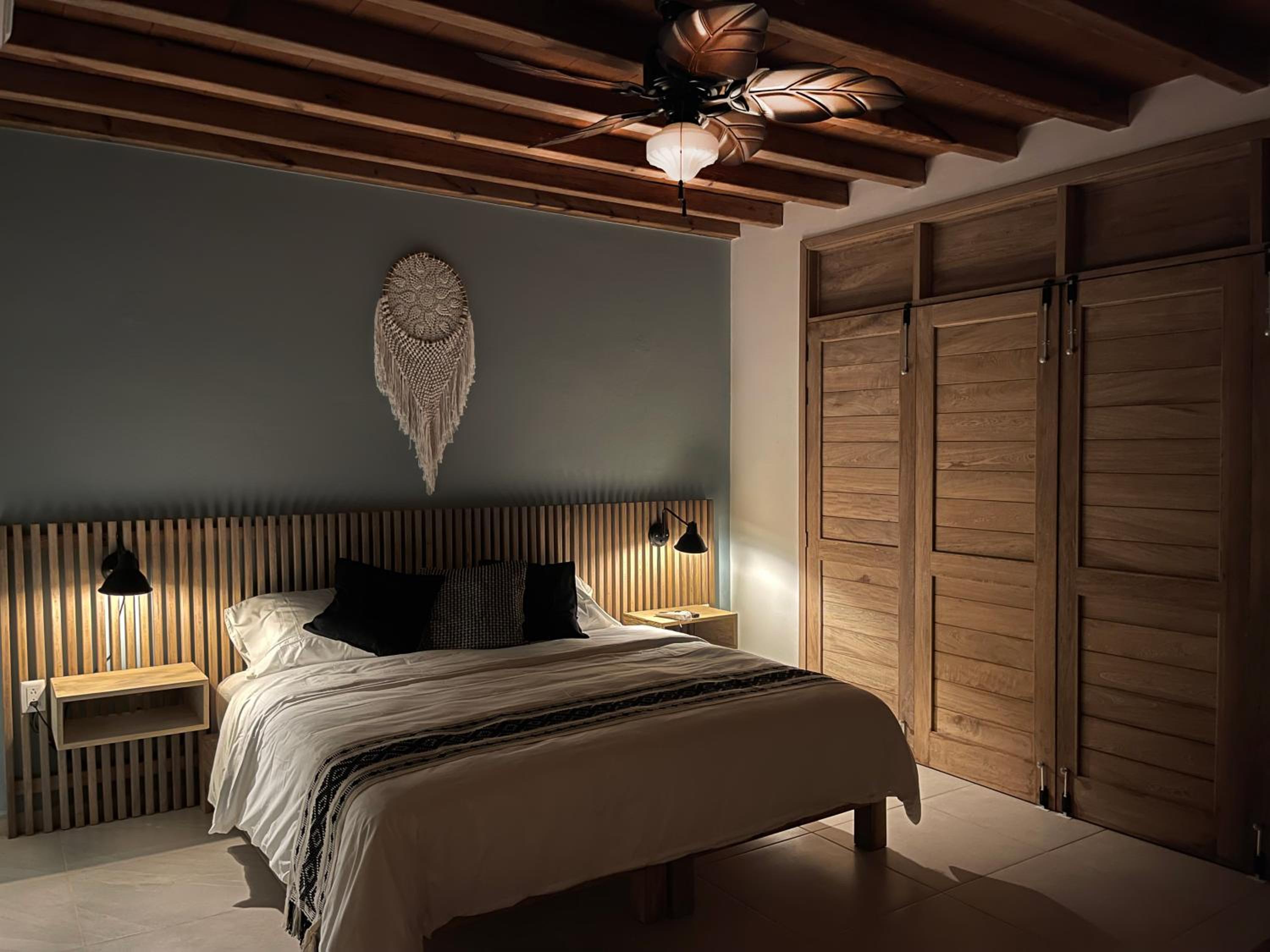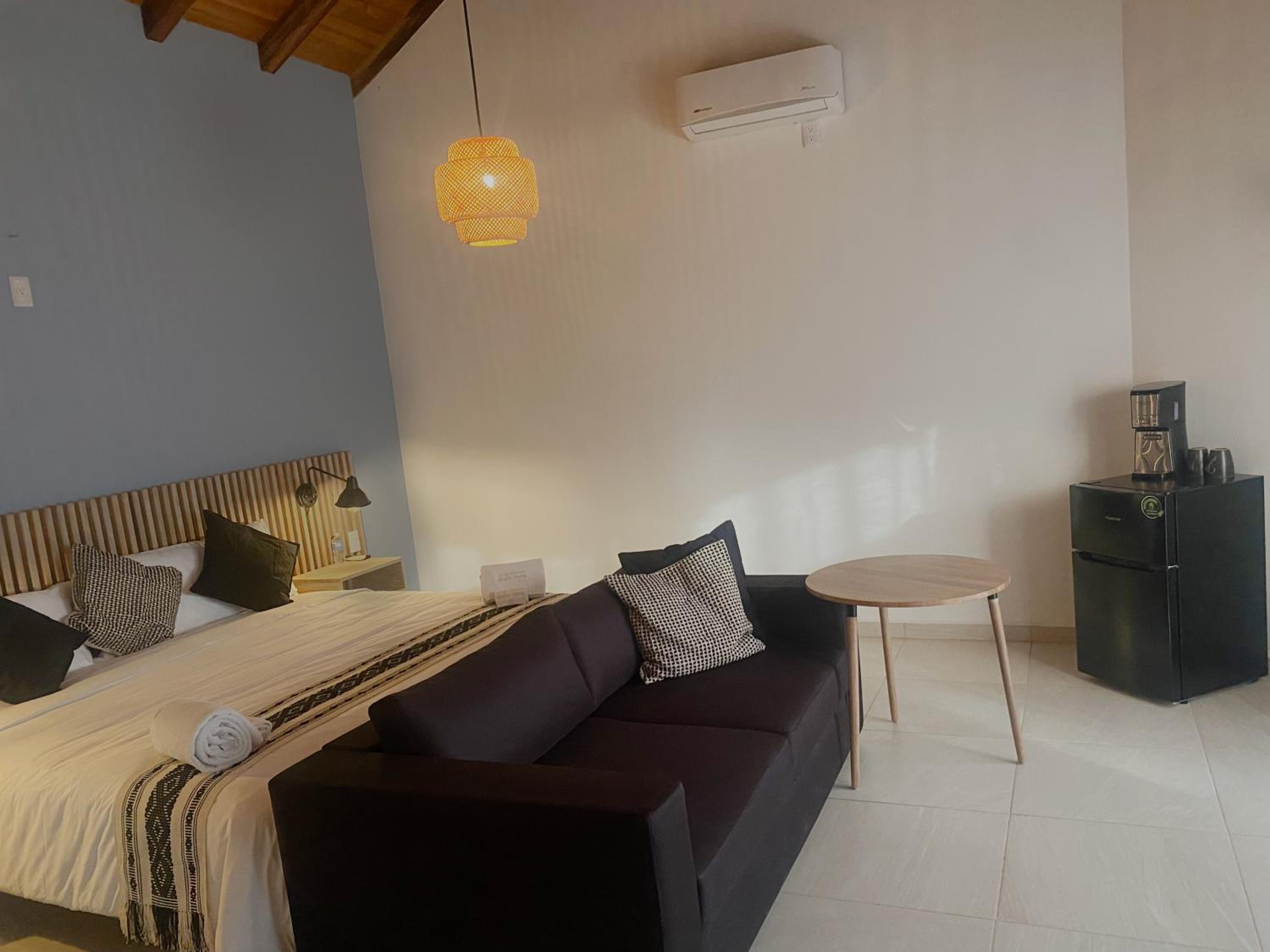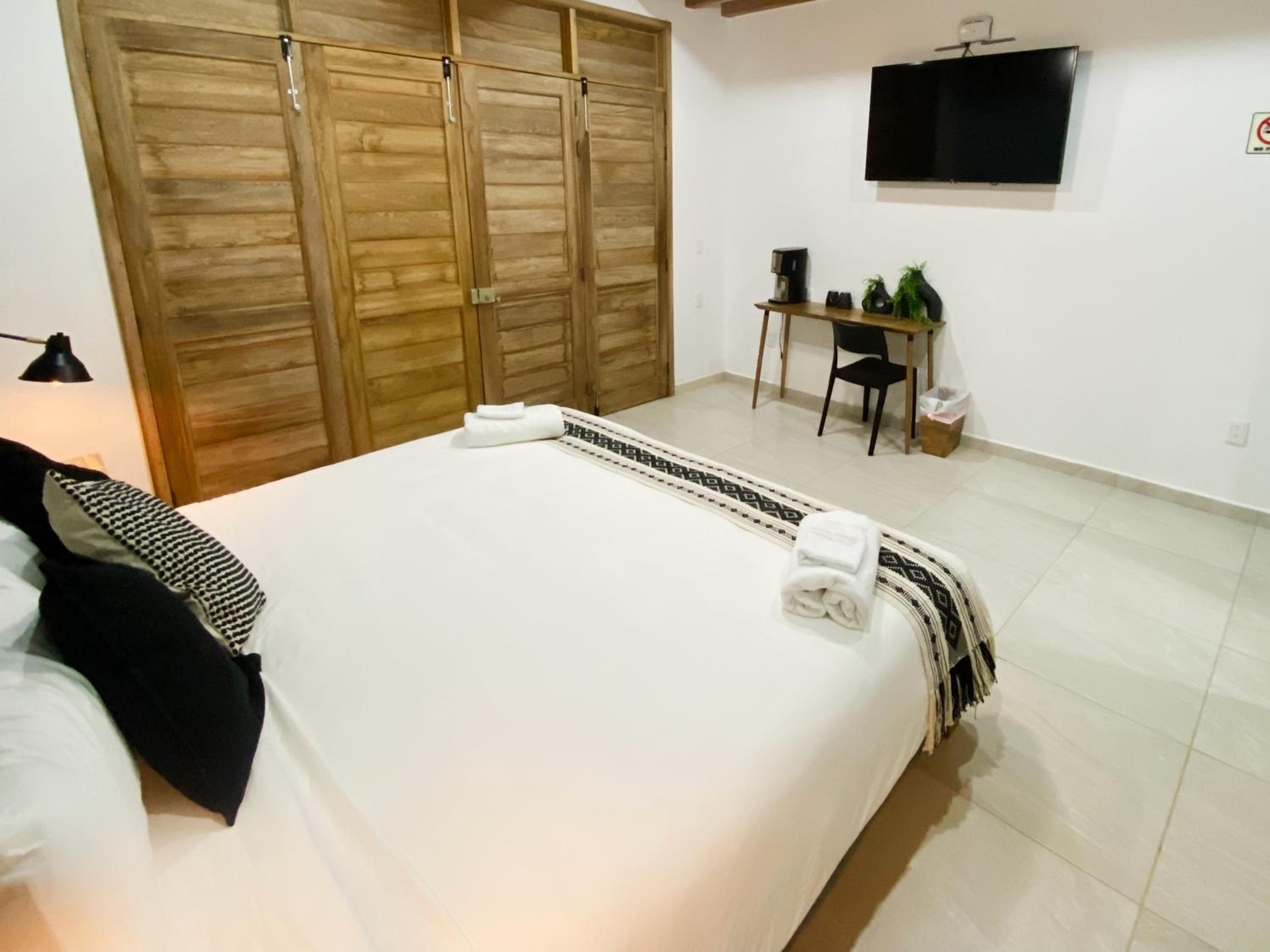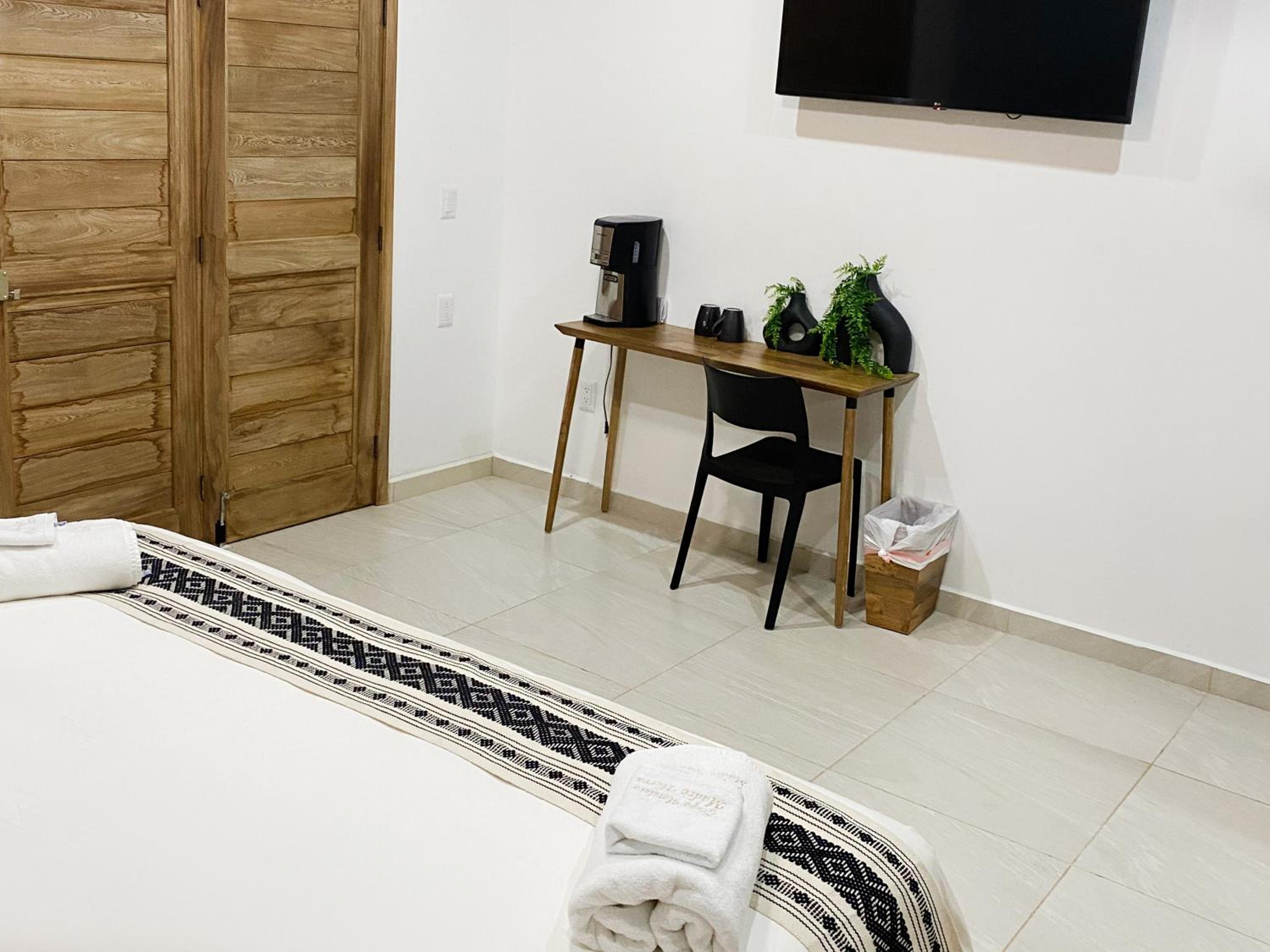 Tout ! La chambre tout en haut très grande , jolie déco moderne . Balcon avec grand hamac . Ventilo au plafond efficace , frigo , coffre fort , machine à café . Super propre et confortable . Juste la route à traverser pour aller à la plage. Une des plus belles chambres que nous avons eue au Mexique