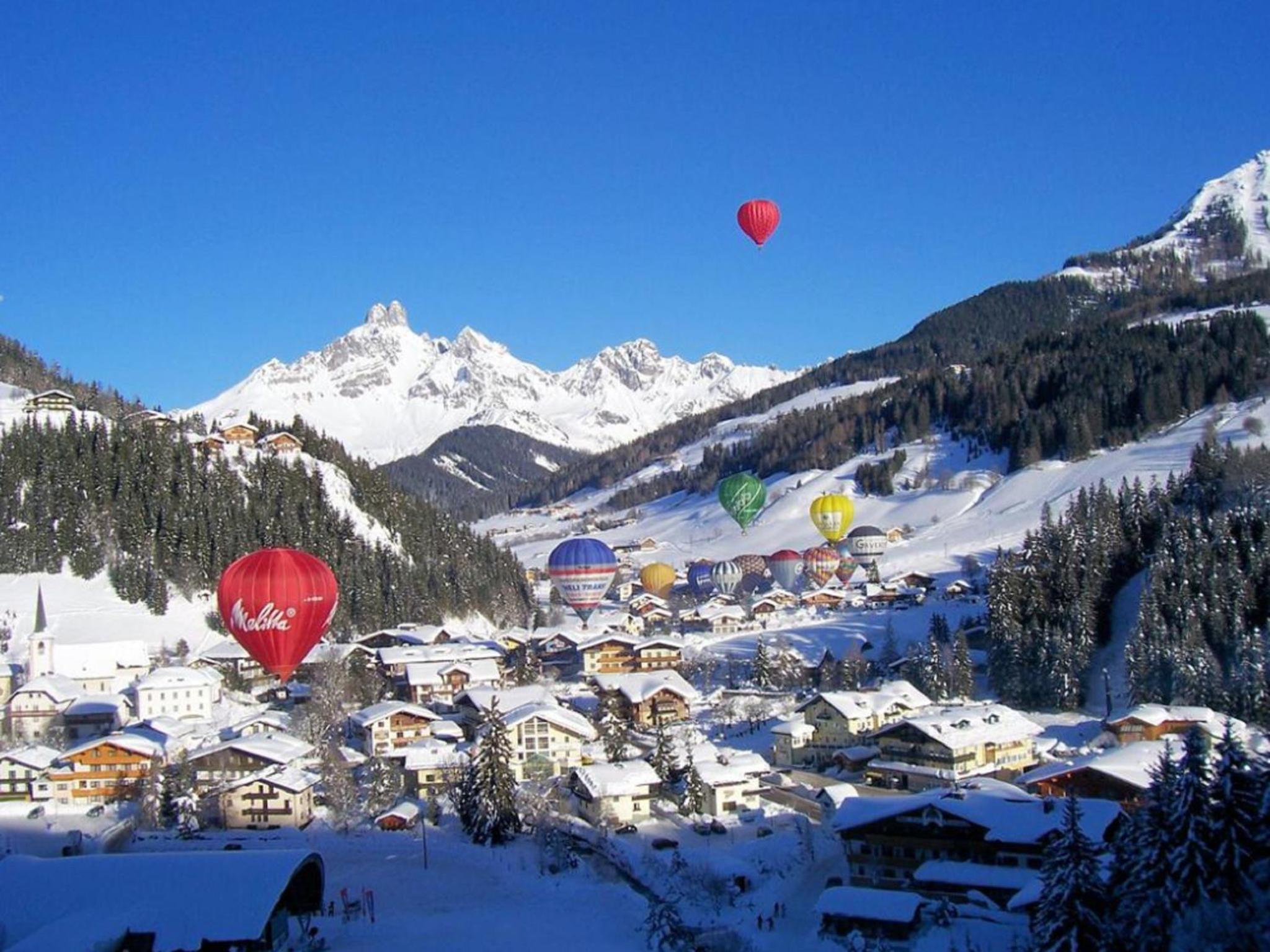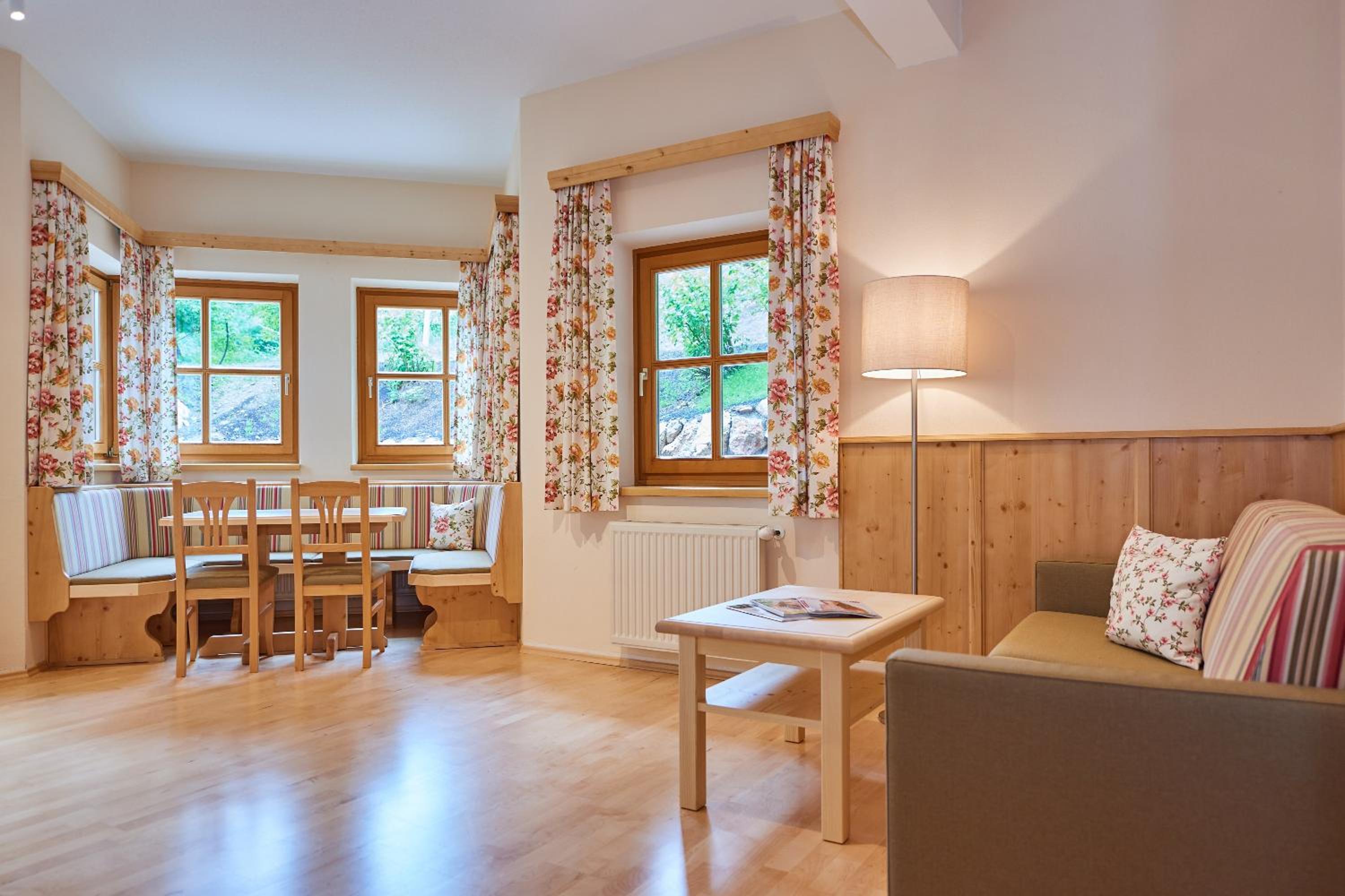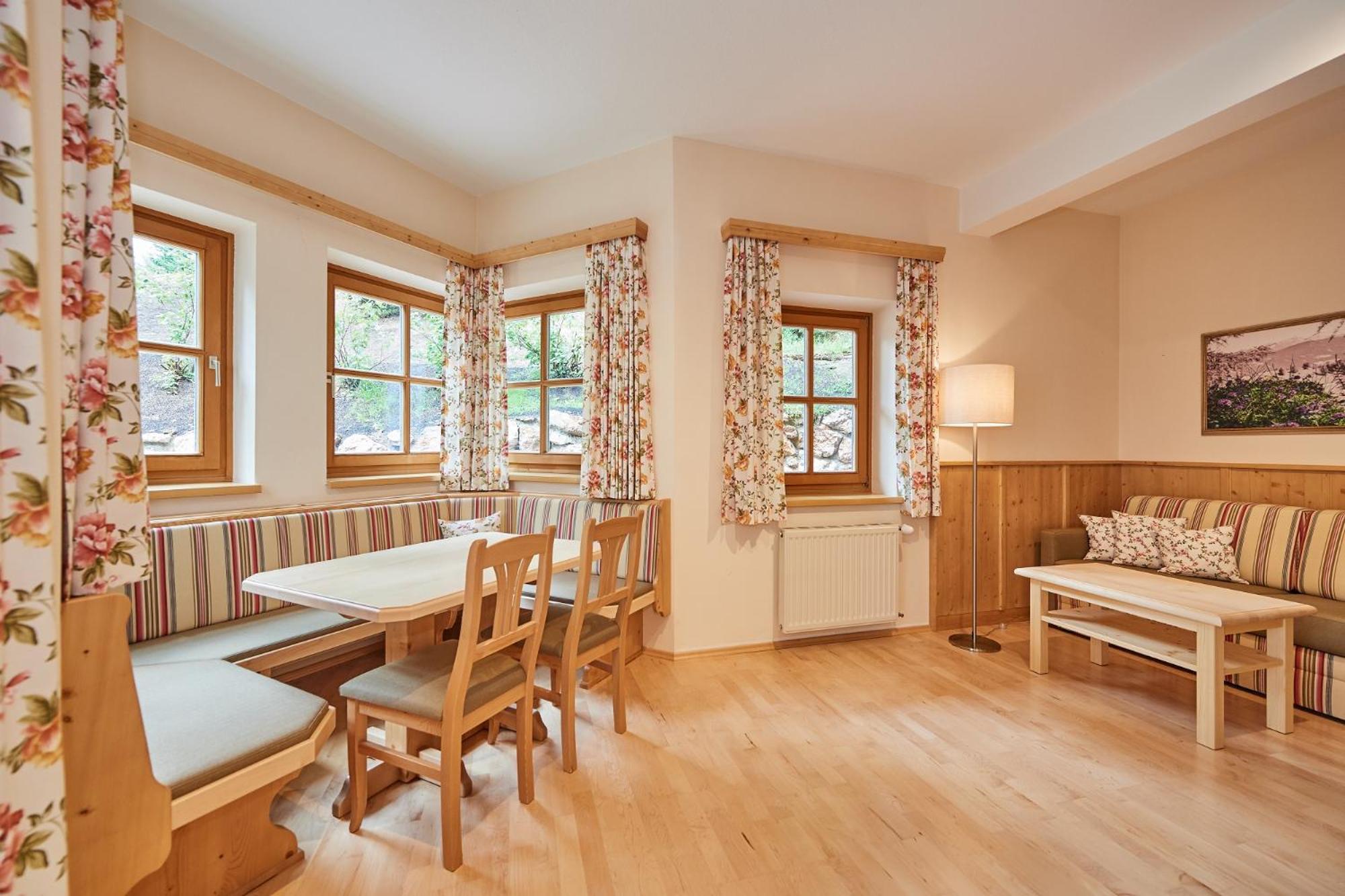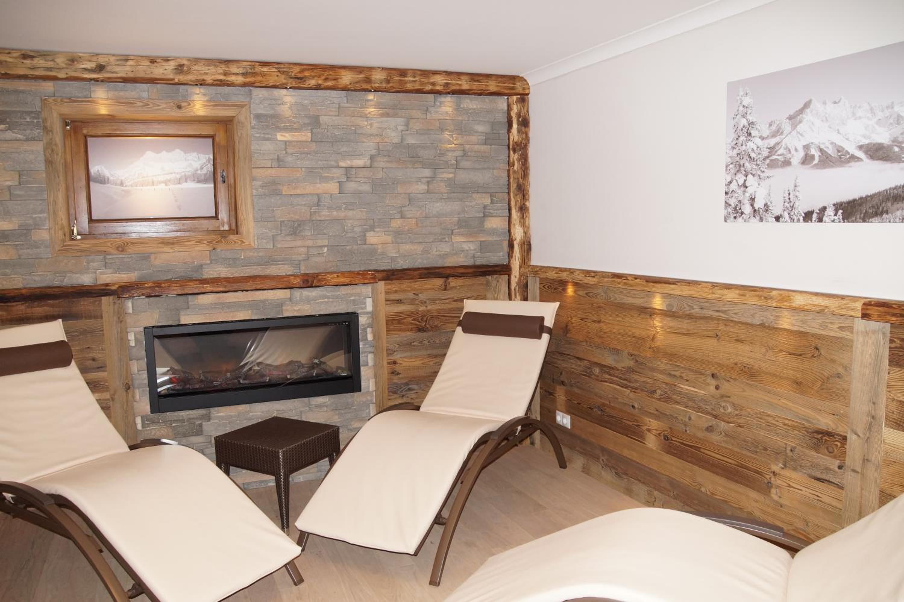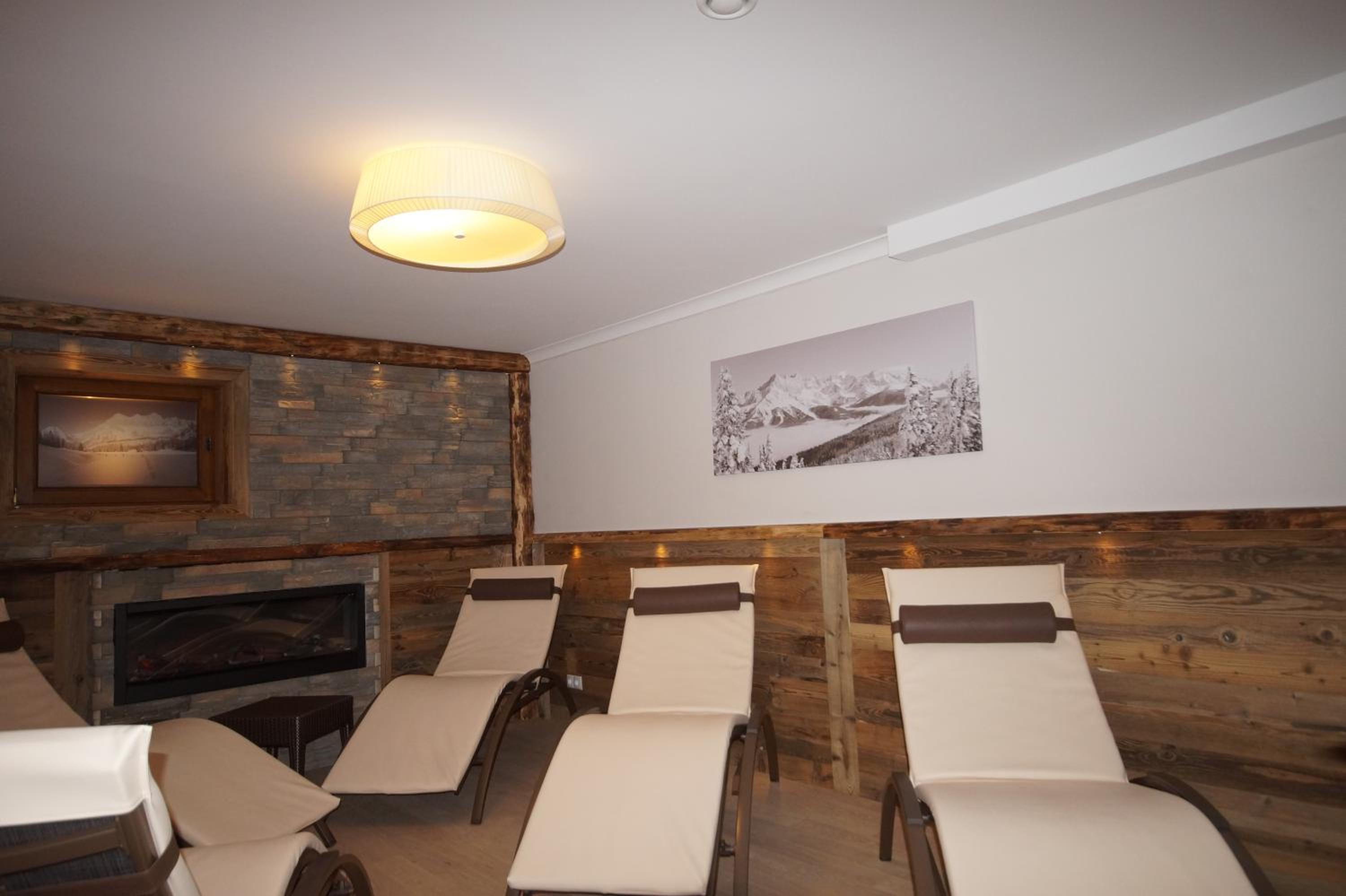 Each room at the hotel is tastefully furnished in a traditional style and features a private balcony, perfect for enjoying the picturesque surroundings. Additionally, amenities like a ski storage room with boot dryer and a bicycle garage ensure a comfortable stay.