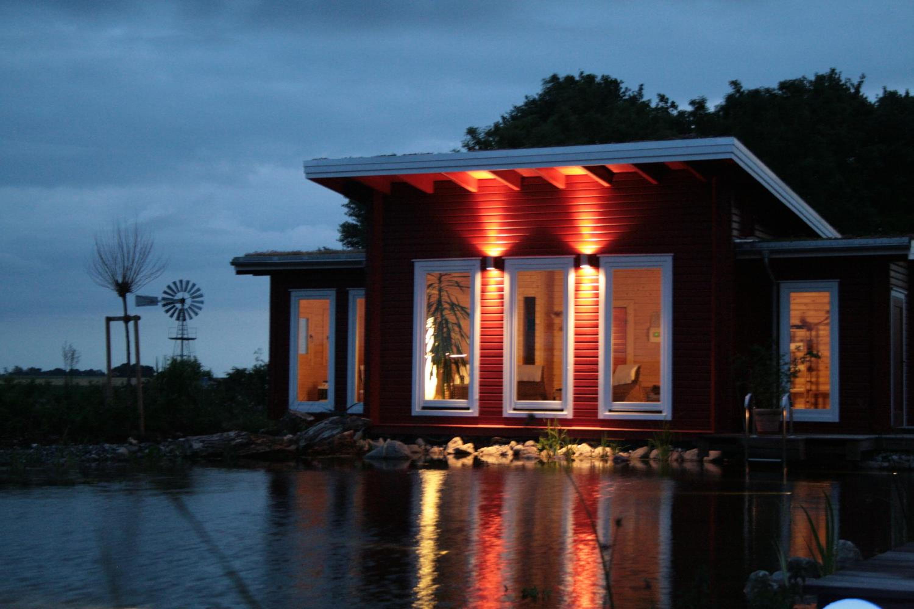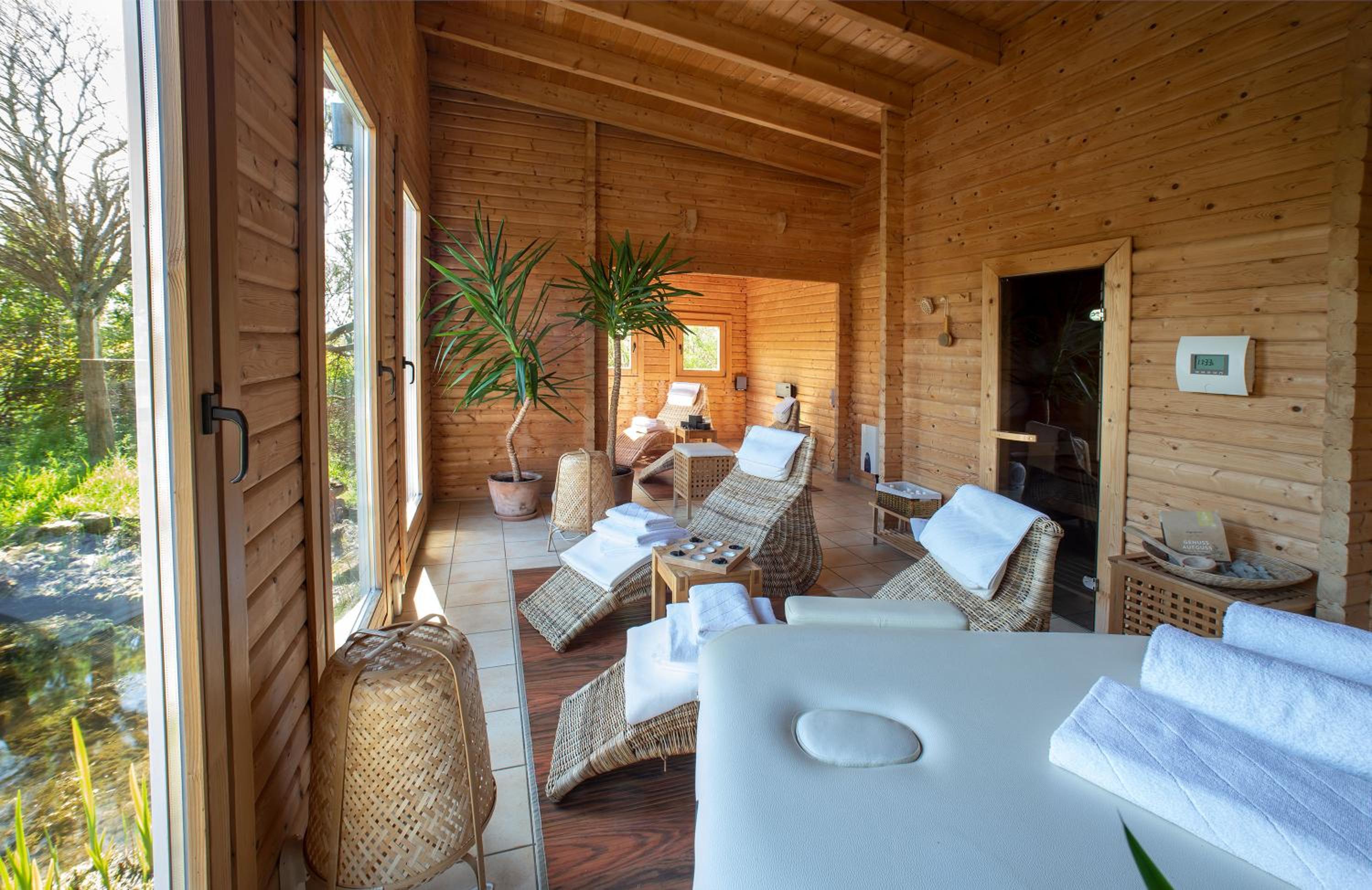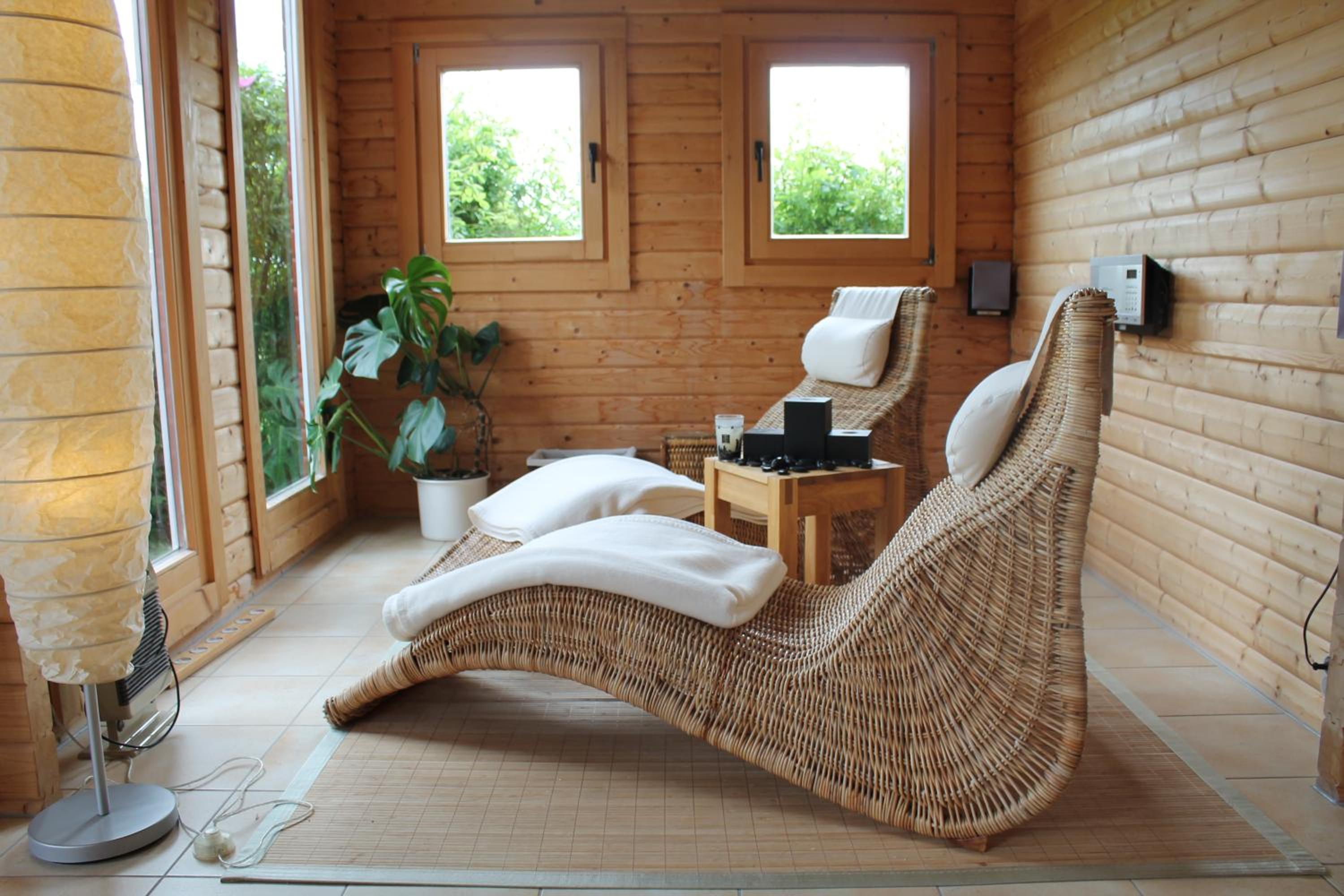 The Finnish sauna is ideal for groups of up to 4 people, for example for up to 2 couples. The Finnish sauna costs EUR 15 per hour per group. 4 loungers are also available in the relaxation area that looks out directly on the beautiful garden with pond.