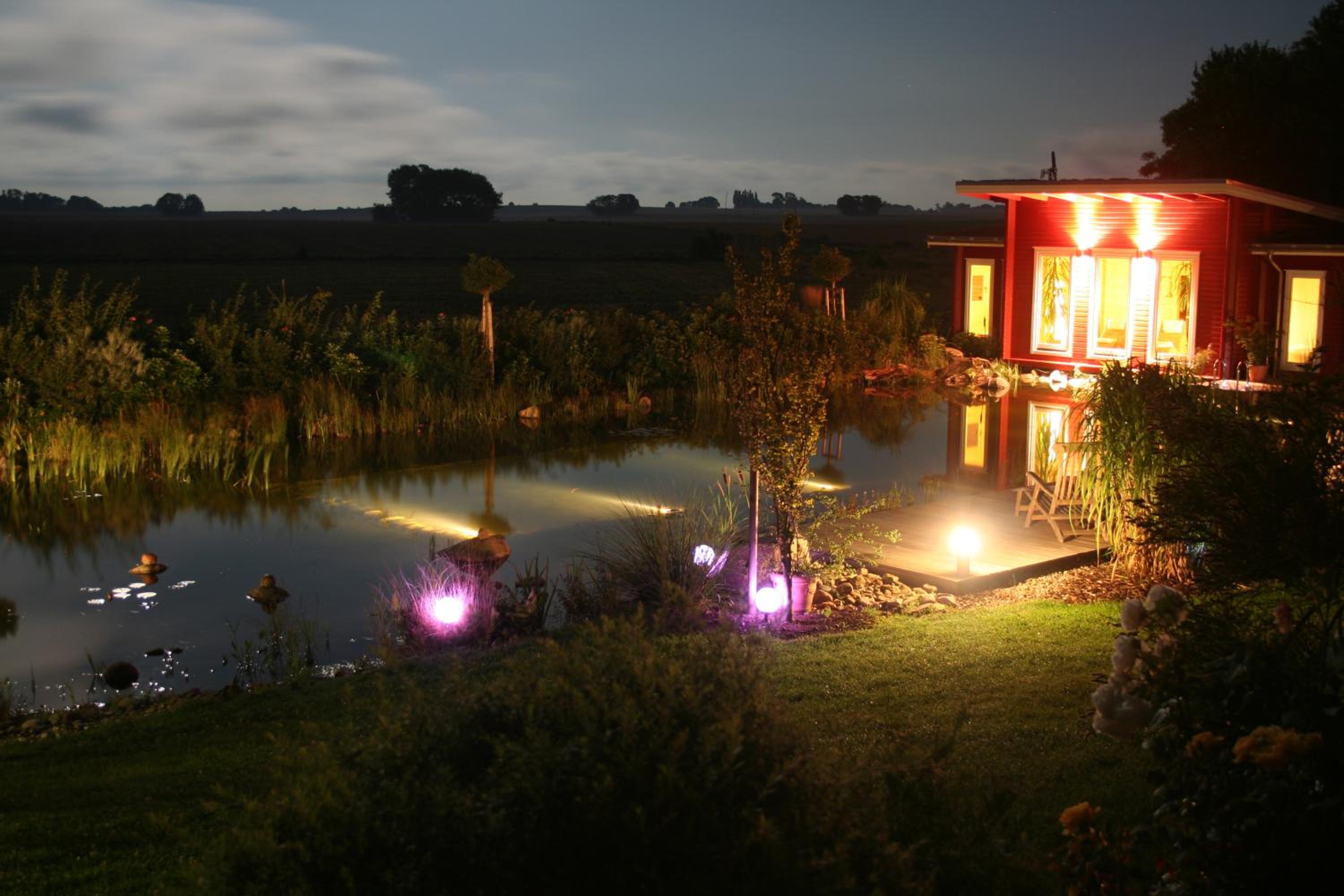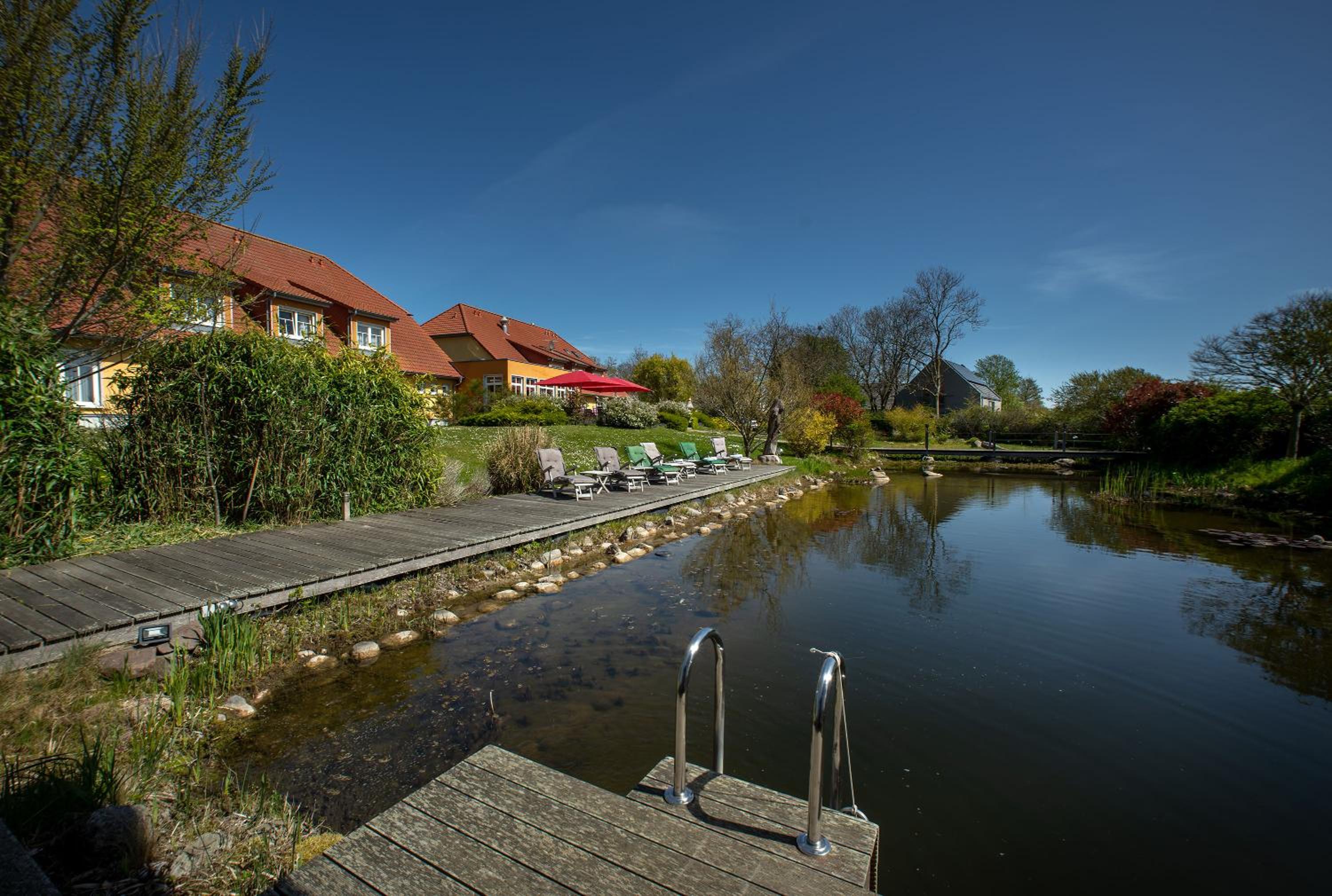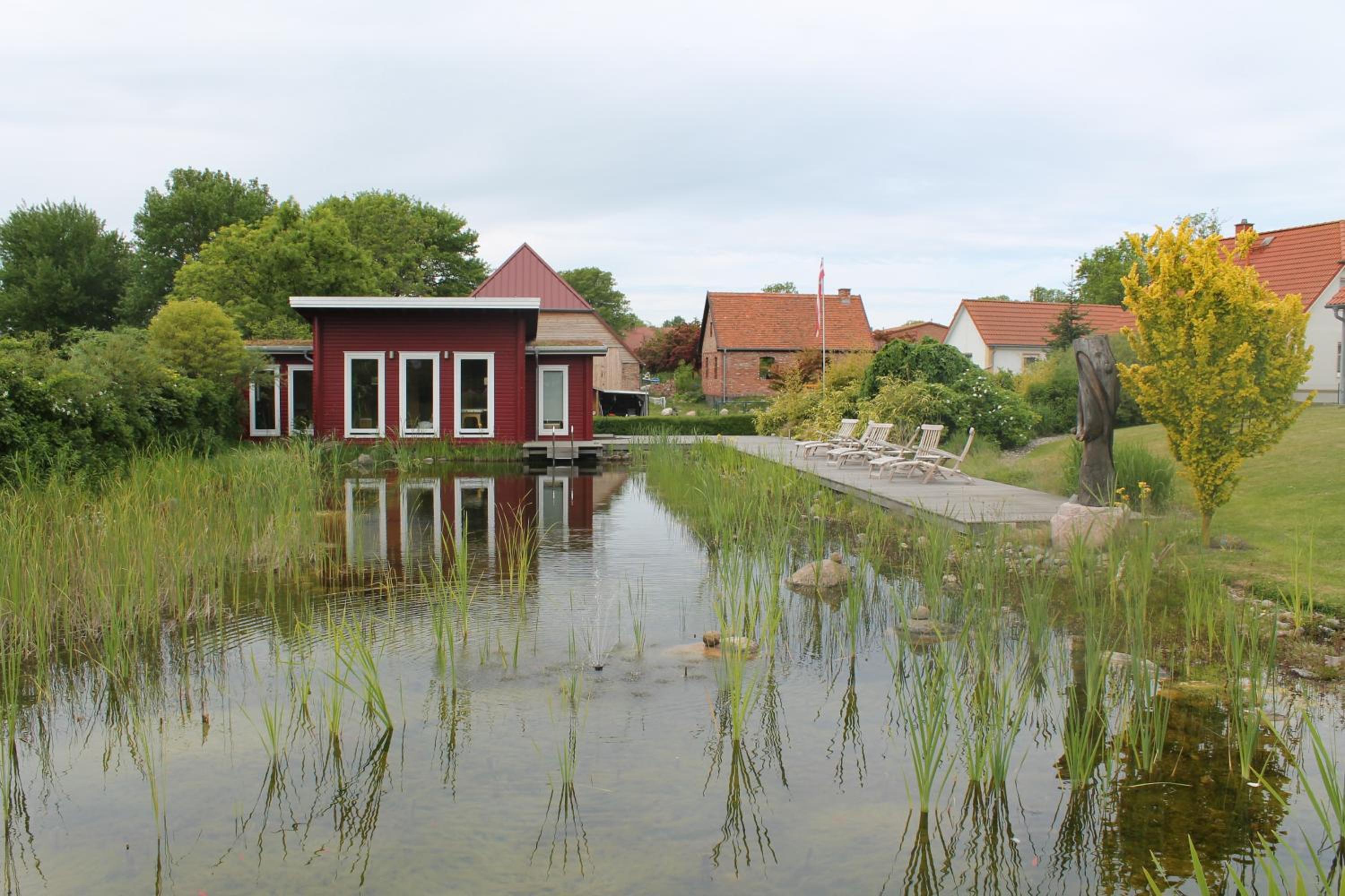 Sehr angenehmes Feeling, ruhige und entspannte Lage, extrem gepflegte Außenanlage mit tollem Pflanzenbestand und Schwimmteich