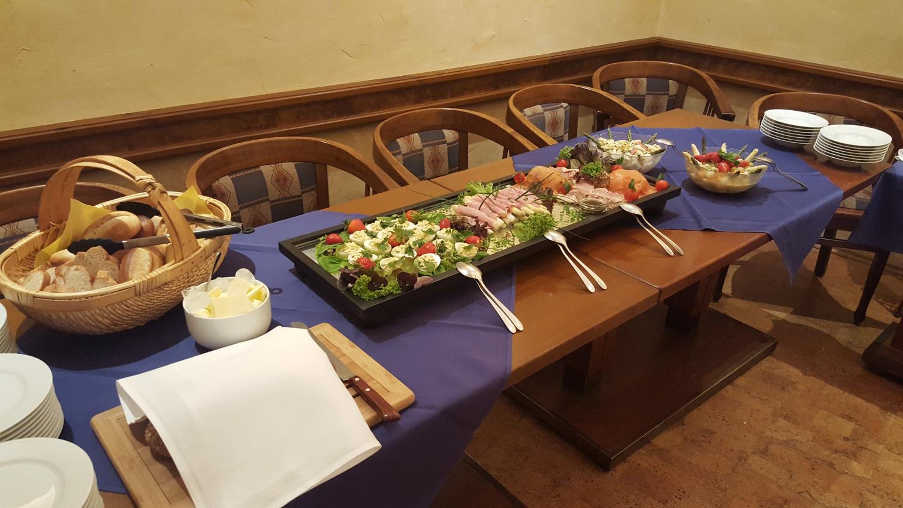 Een uitgebreid ontbijtbuffet.