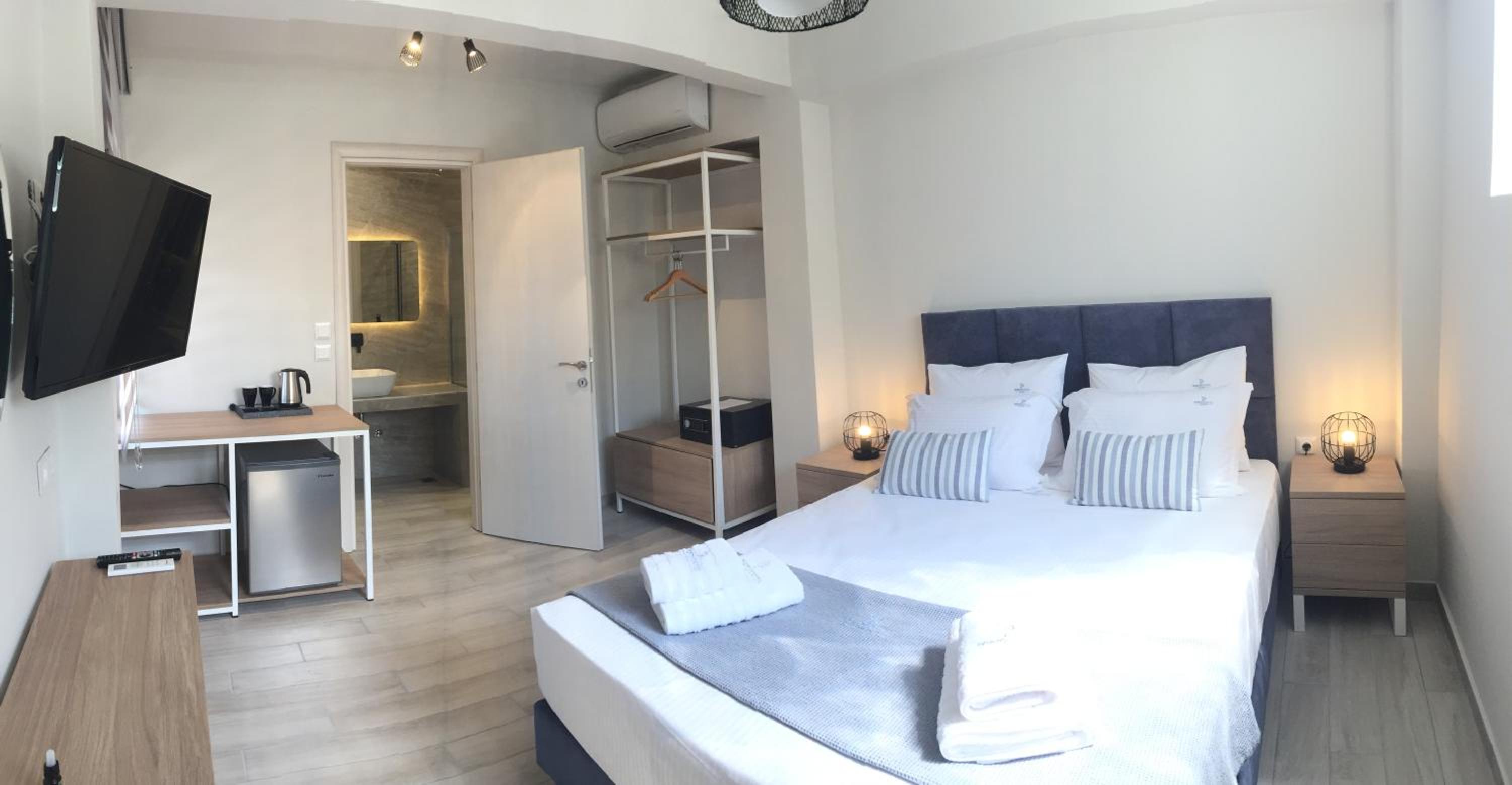 We had a 4 persons apartment and it was perfect for us a family with 2 kids. Big enough, it actually had an extra couch, so additional space. Everything is very new and extremely clean. The bathroom is in perfect condition, the beds were comfortable and we really relaxed as the room is very bright with lots of windows, but in the same time, we had curtains, shutters, even mosquito net and air conditioned. The photos here tell the truth and the place is really 2 min away from the beach. We also had a small terrace that we could use for relaxing in the yard, gathering with friends or even have a small breakfast organized by us. The breakfast offered by the owners is actually on the beach. The owners have a beach bar as well and we were able to grab a breakfast directly there on the beach. We had a discount on any orders. The variety was good for breakfast - omelets, Greek yogurts, pancakes, etc. It is also located very near to restaurants and places to go out in walking distance. There is a parking lot in the yard with enough spaces for all the tenants. We really enjoyed and we're happy we spent 10 beautiful days here, every little detail planned by the owners made our stay perfect and we'll have good memories from here.