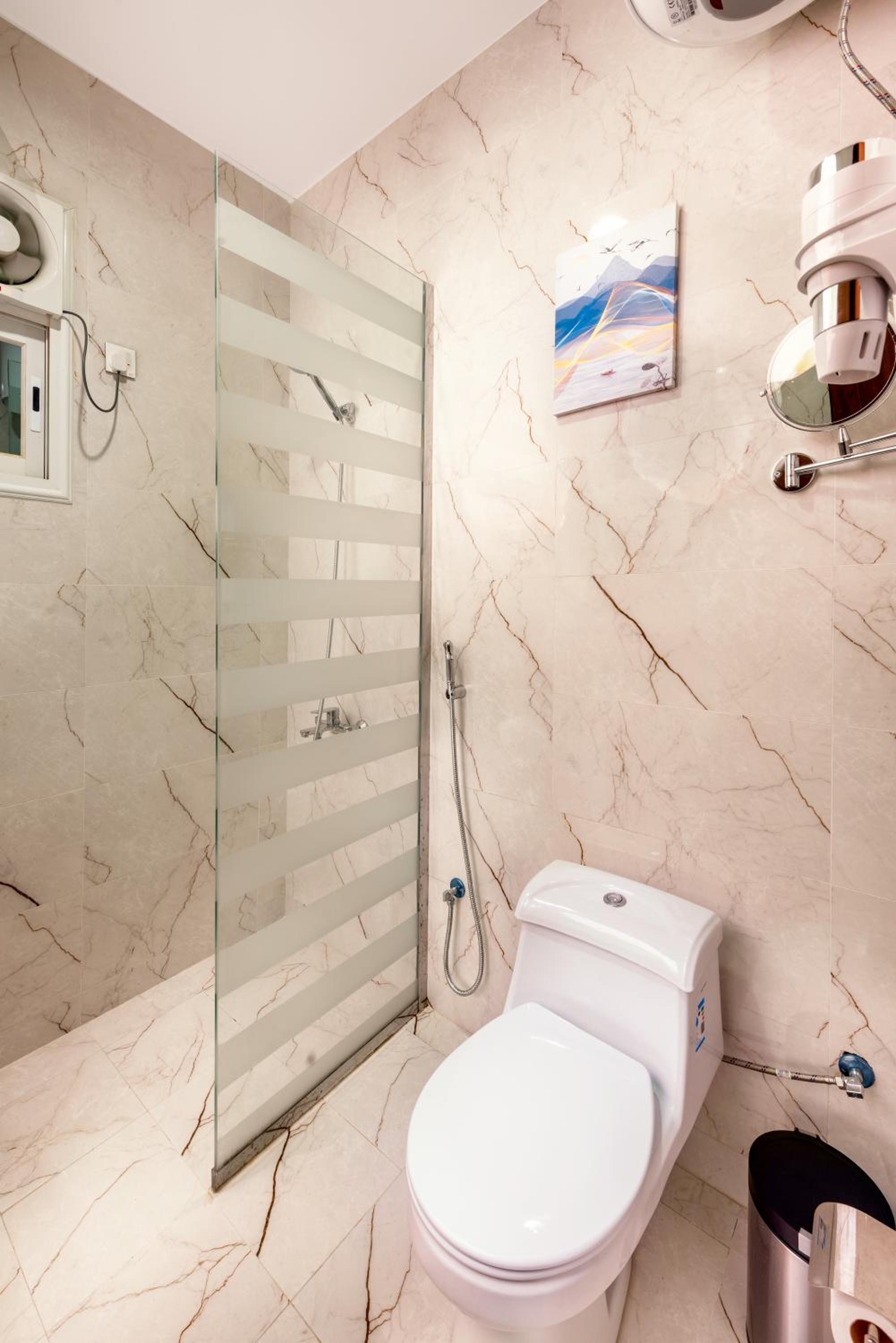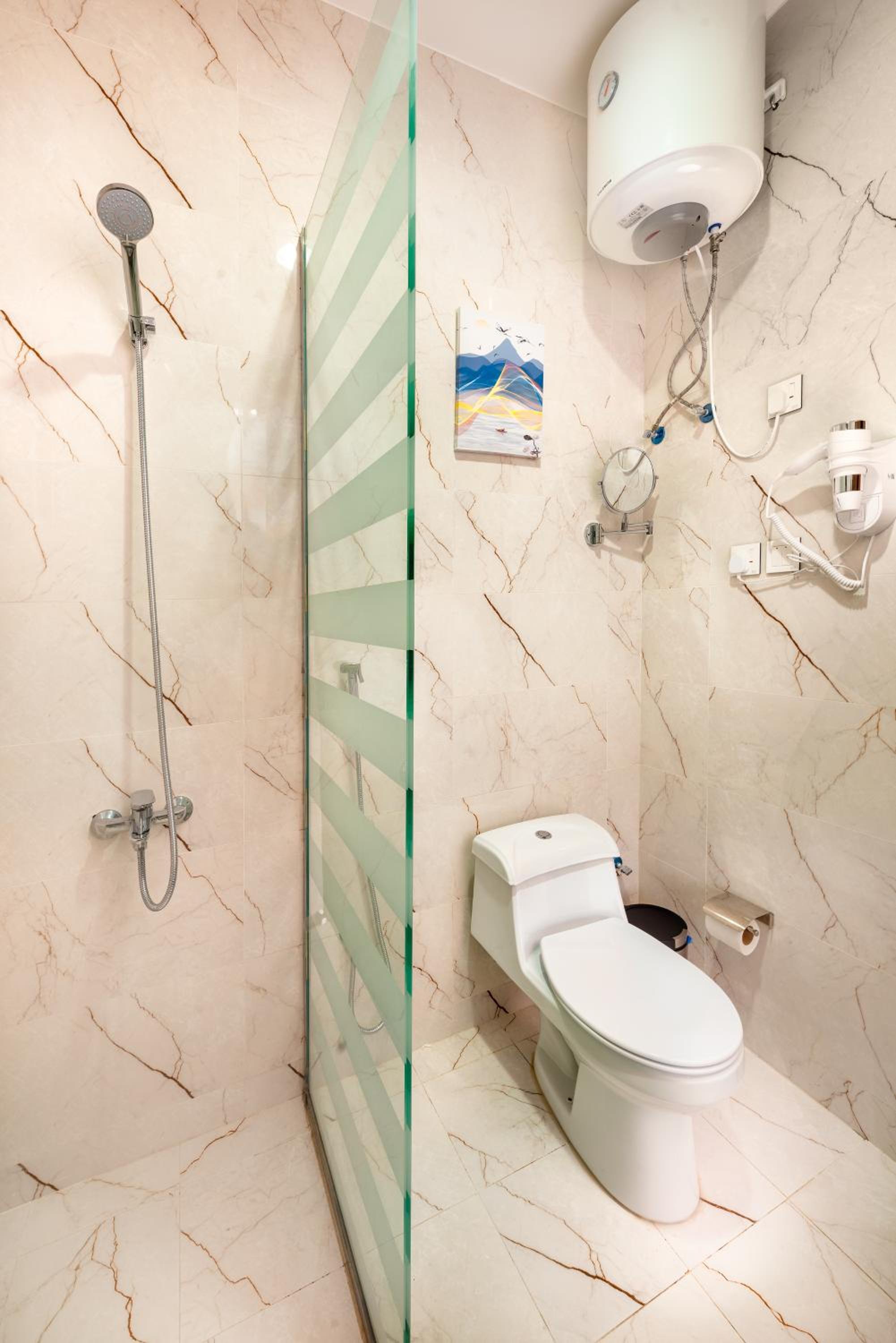 Experience a comfortable stay in our spacious units equipped with a desk, flat-screen TV, air conditioning, and plush bedding. The private bathrooms feature a bidet and complimentary slippers for your convenience.