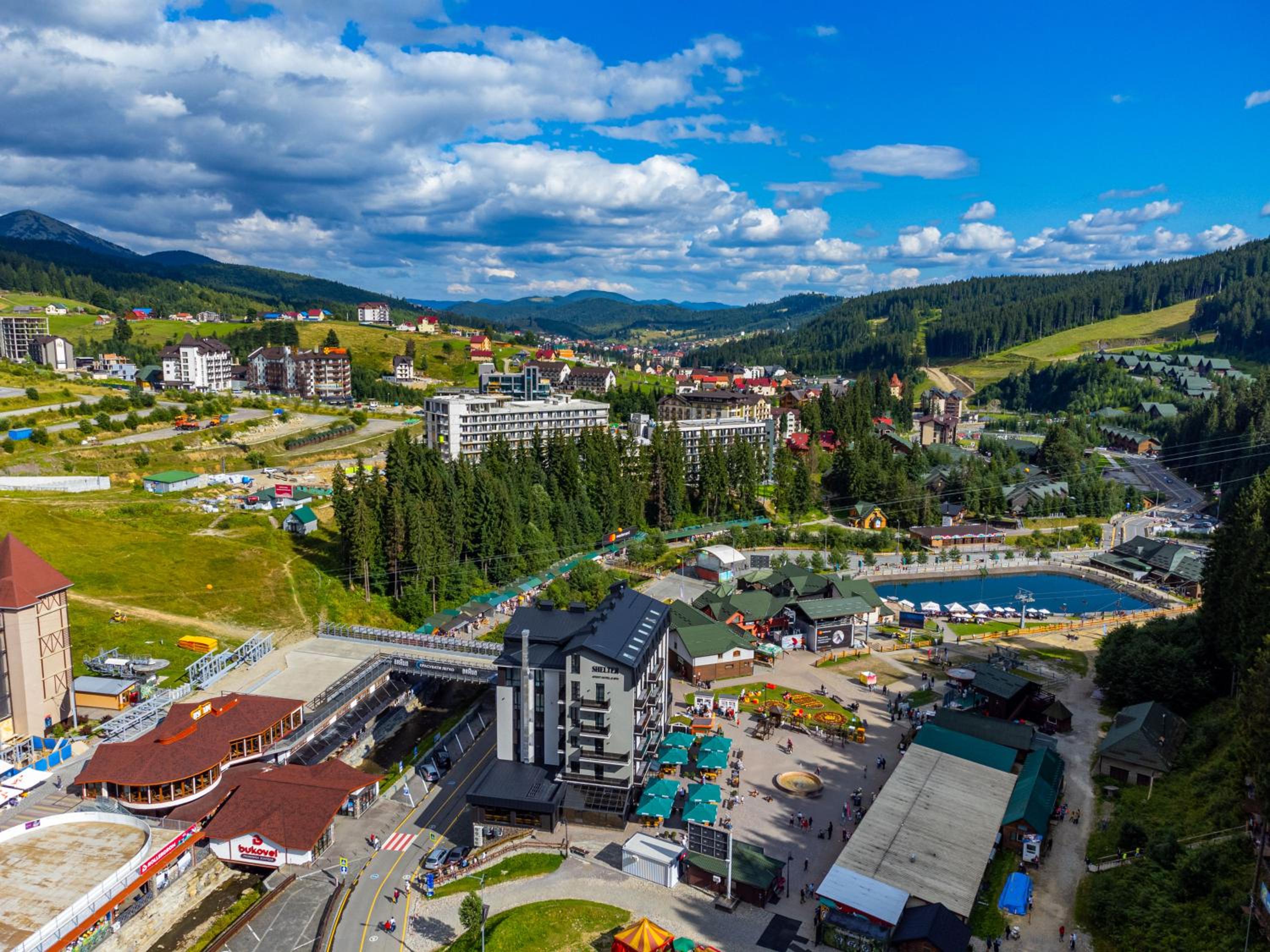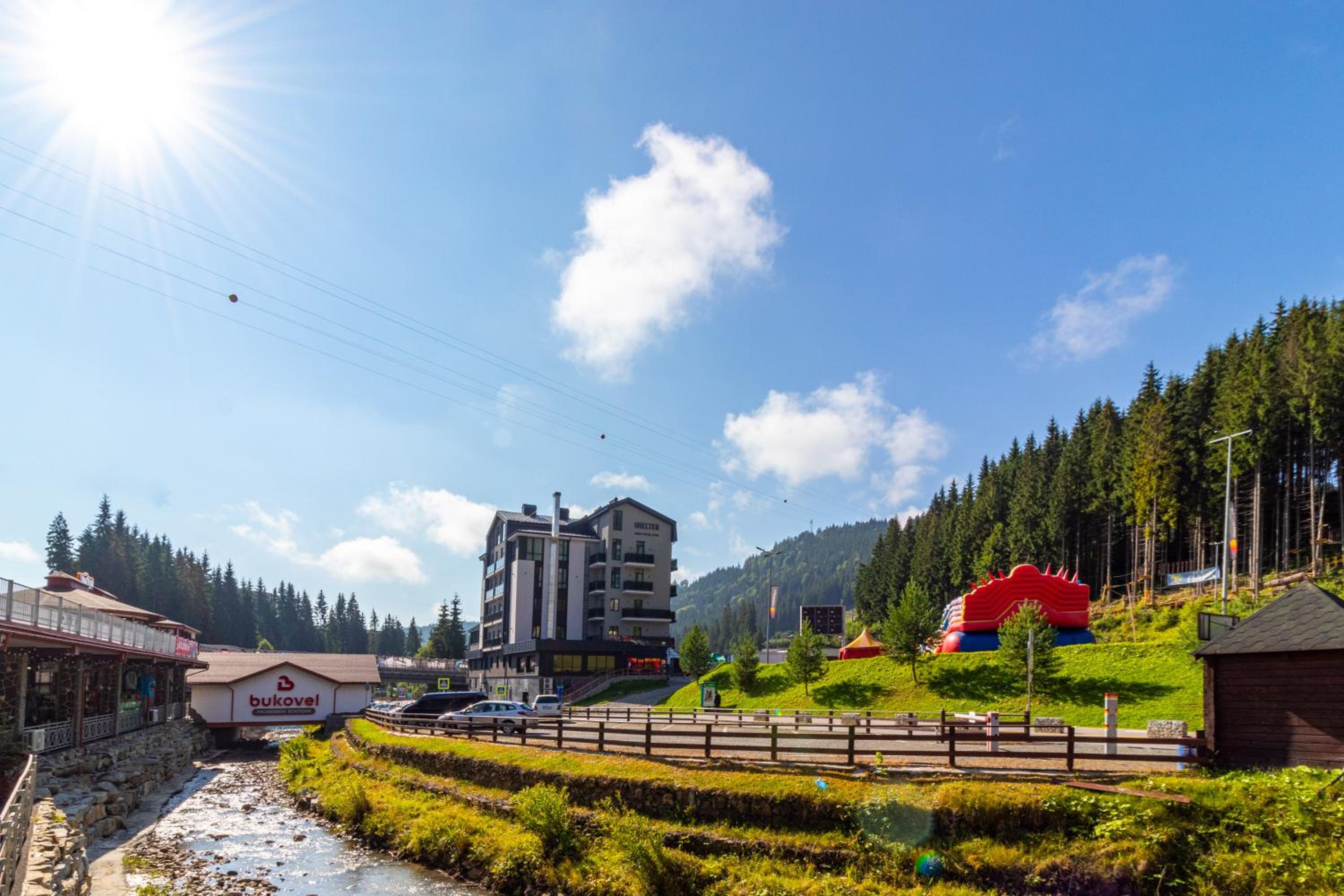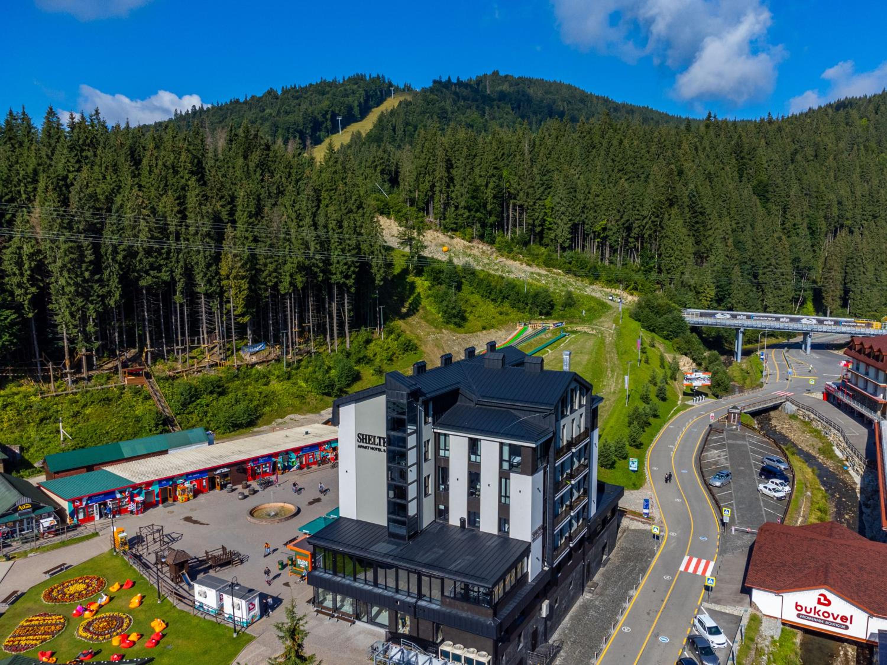 Shelter Apart Hotel, nestled in Bukovel, offers stunning mountain views and a serene escape with a hot tub and sauna for ultimate relaxation.