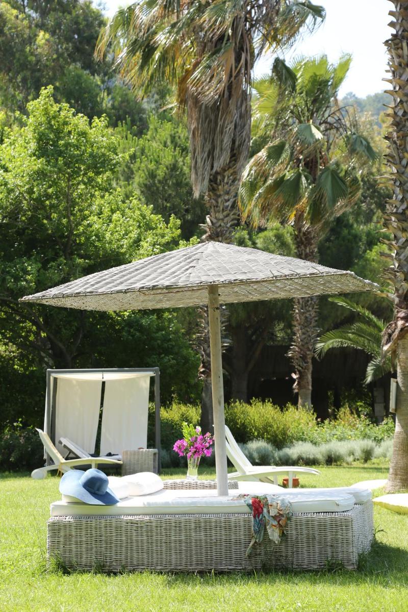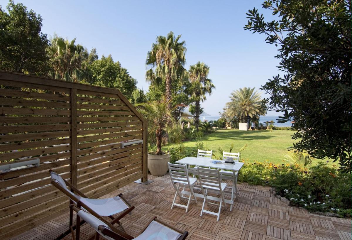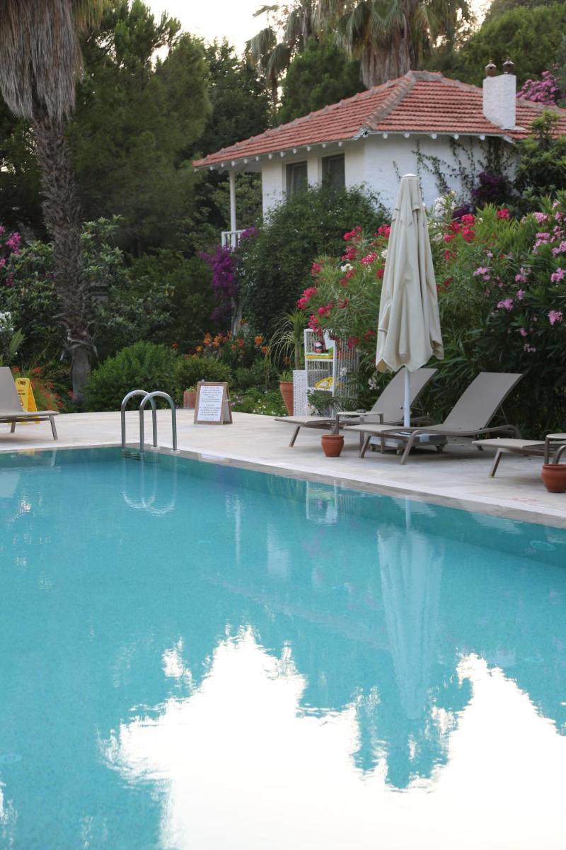 Enjoy the serene waters of Hisaronu Bay at our hotel's private beach or lounge by the outdoor pool surrounded by palm trees.