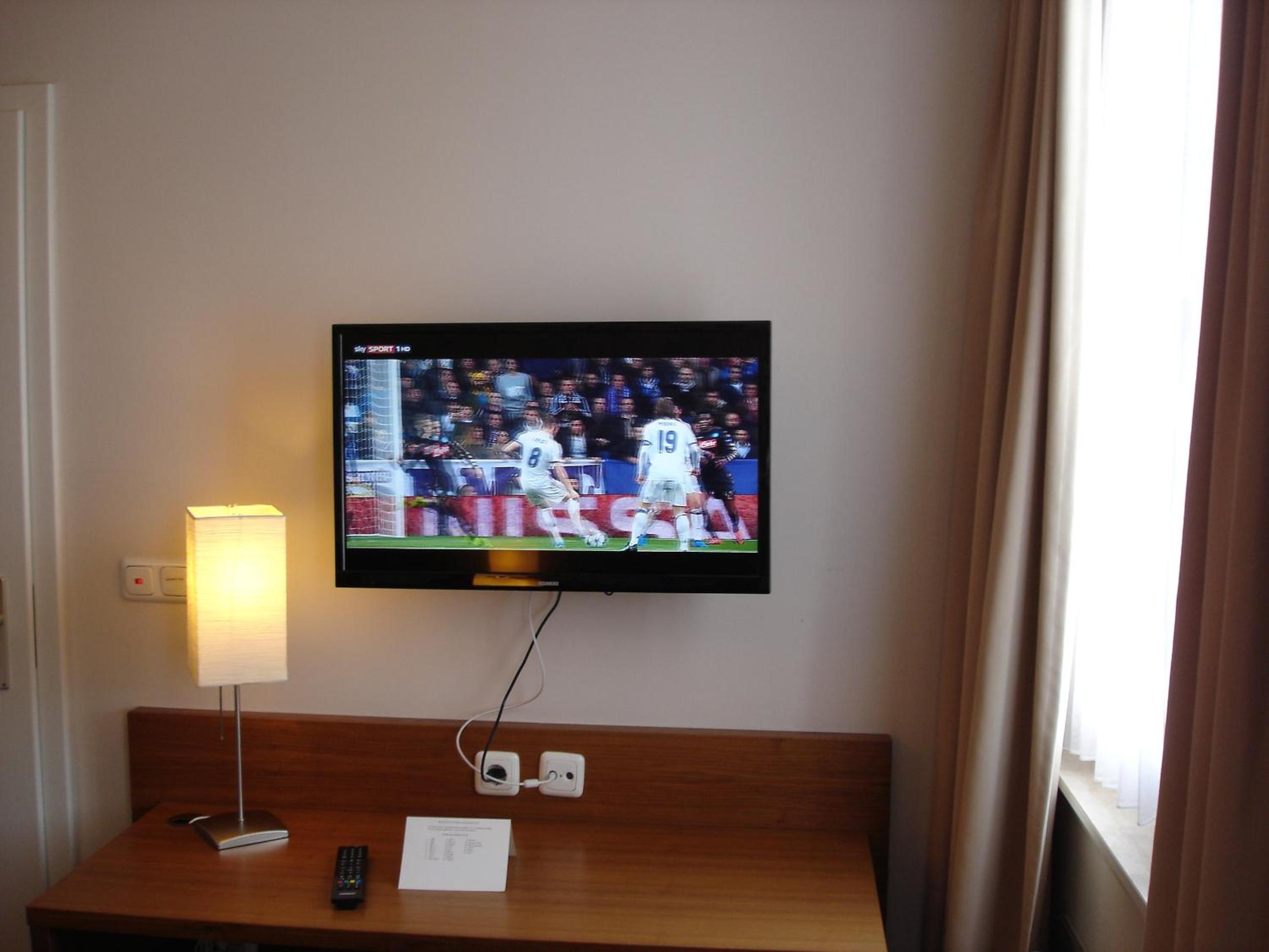 Das TV Gerät war seitlich des Bettes, so dass man zu zweit nicht bequem aus dem Bett schauen könnte.