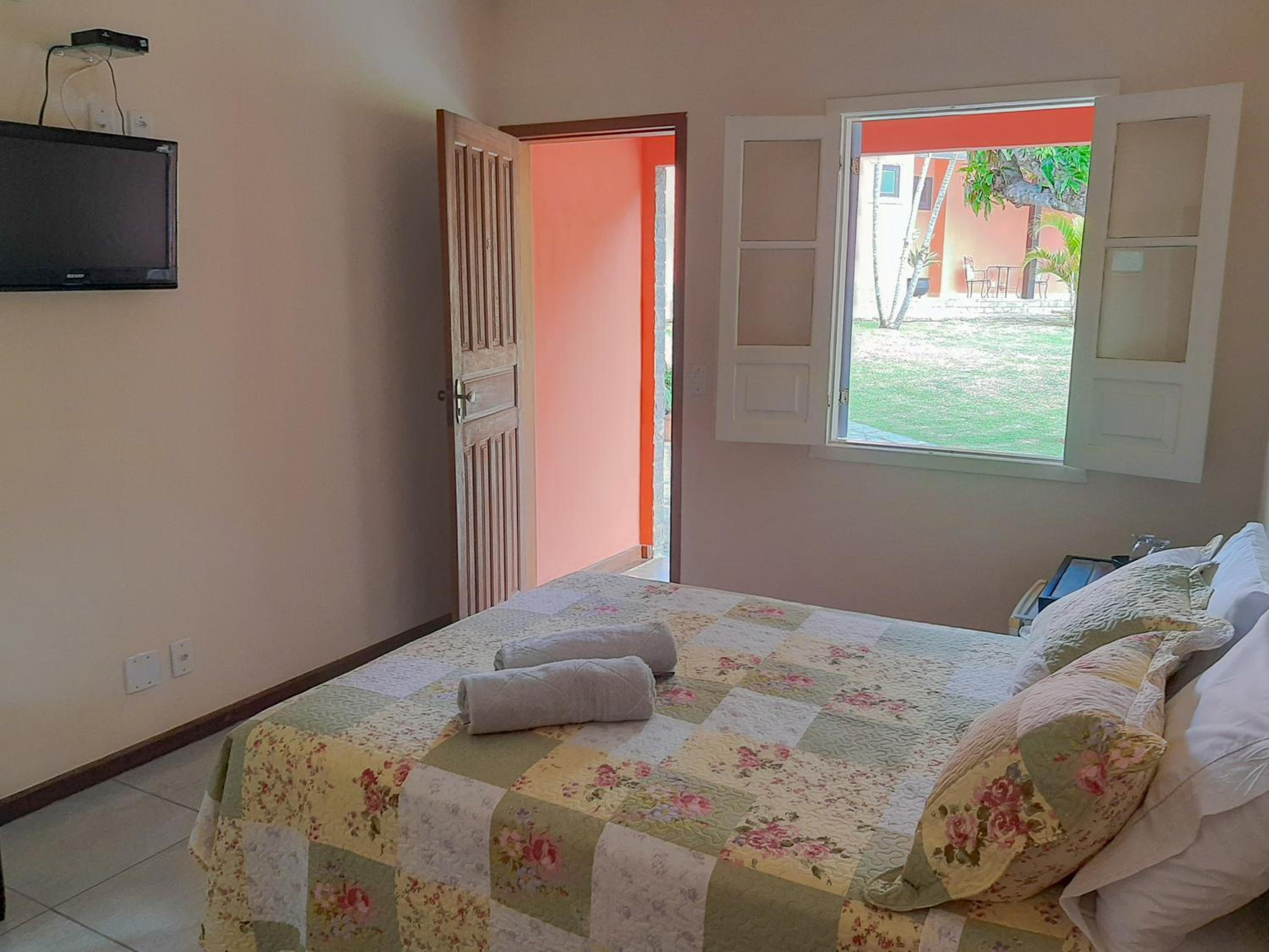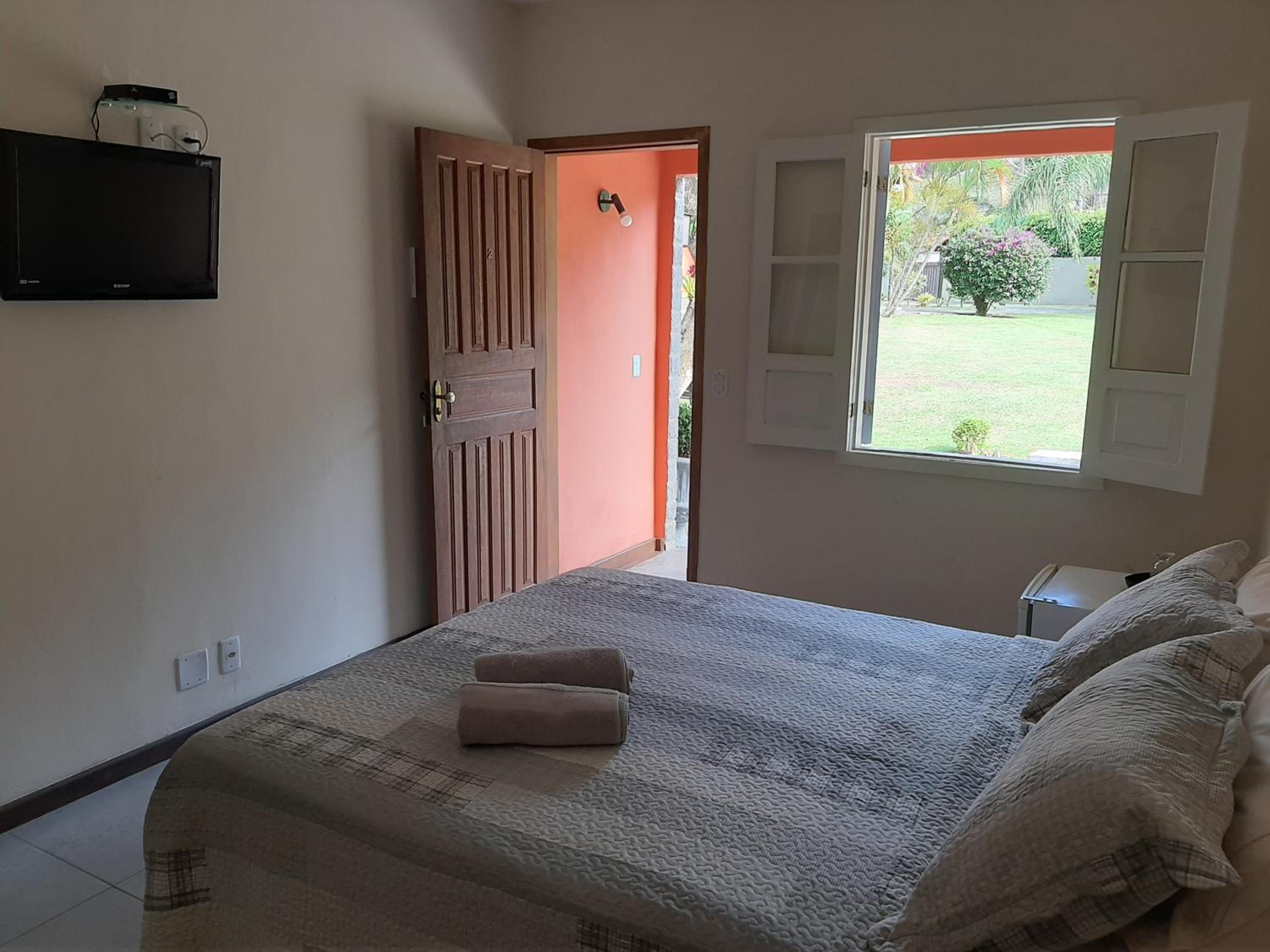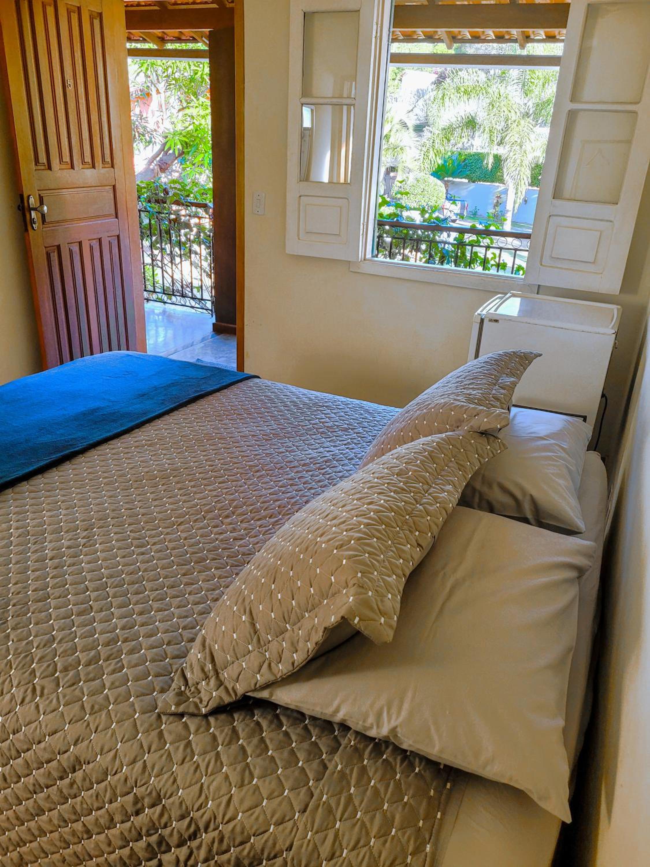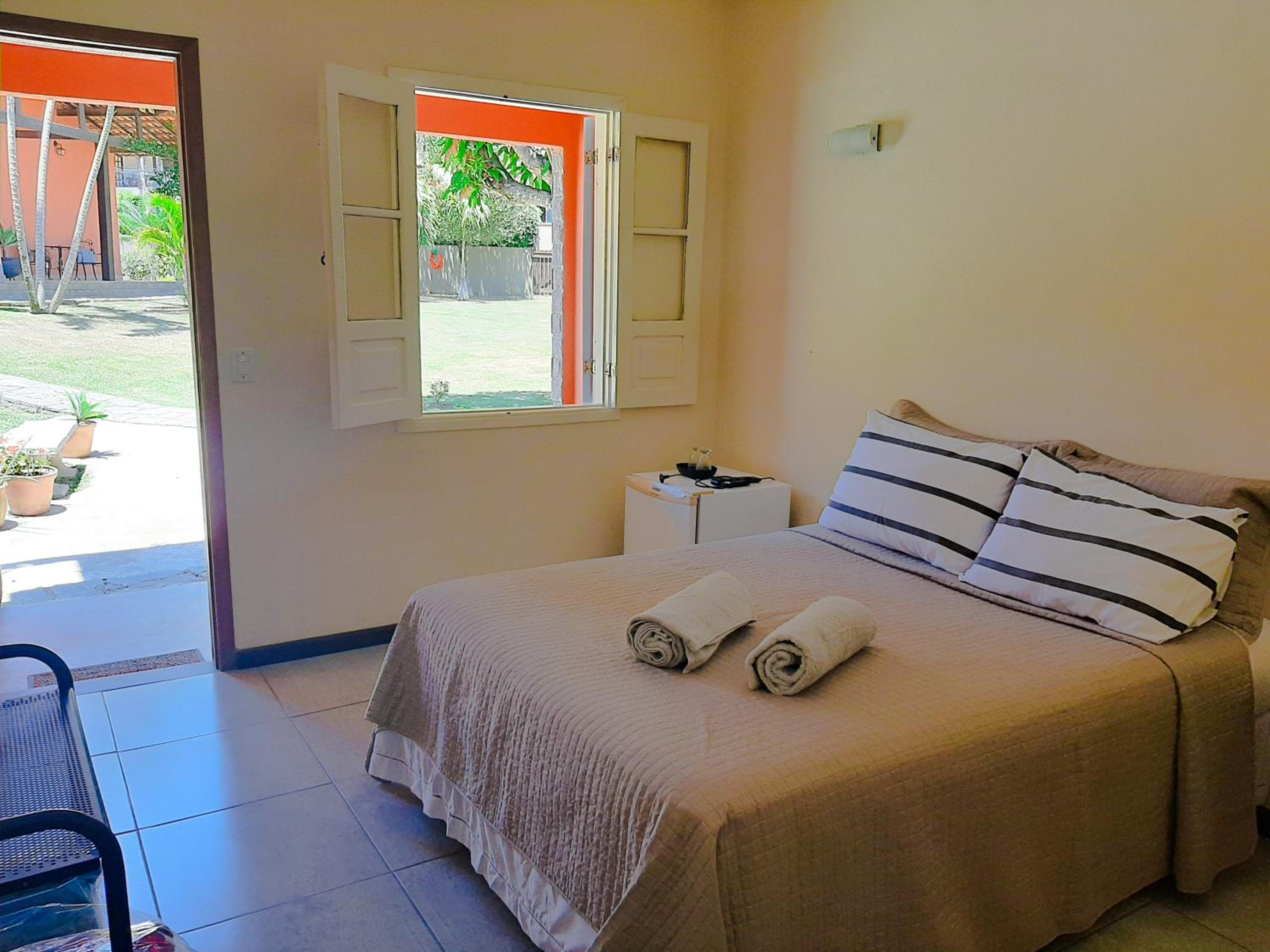 A pousada é muito bem equipada com ar-condicionado, ventilador, frigobar, um banheiro maravilhoso