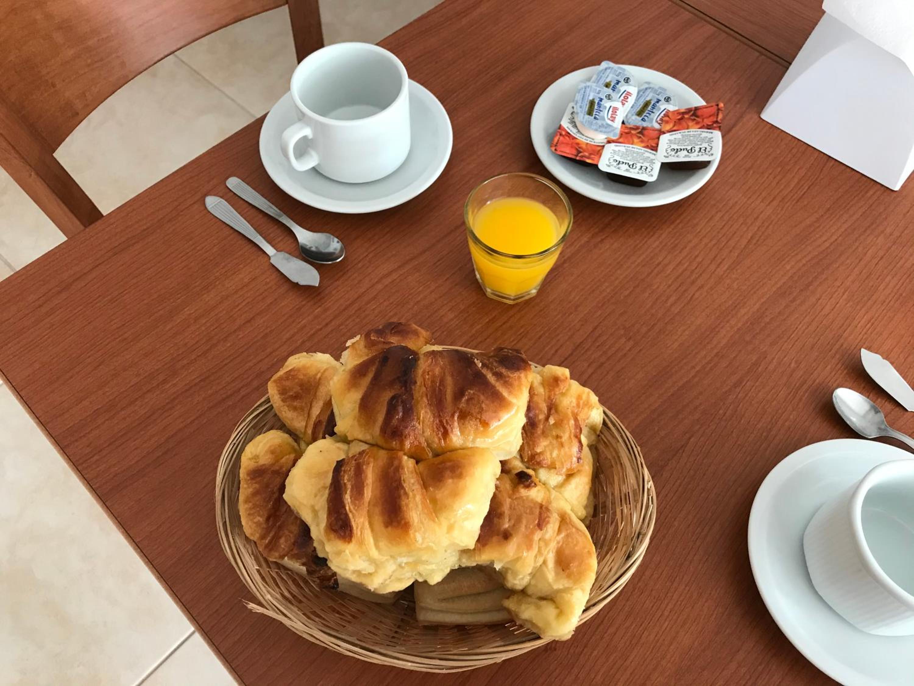 El desayuno bastante incompleto. Te dan una bandeja con medialunas y pan. Sería ideal que agreguen frutas o alguna proteína de calidad.
