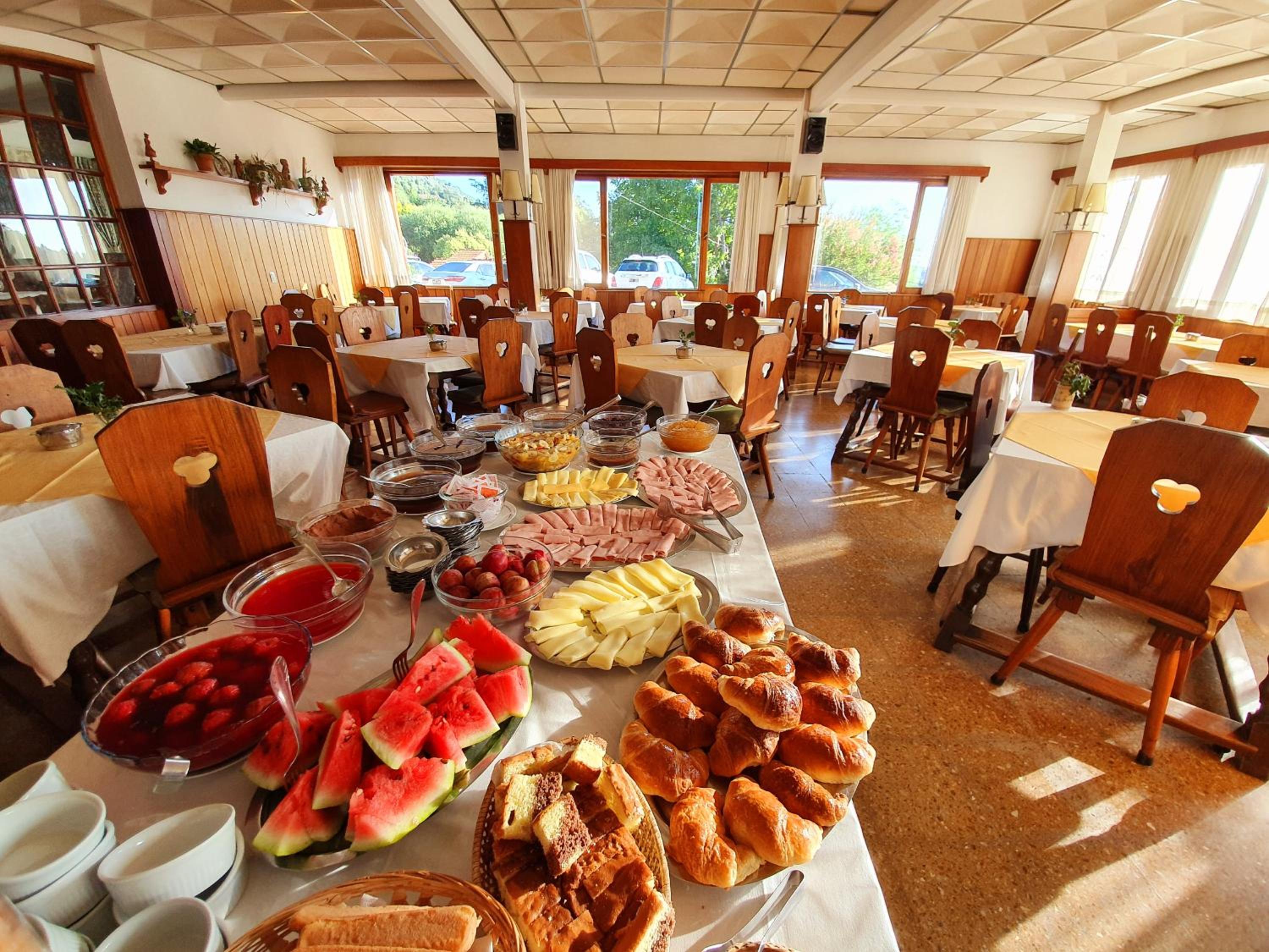El desayuno buffet, exquisito y variado, desde bizcochos, medialunas, distintas tortas, hasta frutas que van cambiando dia a día, además de yogures, jugo, leche, café, etc.