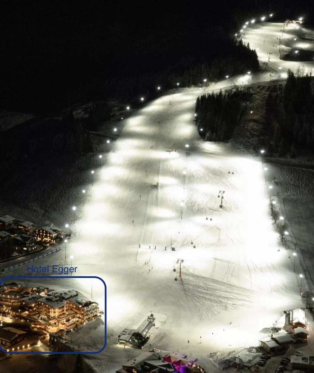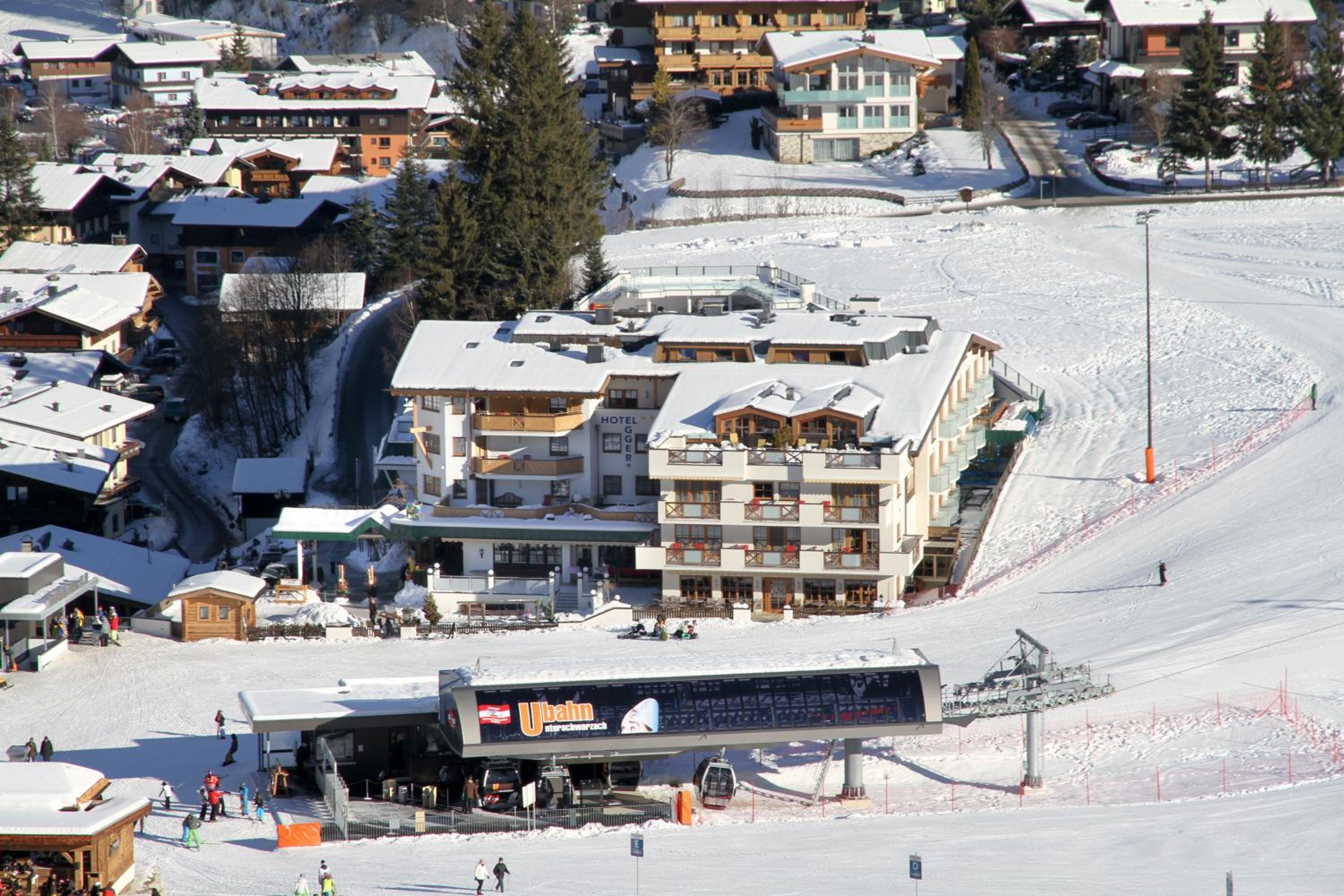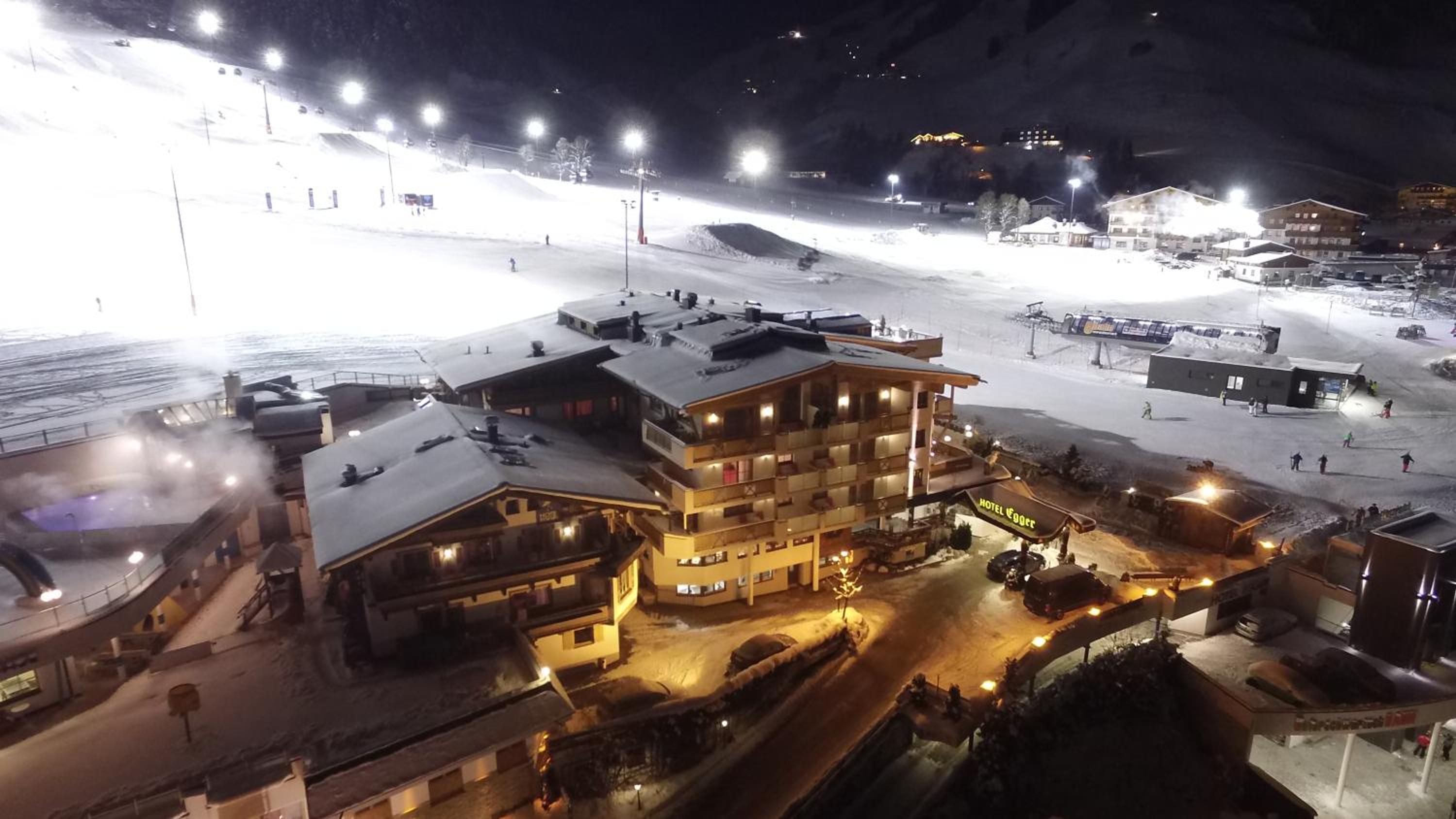 Wellness- und Familienhotel Egger offers ski-to-door access and is conveniently situated next to the Unterschwarzachbahn ski lift, providing direct entry to the Skicircus Saalbach Hinterglemm.
