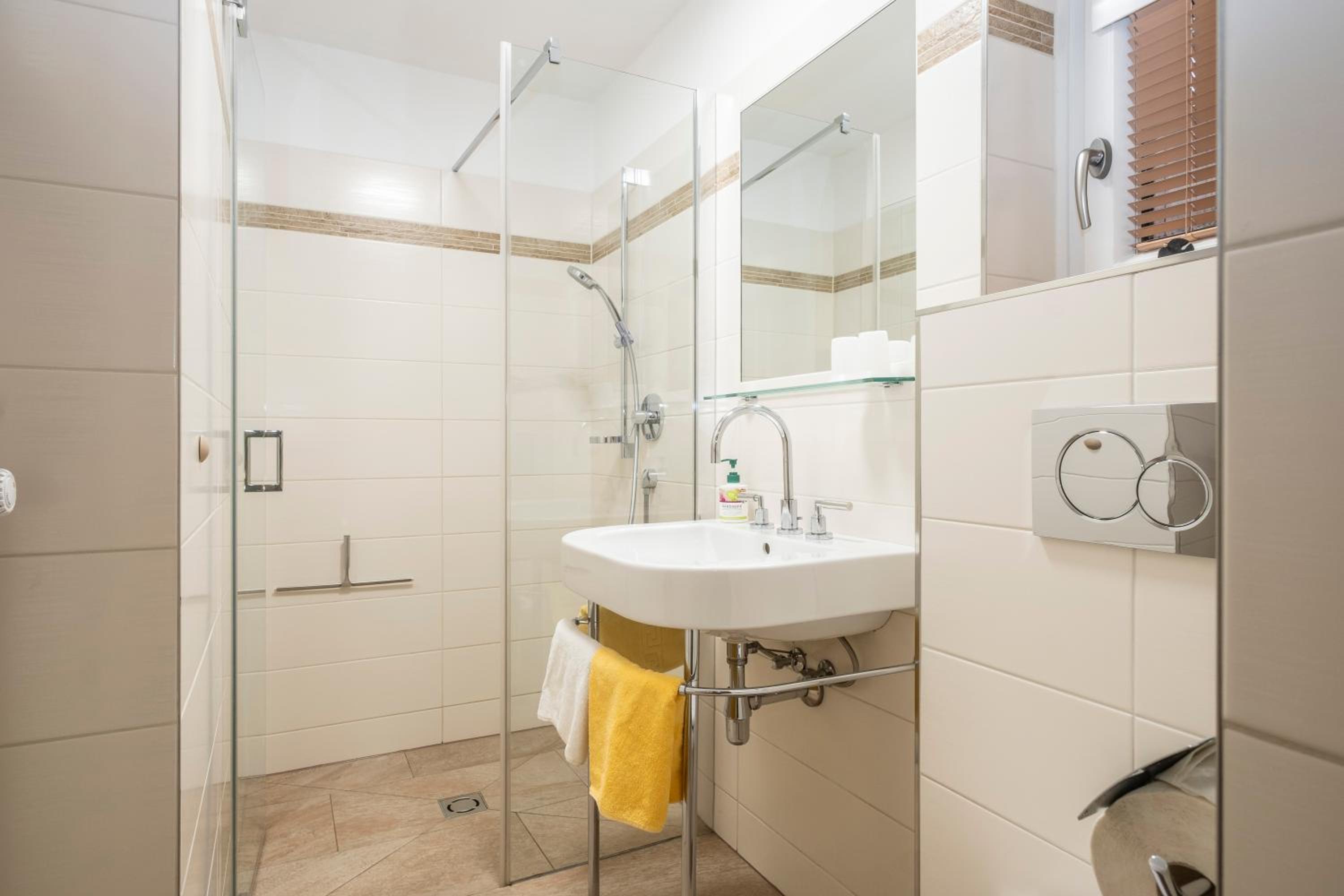 The rooms and apartments seamlessly blend modern amenities with a touch of traditional style. Guests can enjoy cable TV, a bathroom with a hairdryer, and for those staying in the apartments, a fully equipped kitchen.