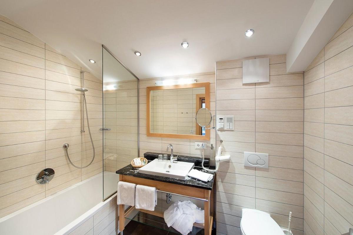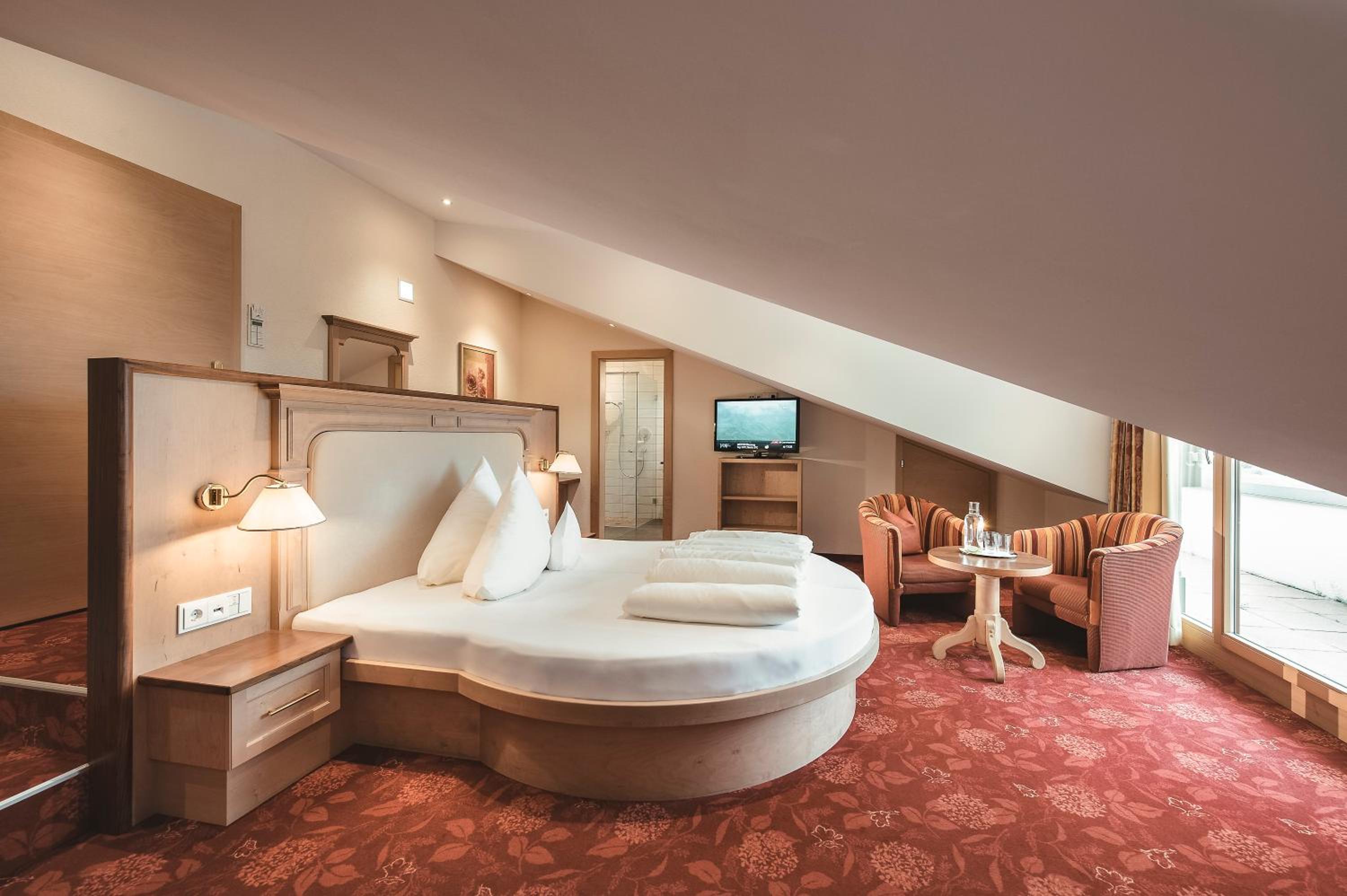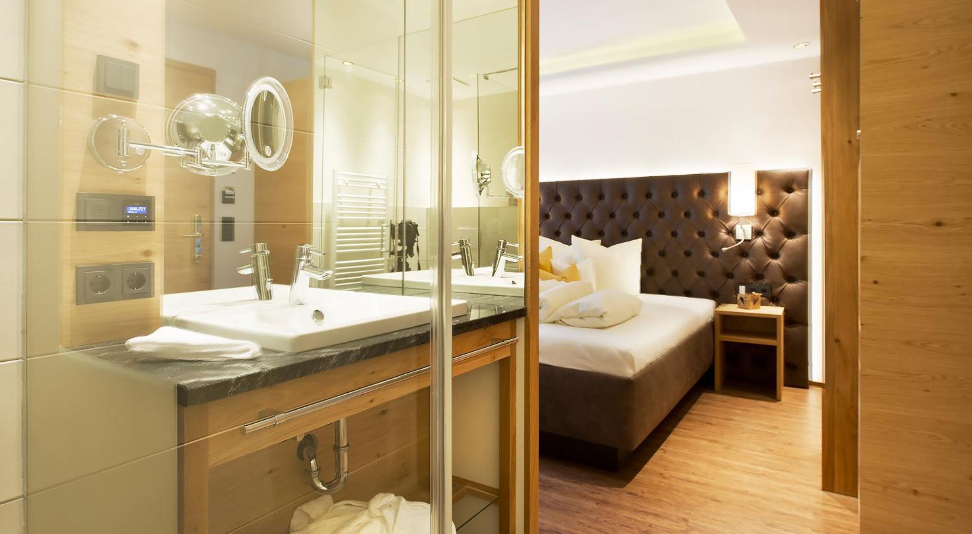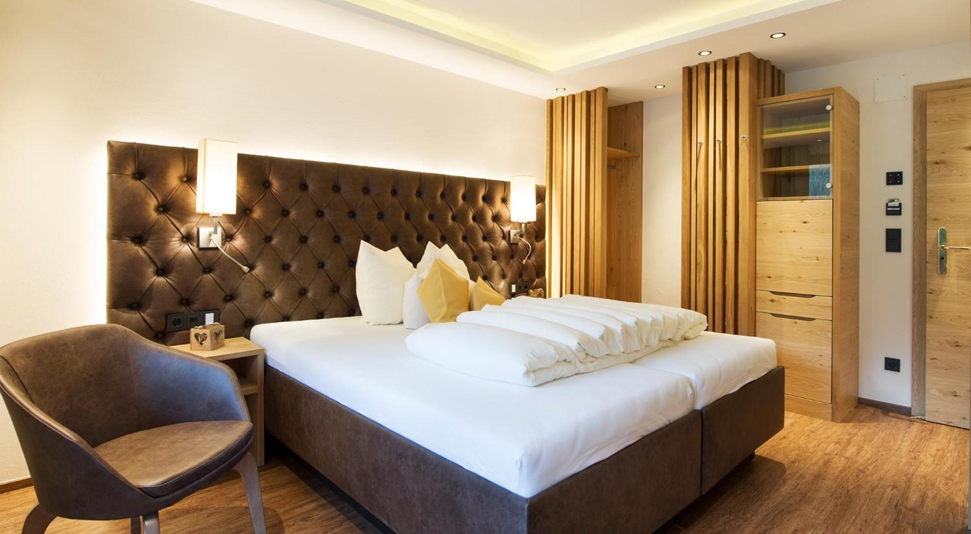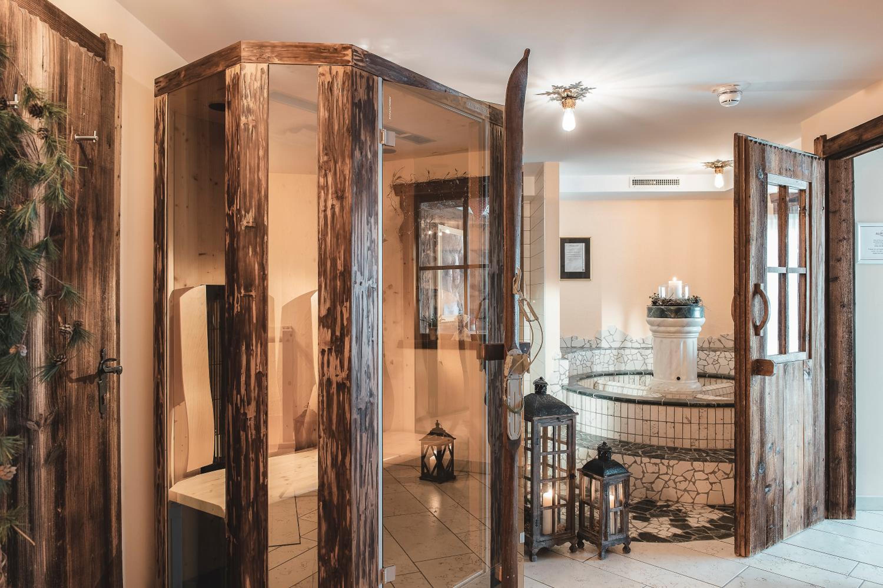 Unwind in the 400 m² spa area with saunas, steam bath, pool, hay beds, and more. End your day at the Tyrolean-style bar with a selection of wines and cocktails.