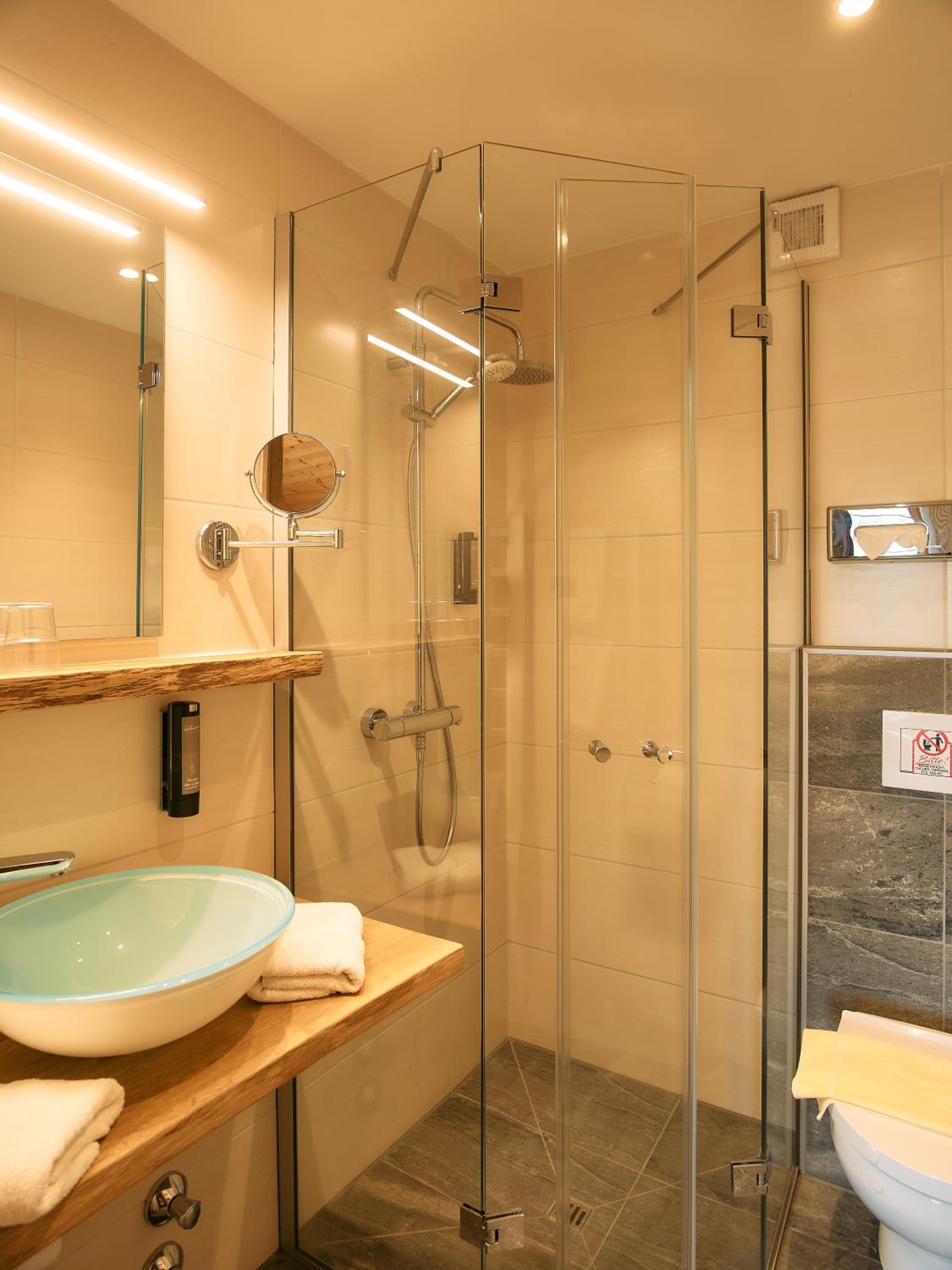 Die Mitarbeitenden in allen Bereichen waren zugewandt und freundlich Hier werden Service und Dienstleistung noch großgeschrieben (dafür 11 Punkte)! Die Zimmer sind freundlich eingerichtet, das Badezimmer etwas klein, aber ausreichend. Tasche für die Sauna war auf dem Zimmer, der Wellnessbereich supertoll!