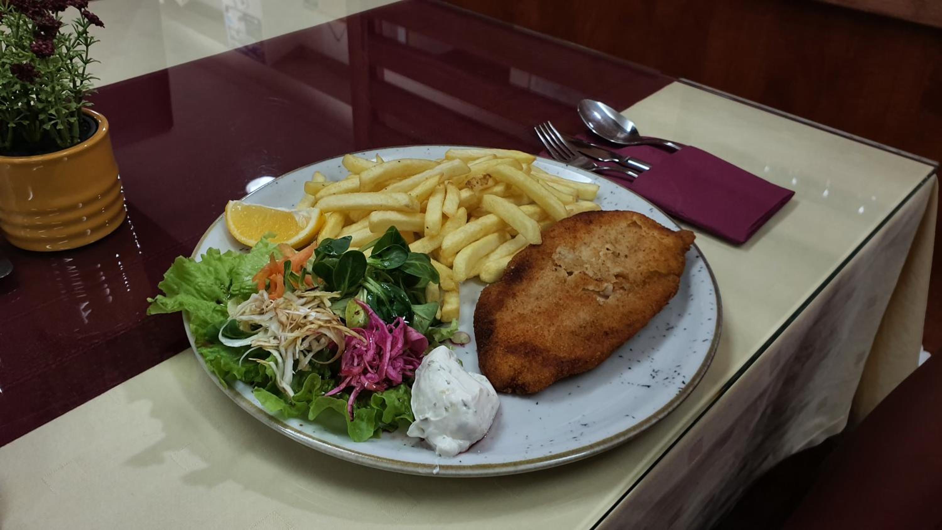 Dorucak obilan,svega uvijek dovoljno.Vise vrsta sokova, kave ,cajeva ,voca ,suhomesnatog i vise vrsta kruha. Buffet princip dorucka.Osoblje kao i uvijek na javisem nivou.Jako ljubazni ,usluzni ,nasmijani .Rucak ili veceru iz njihovog restorana mozete konzumirati na terasi uz vanjski bazen.