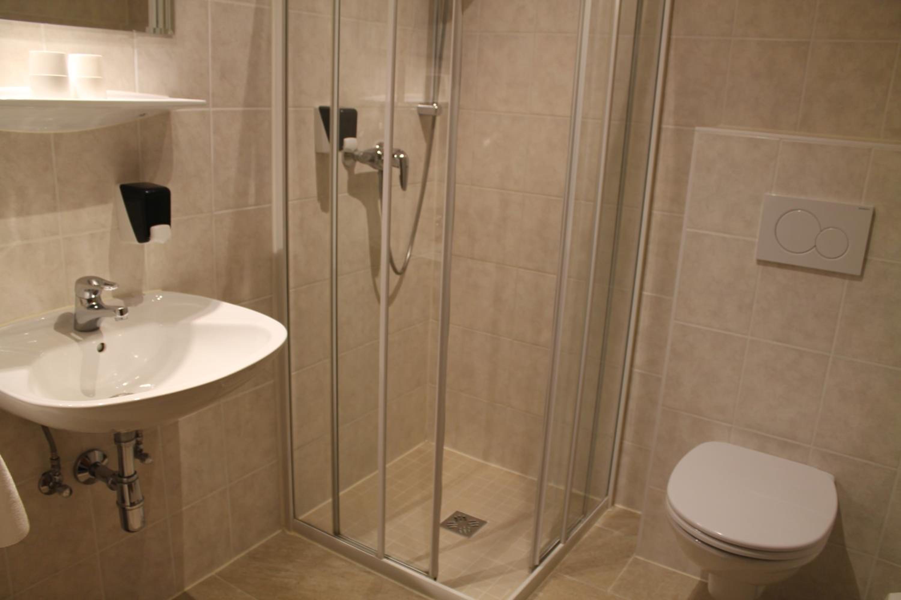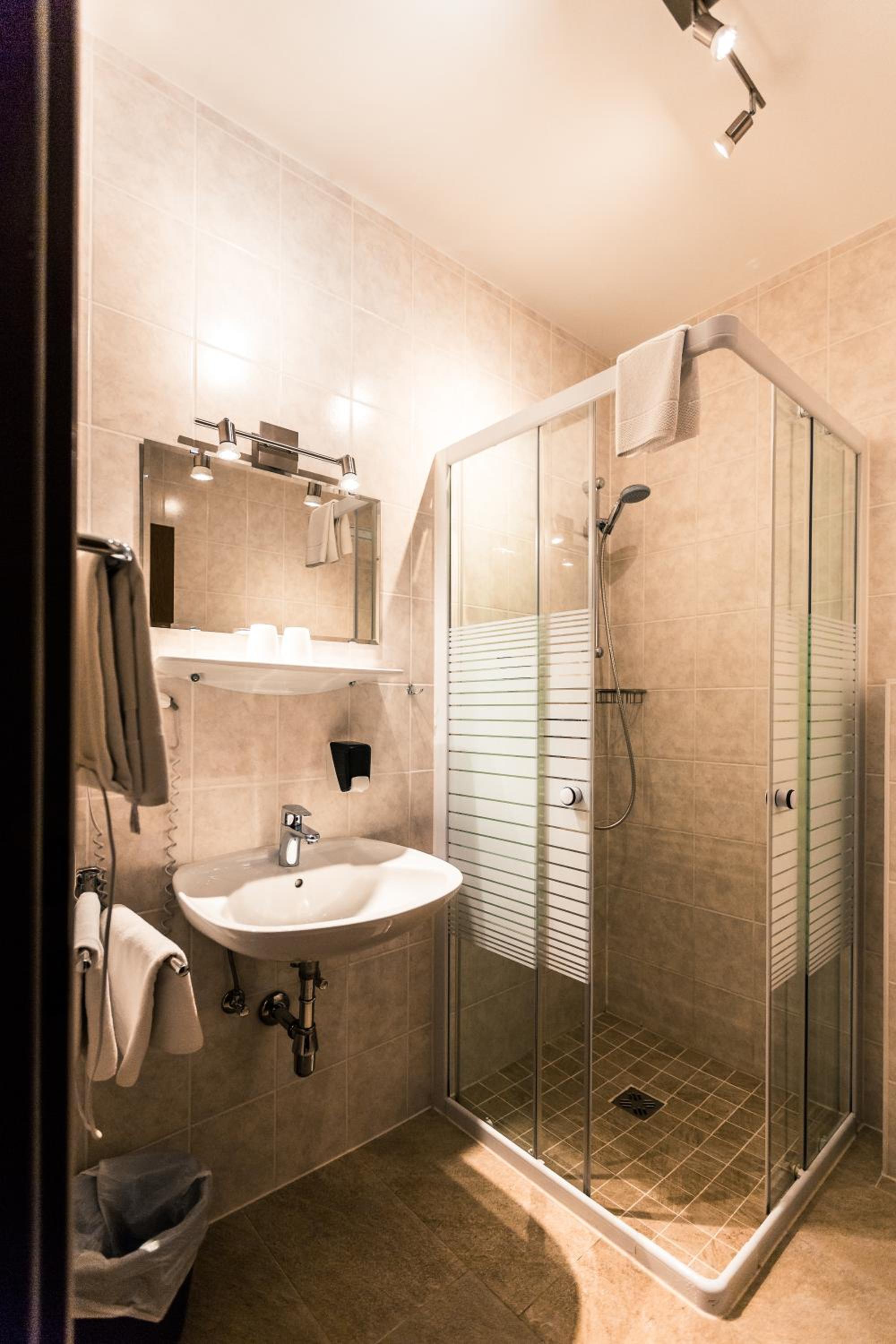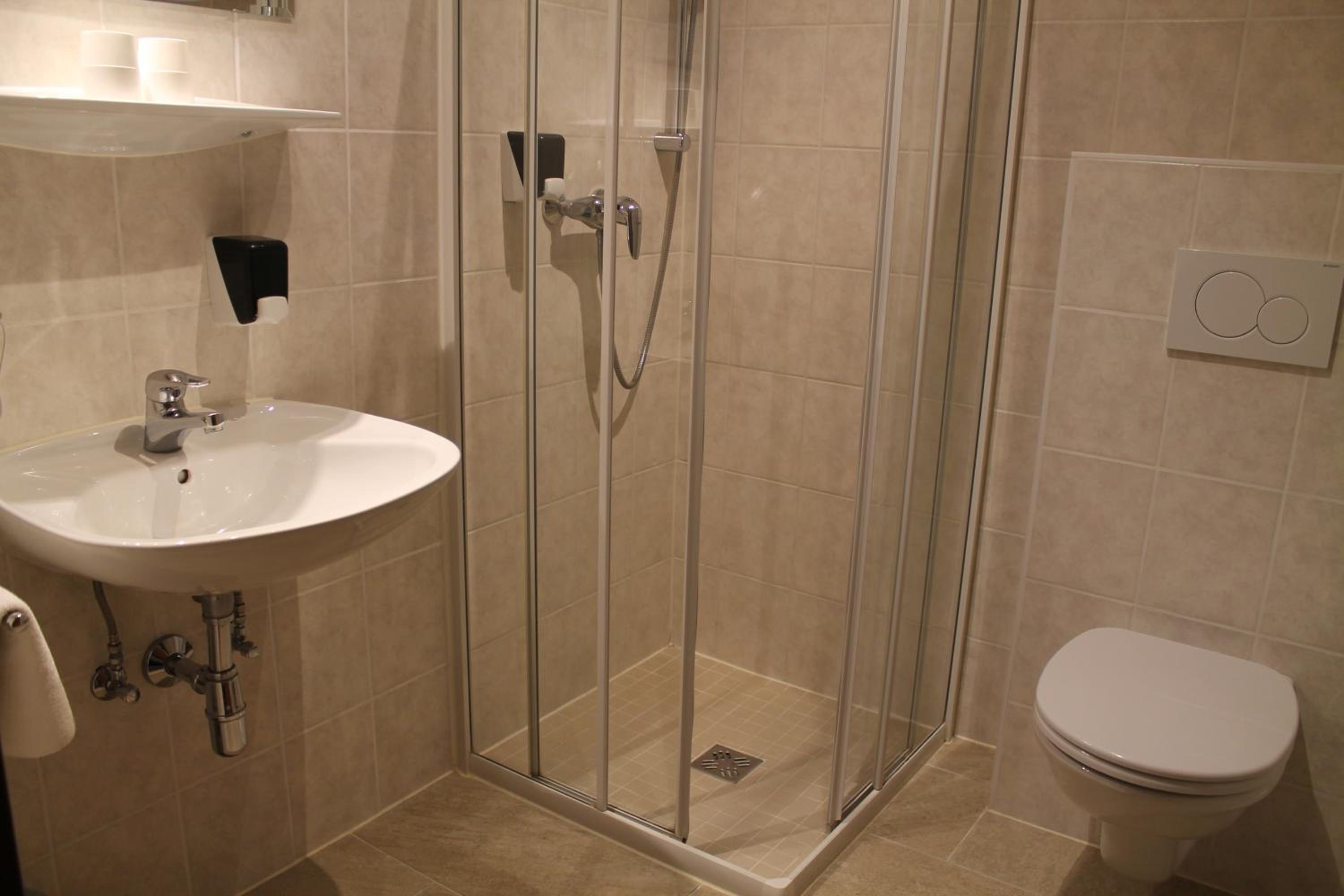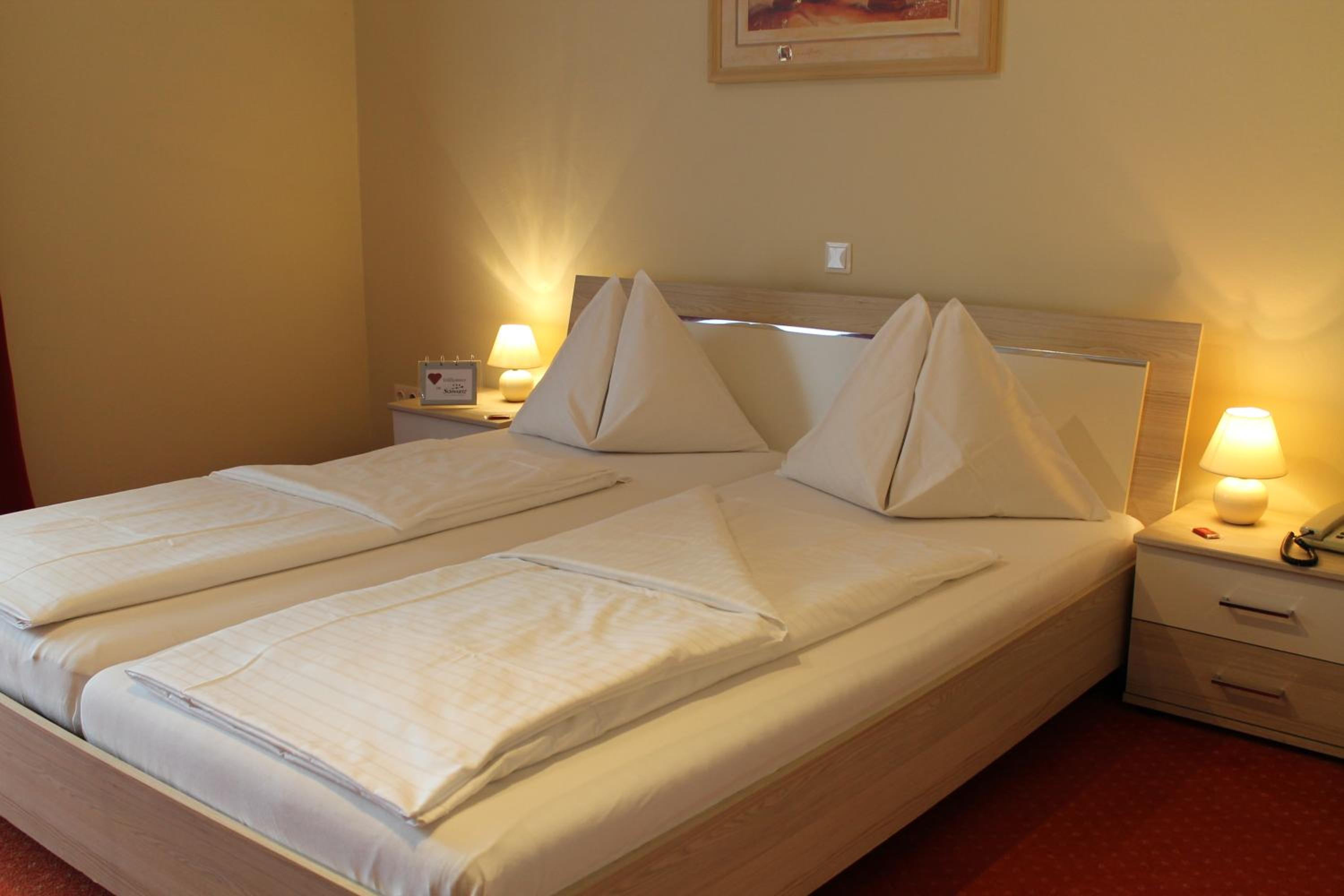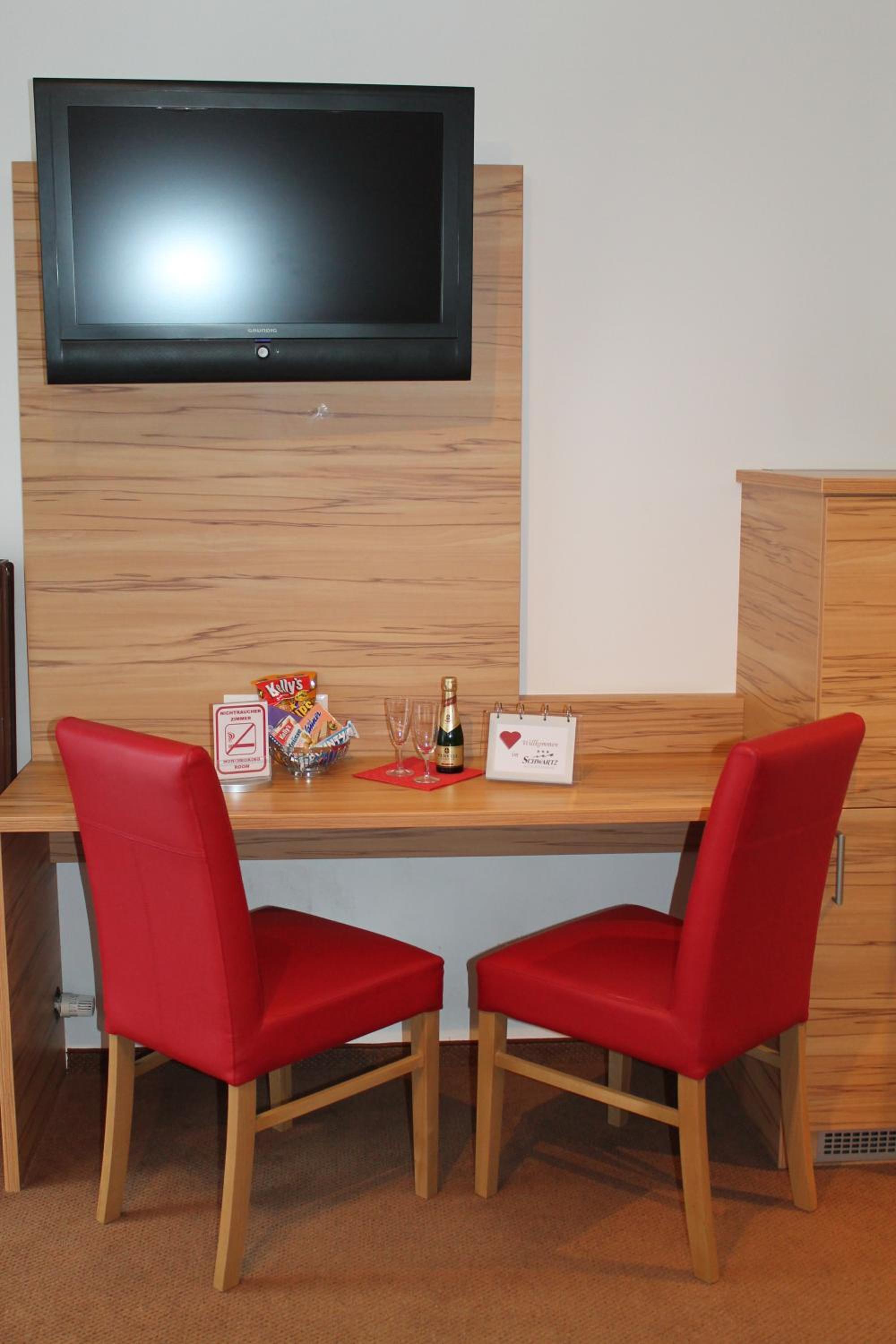 All rooms at Hotel Schwartz are equipped with a flat-screen satellite TV, a minibar, and a private bathroom, ensuring a comfortable stay for all guests.