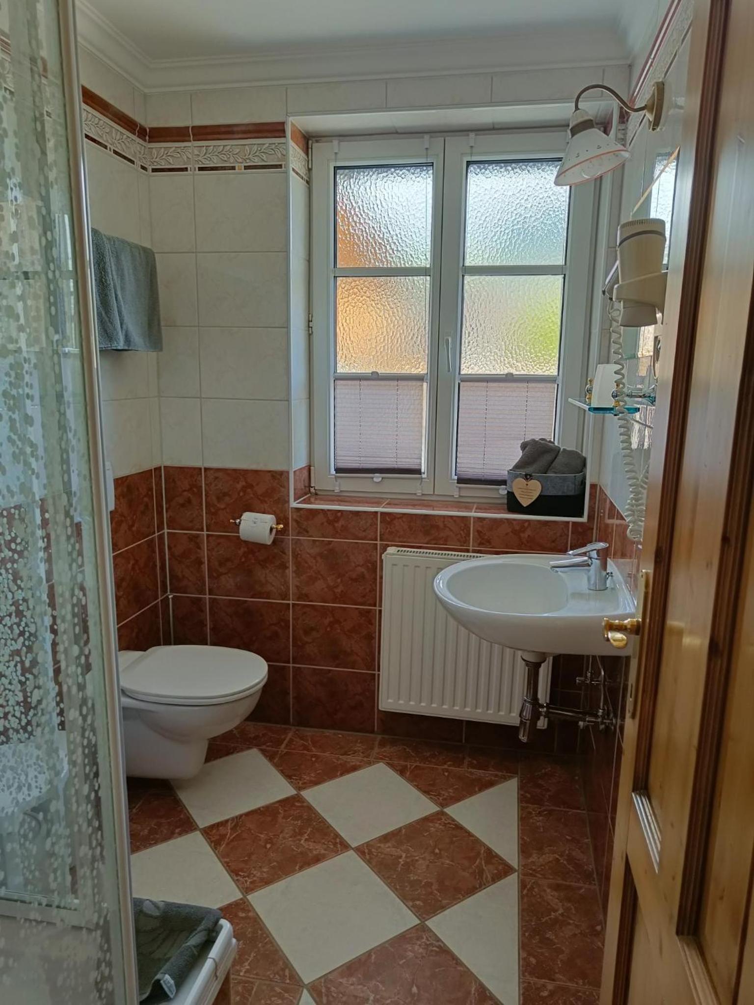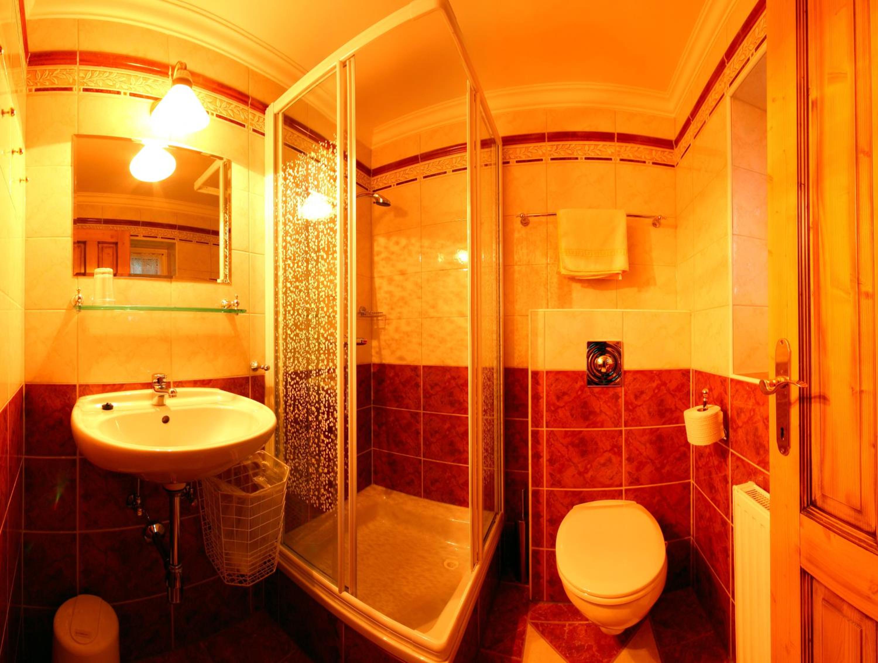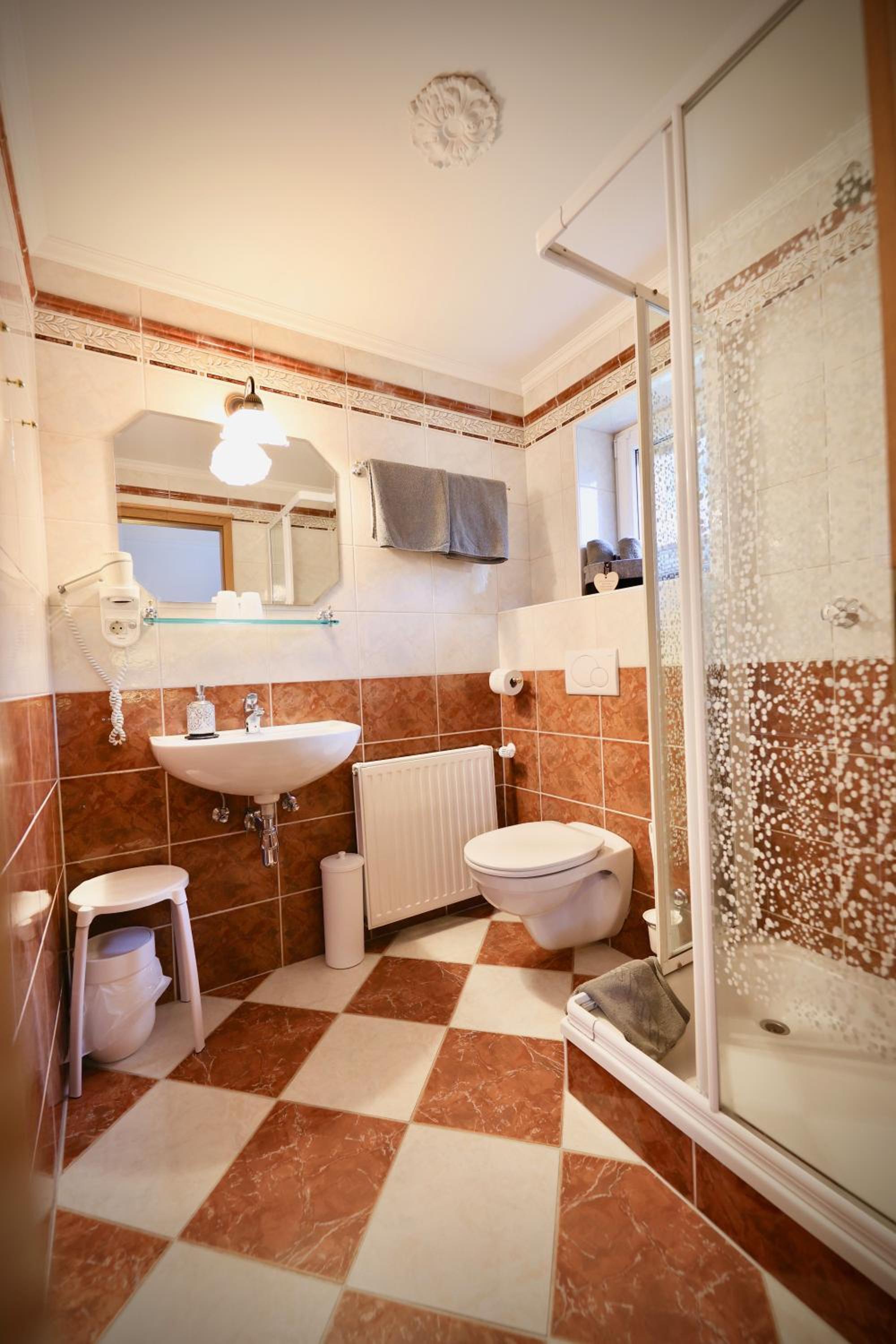 Koupelna s WC staršího vybavení, malý sprchový kout, nepříliš velký tlak vody ve sprše a málo hřející radiátor v koupelně.