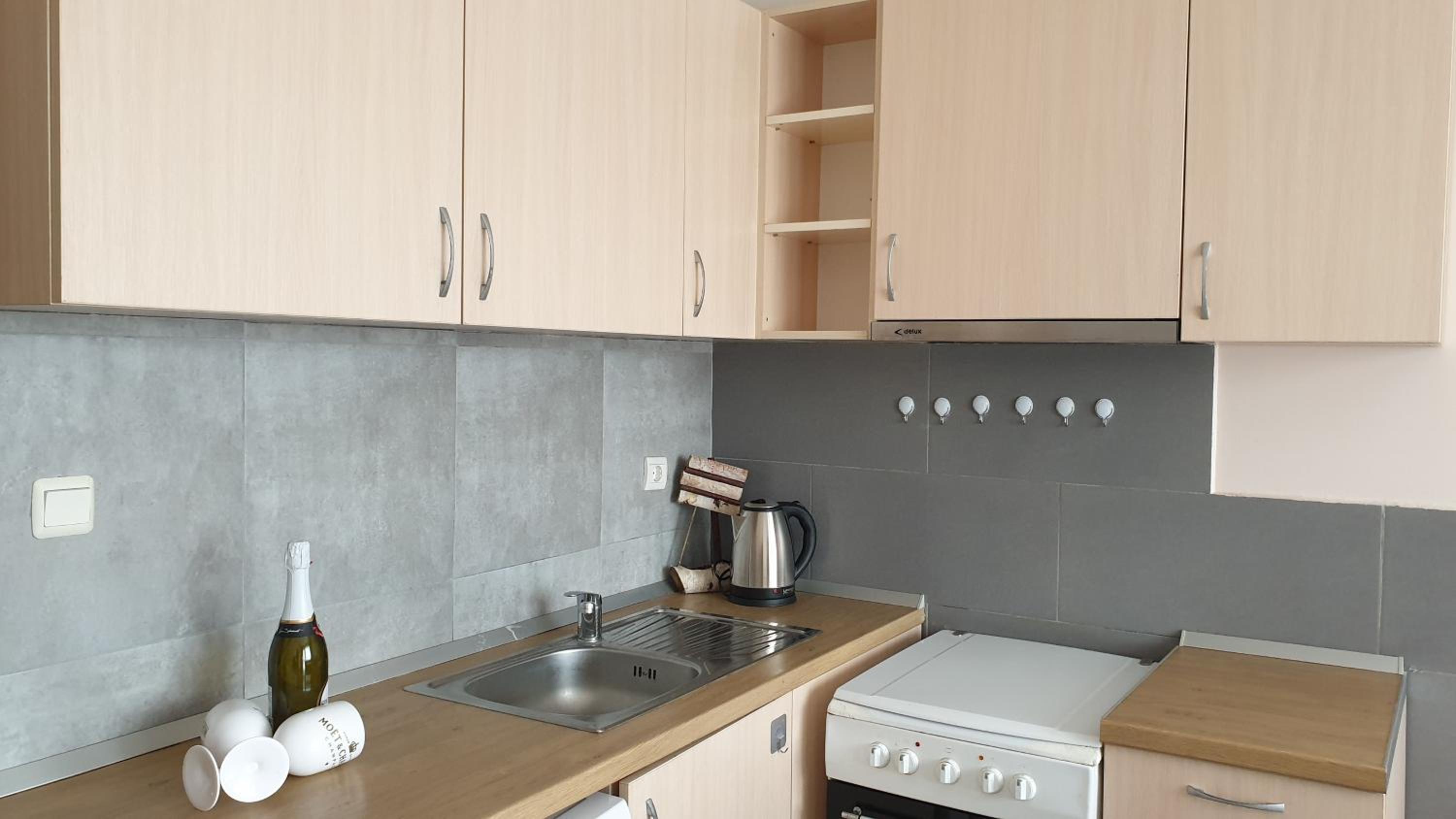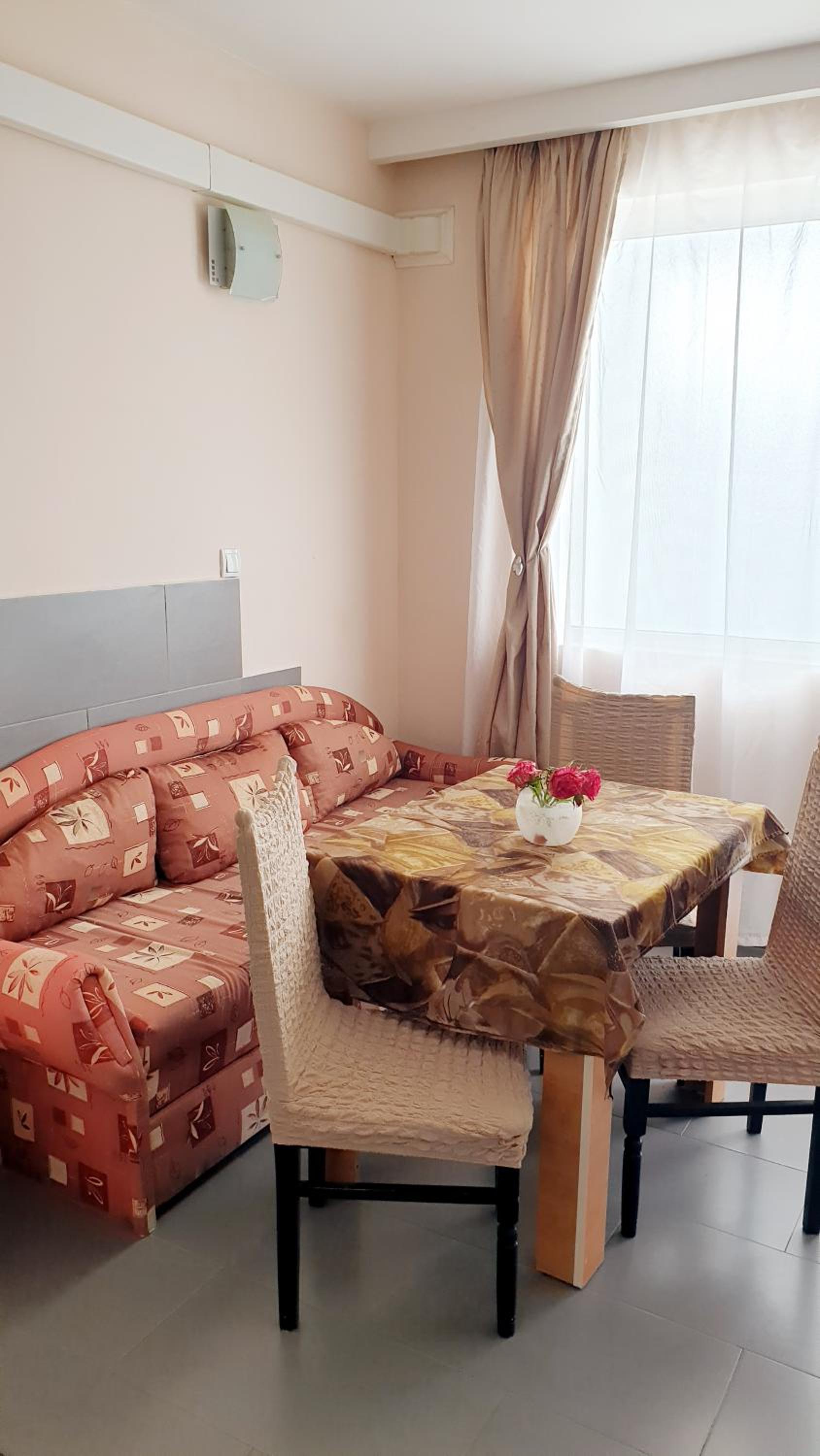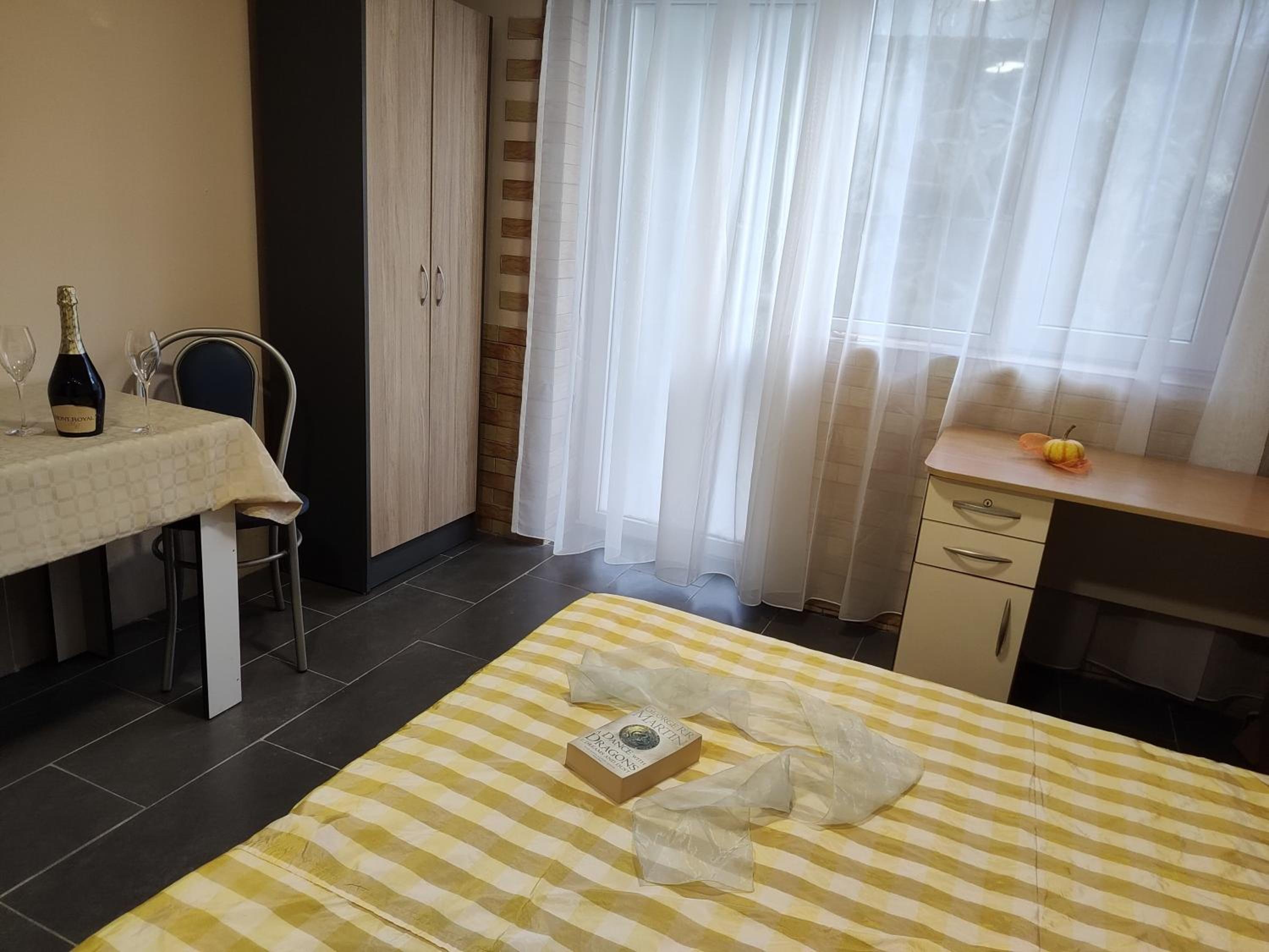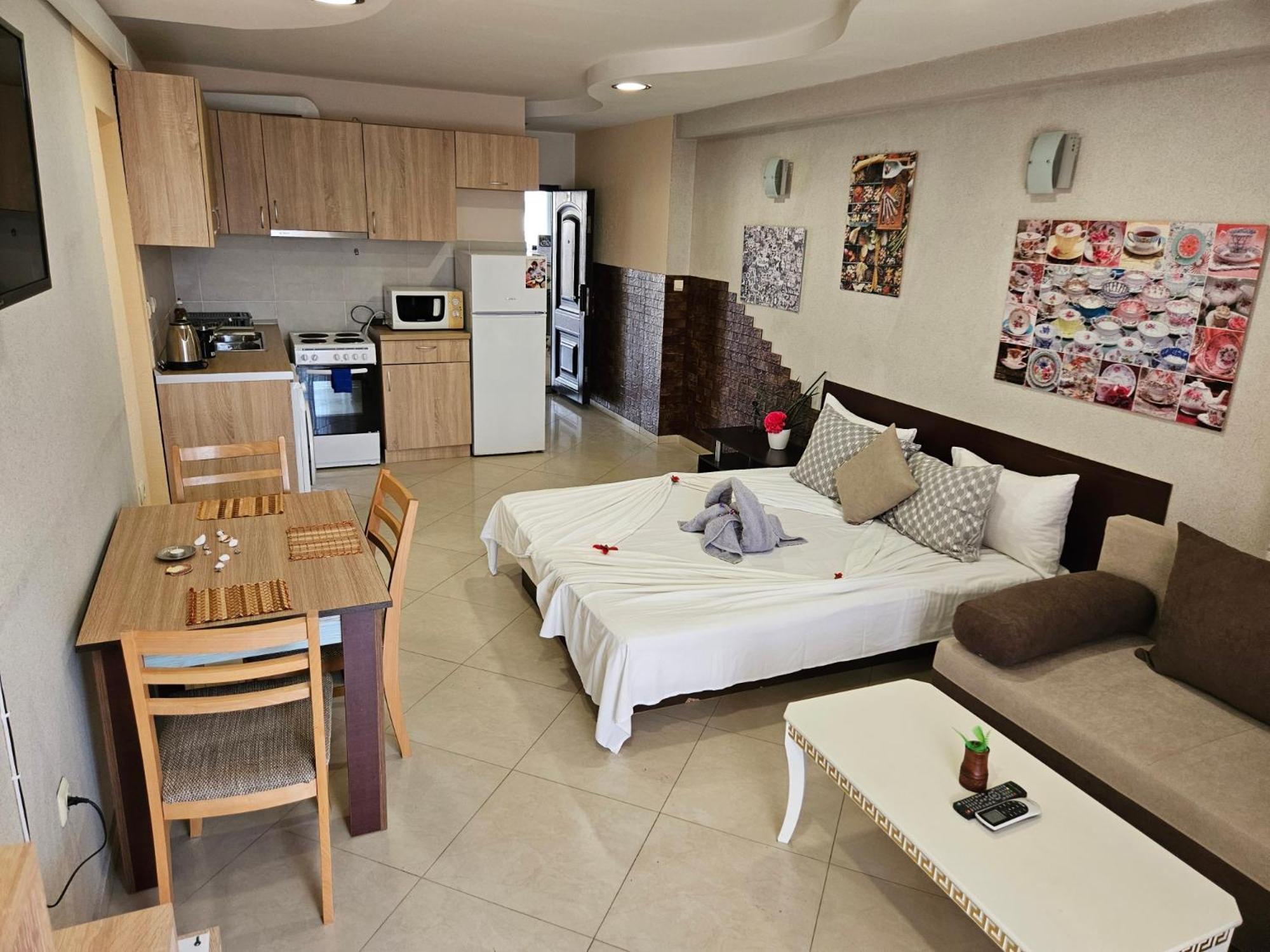Удобни и добре обзаведени стаи.Кухненската част е добре обзаведена .Има всичко необходимо за по дълъг престой.Има паркинг пред хотела.Което натежа в избора ми.