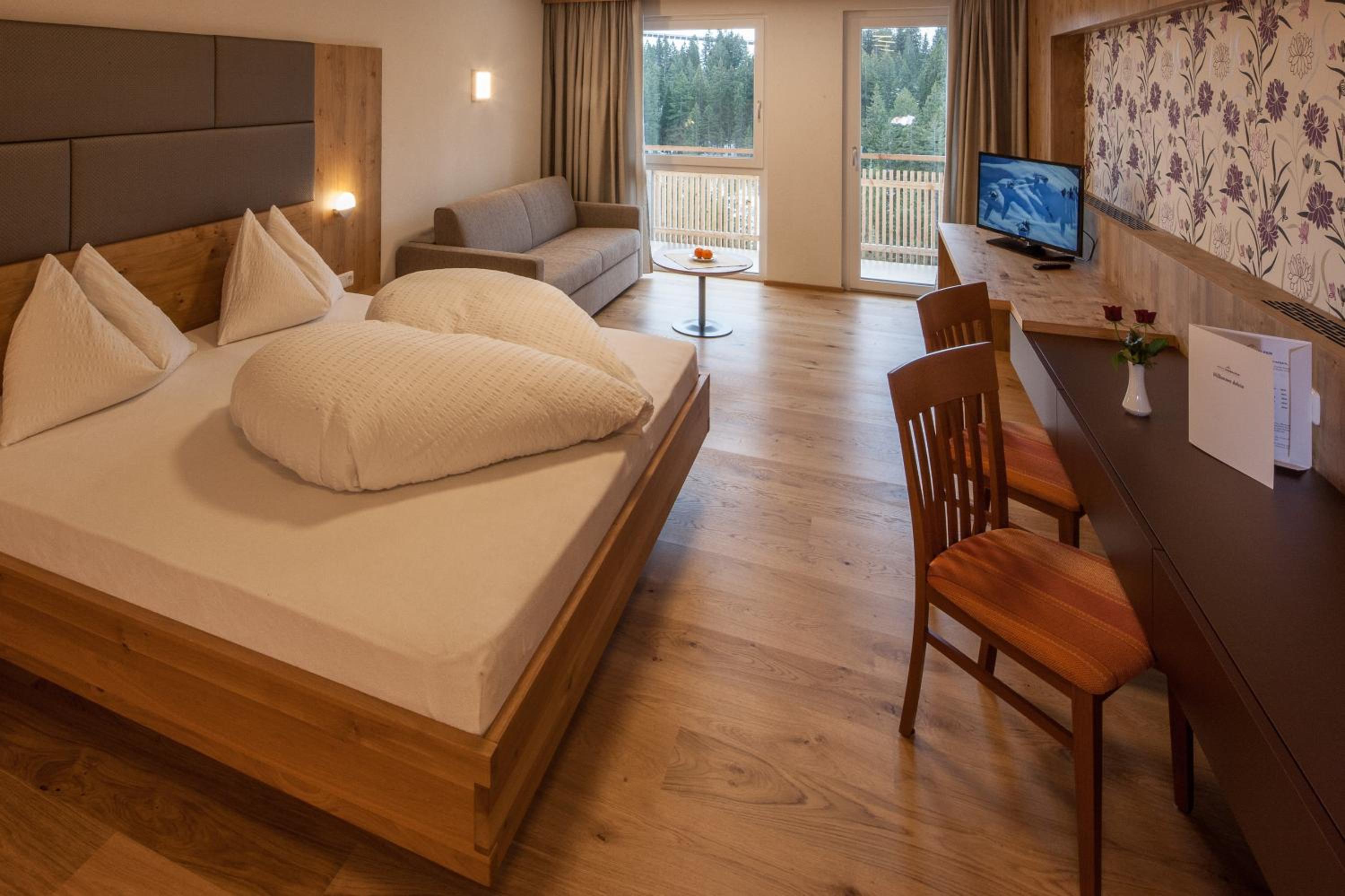 The rooms at Sonnalp are thoughtfully decorated with classic mountain accents and feature amenities like TV, work desk, and alarm clock for a comfortable stay.
