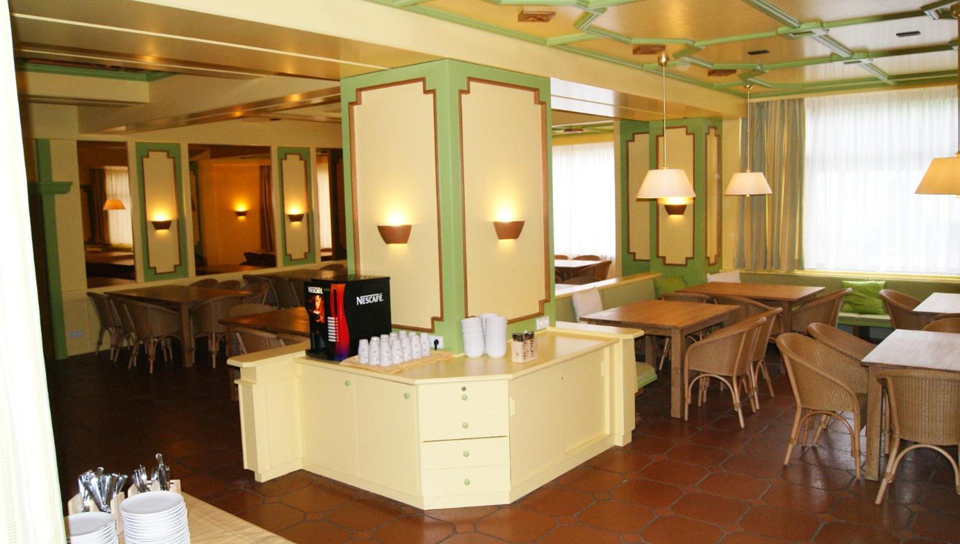 Verouderde kamers, ontbijtruimte.