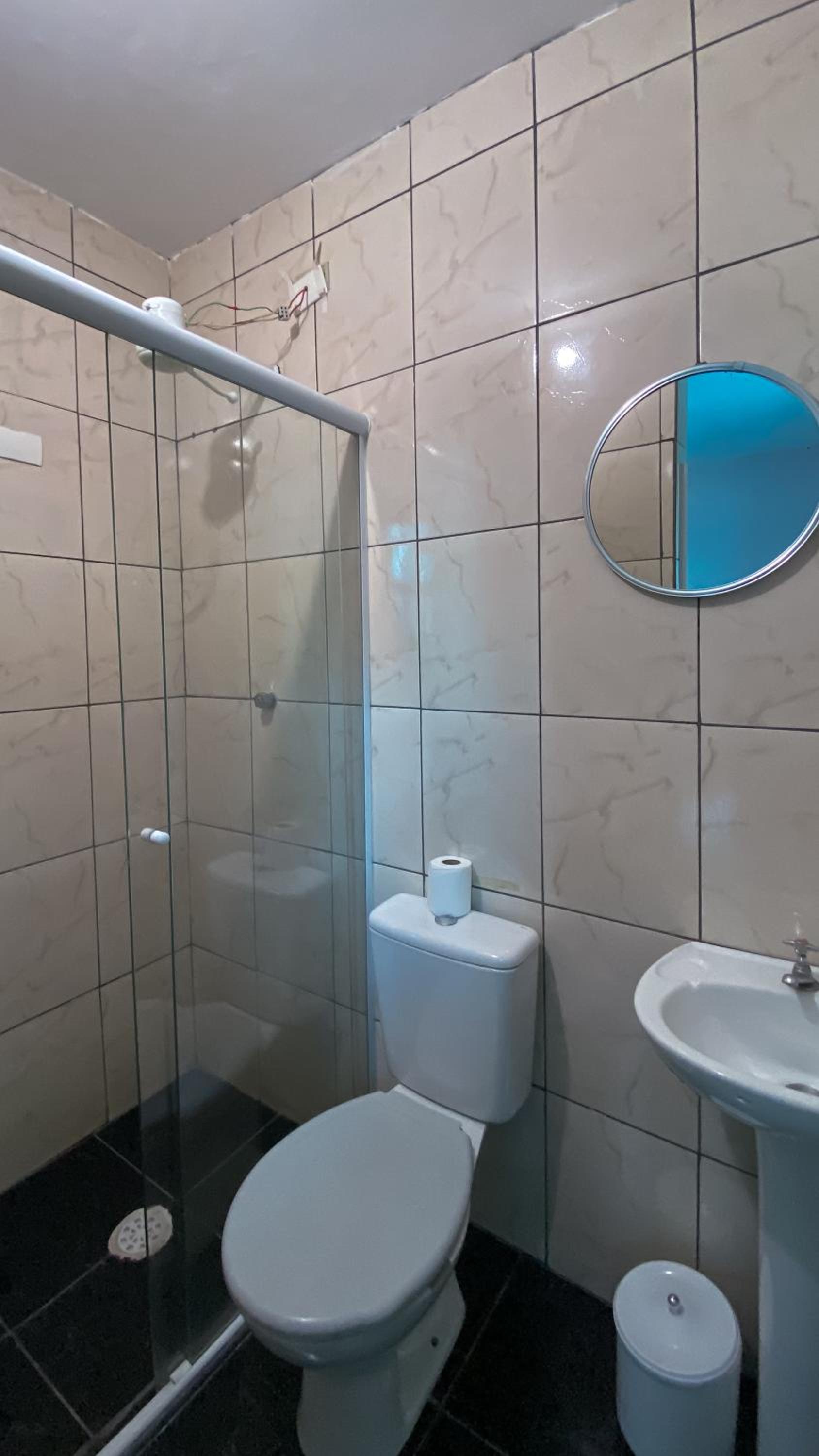 Não tem box no banheiro. Colchão ruim. O lustre do quarto deixa escuro, sem ele seria claro como o banheiro!