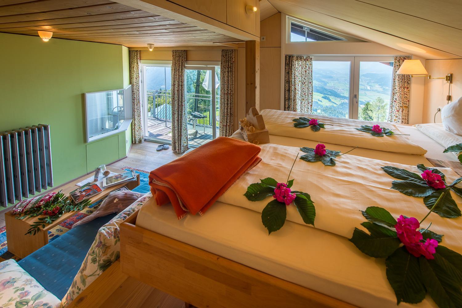 Relax in allergy-free rooms furnished with untreated wood, boasting balconies overlooking the picturesque landscape. Each room features an en-suite bathroom with luxurious amenities.
