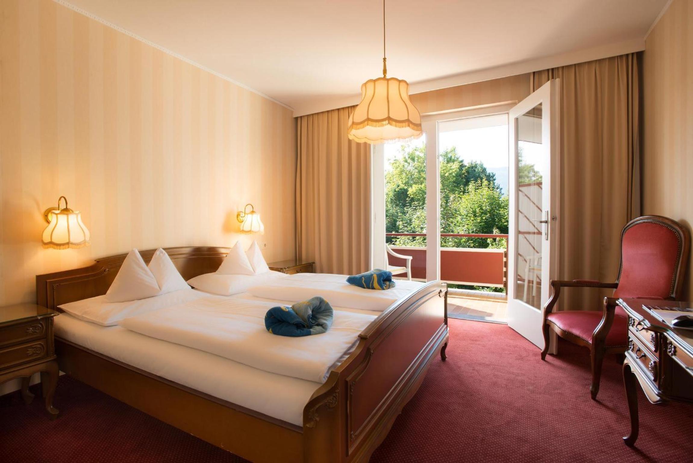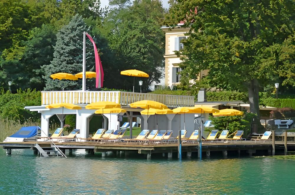 Lakefront Luxury: With its private swimming beach along Lake Wörth, guests are just steps away from stunning views of Maria Wörth church across the water.