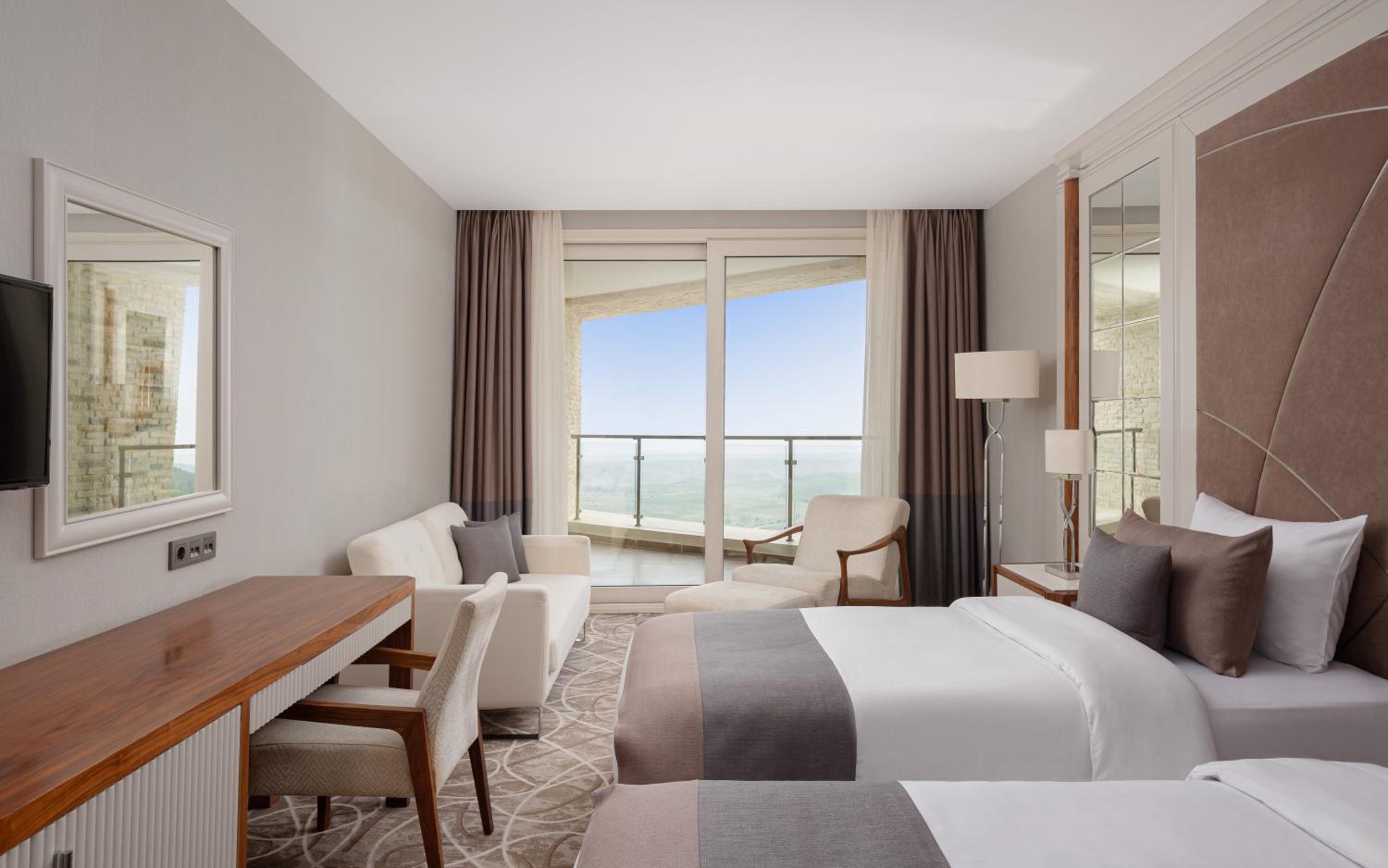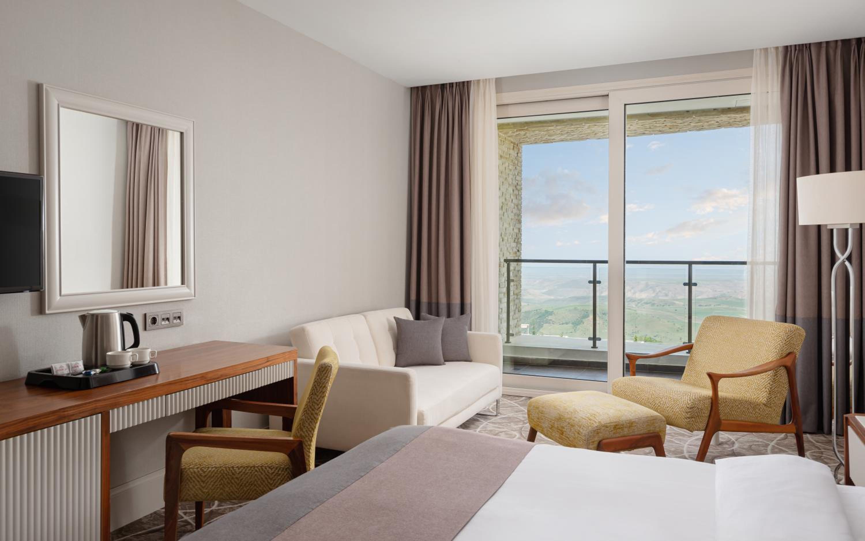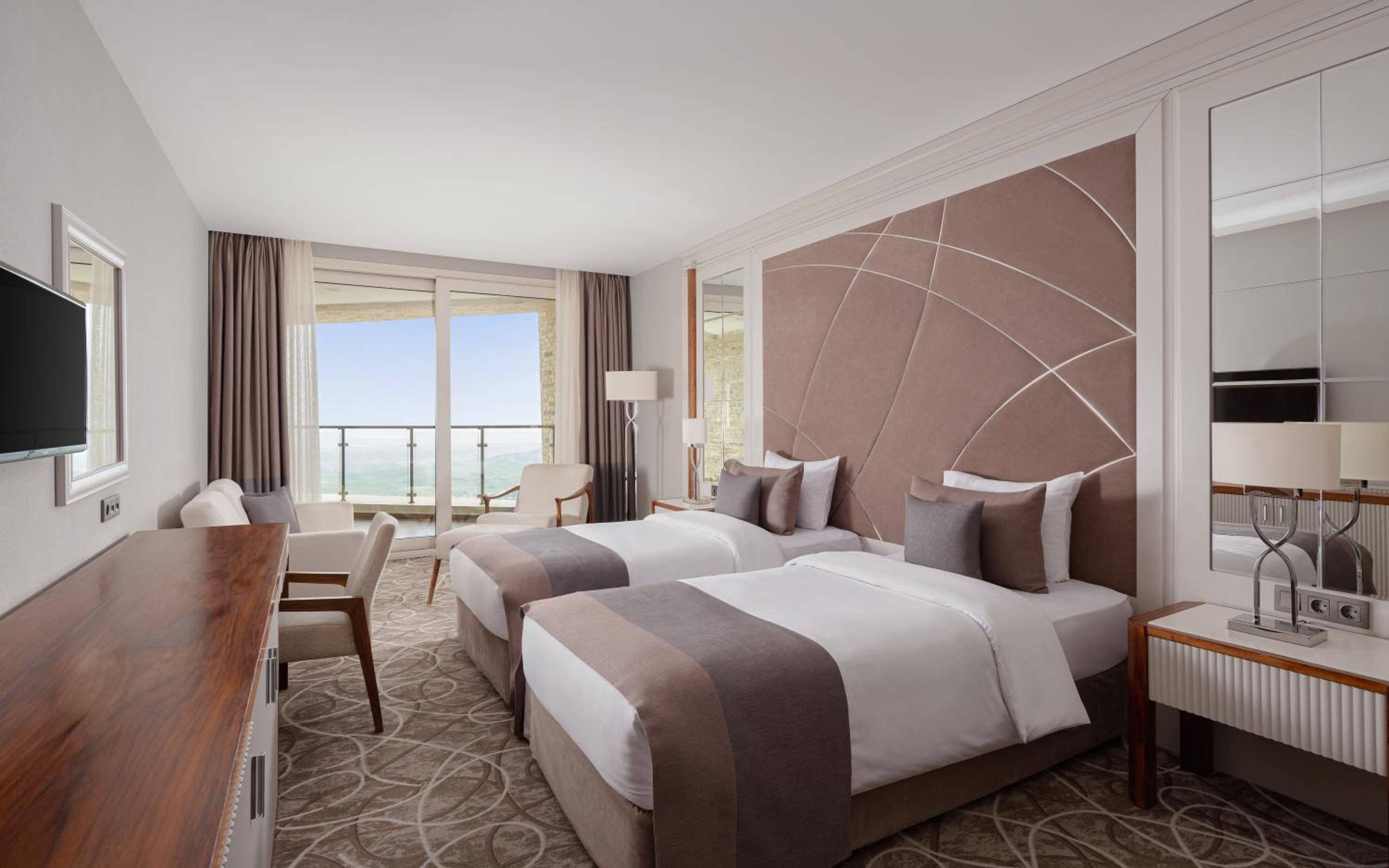 Indulge in a stay at Qalaalti Hotel & Spa, offering elegant rooms with sea or mountain views, spa baths, and comfortable seating areas.