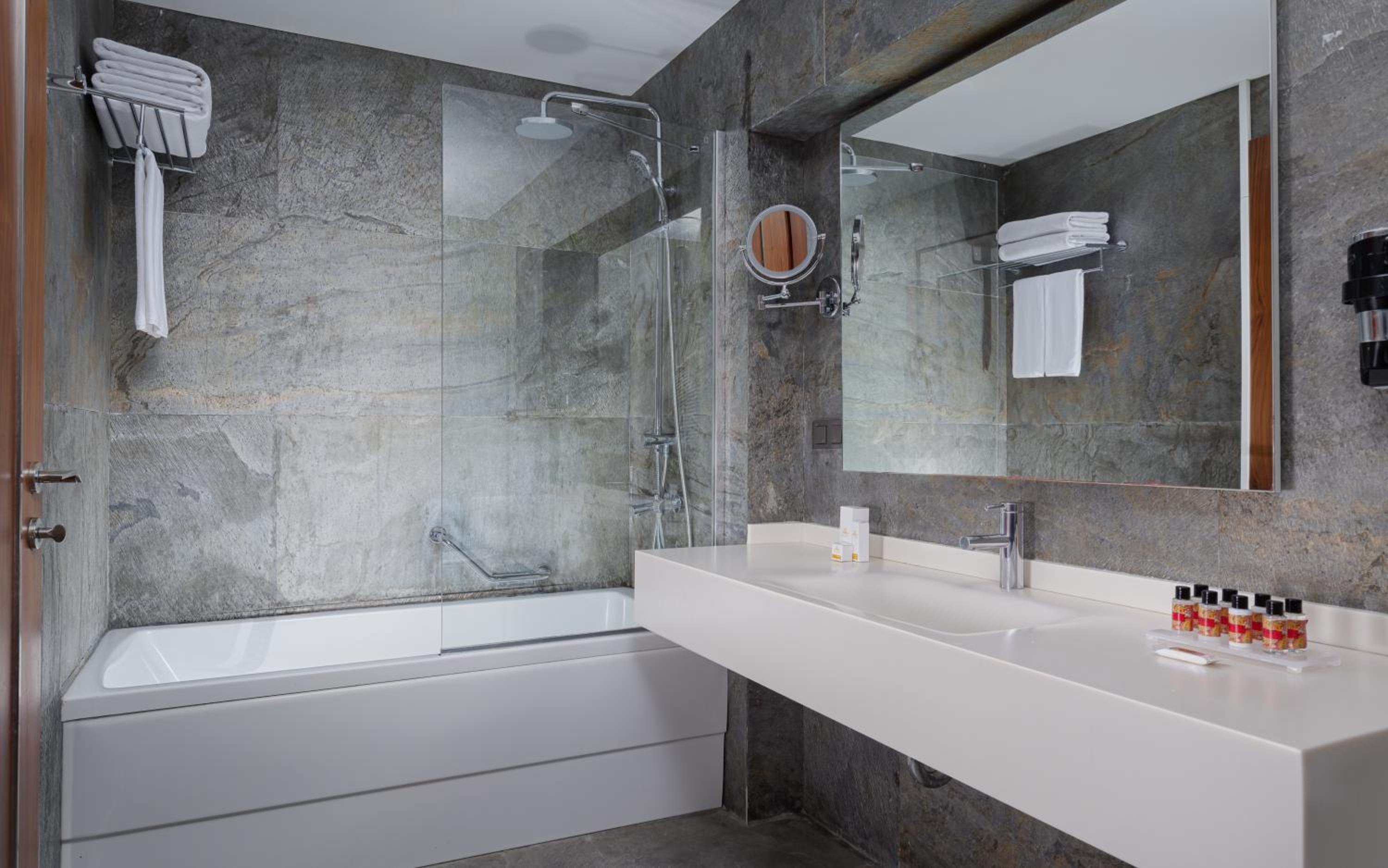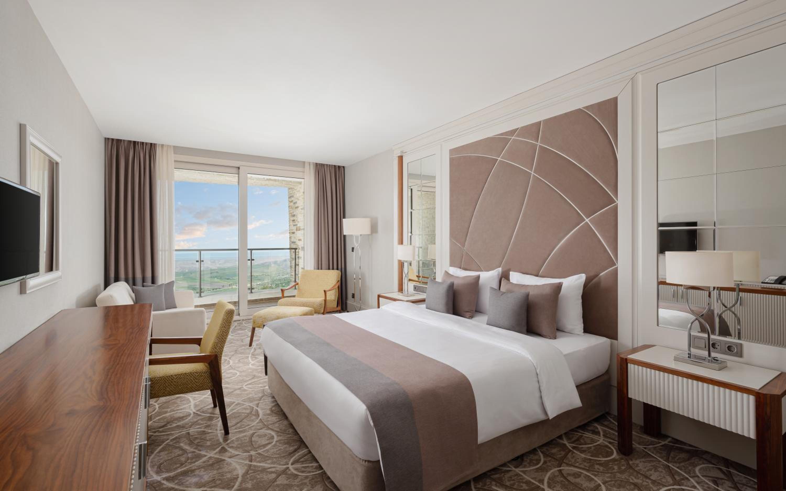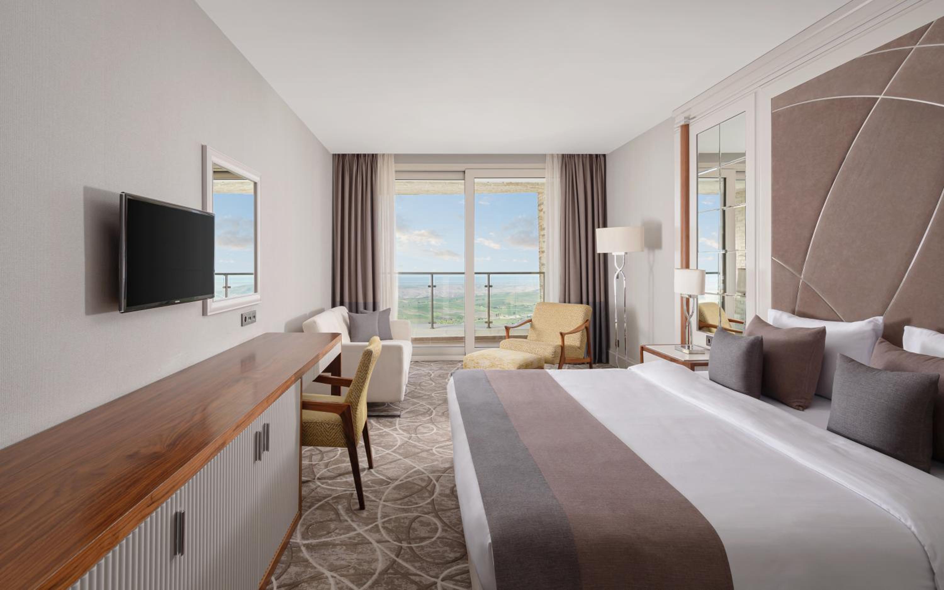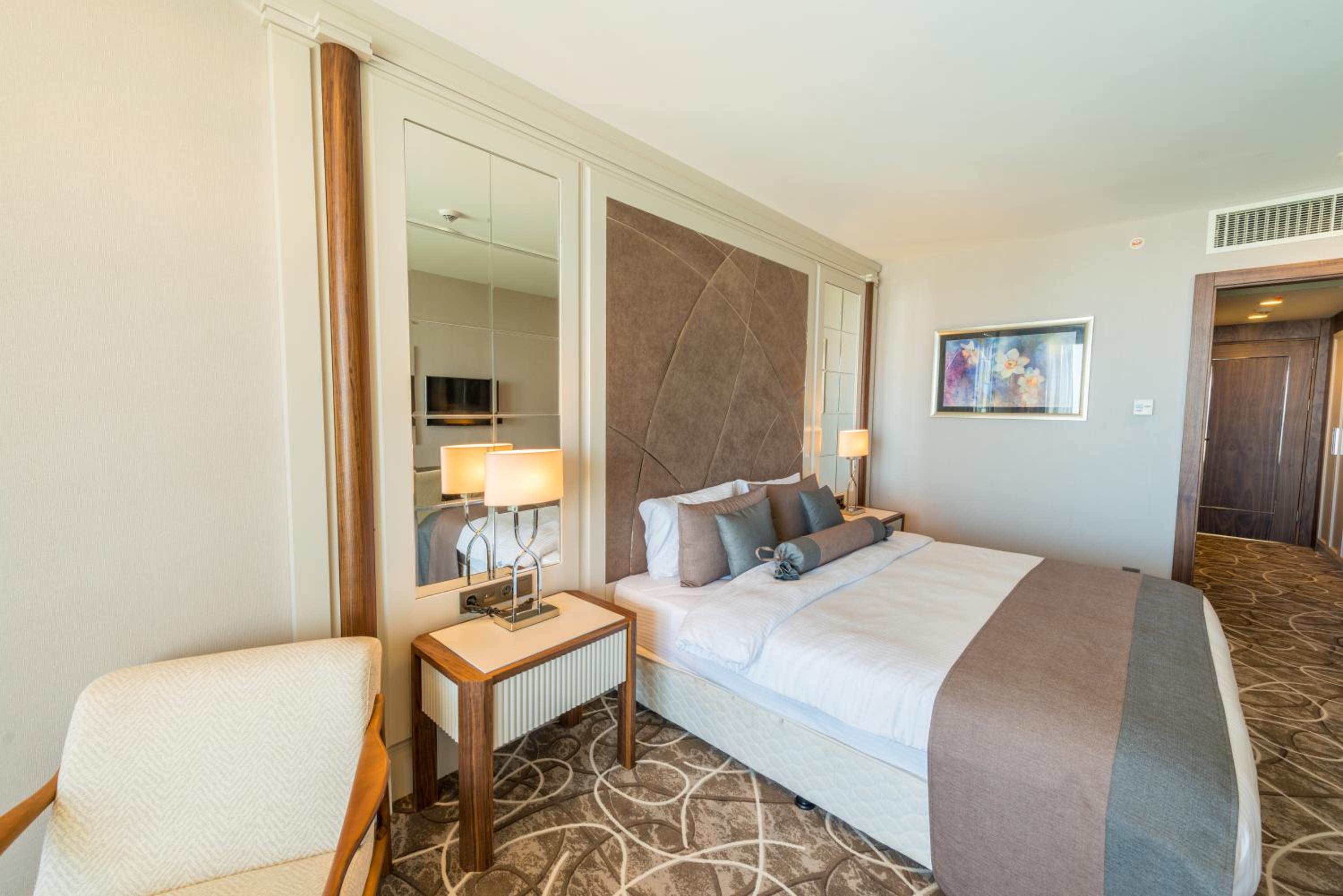 Indulge in a stay at Qalaalti Hotel & Spa, offering elegant rooms with sea or mountain views, spa baths, and comfortable seating areas.