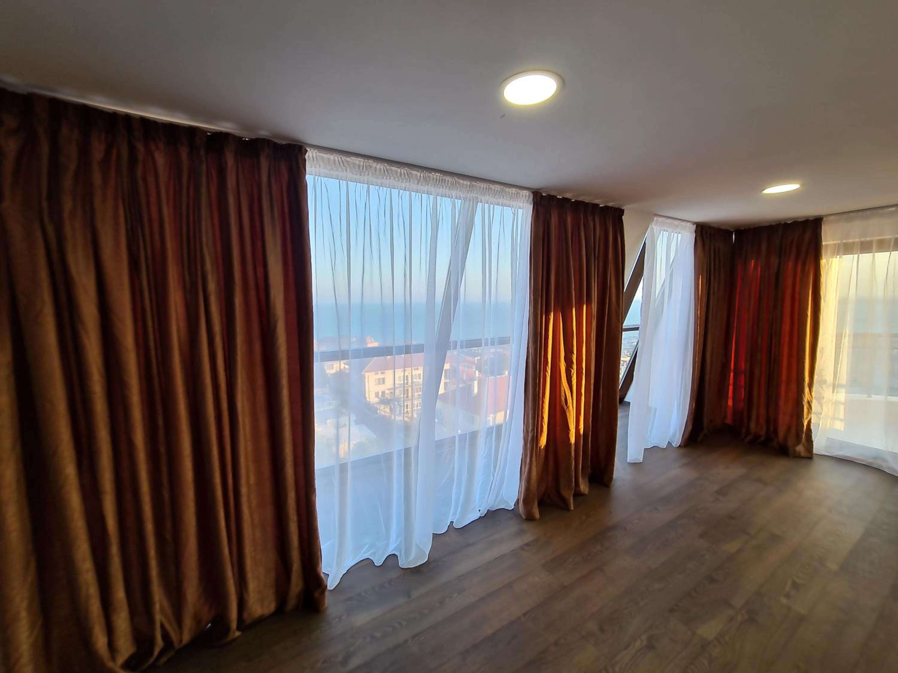 В комнате с панорамными окнами утром и днём очень жарко, кондиционер не справлялся.