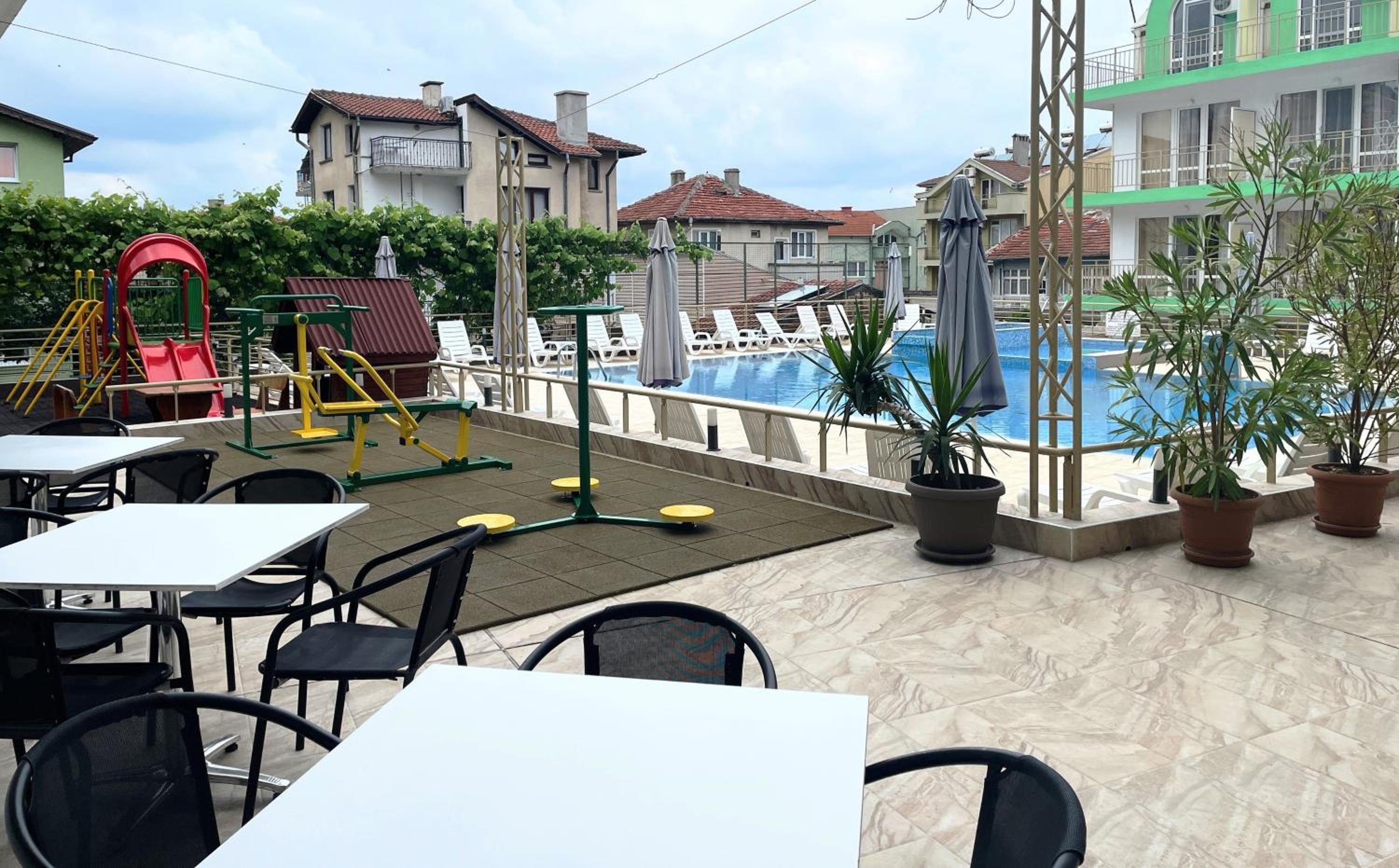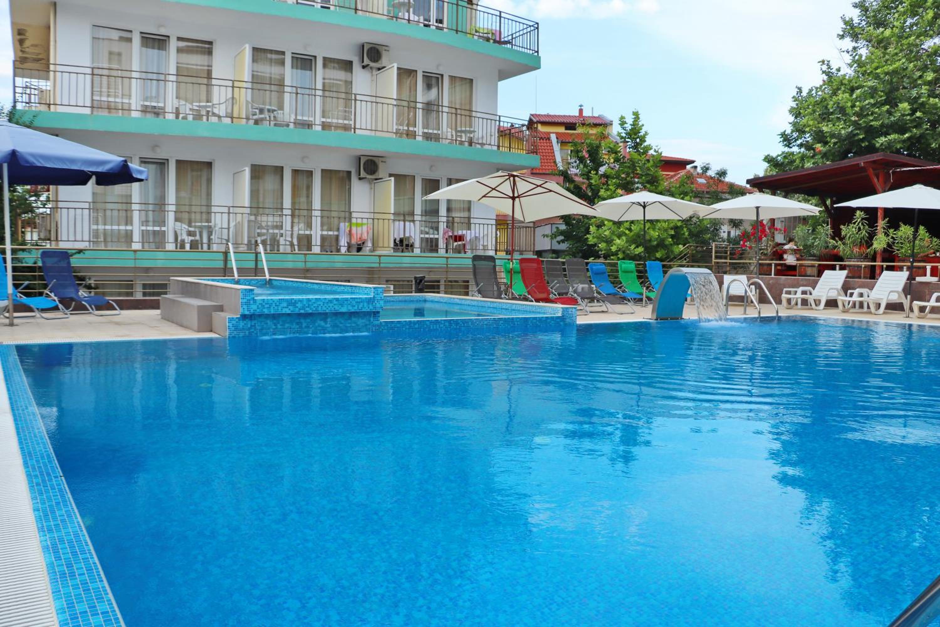 Басейна е голям и чист, но водата е много хлорирана. Закуската е хубава, храната в ресторанта е вкусна, персоналът е мил и любезен.