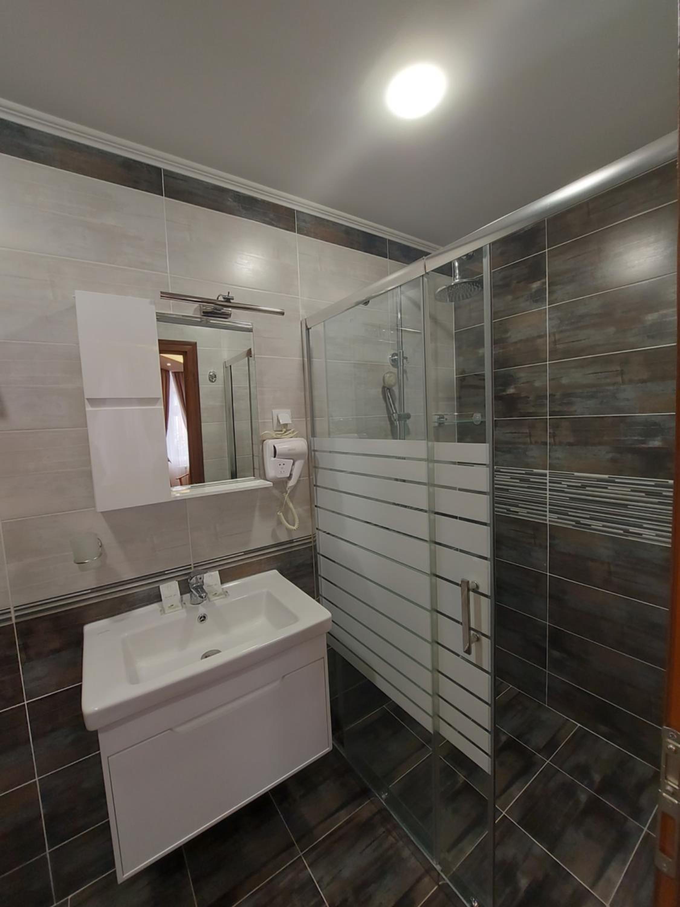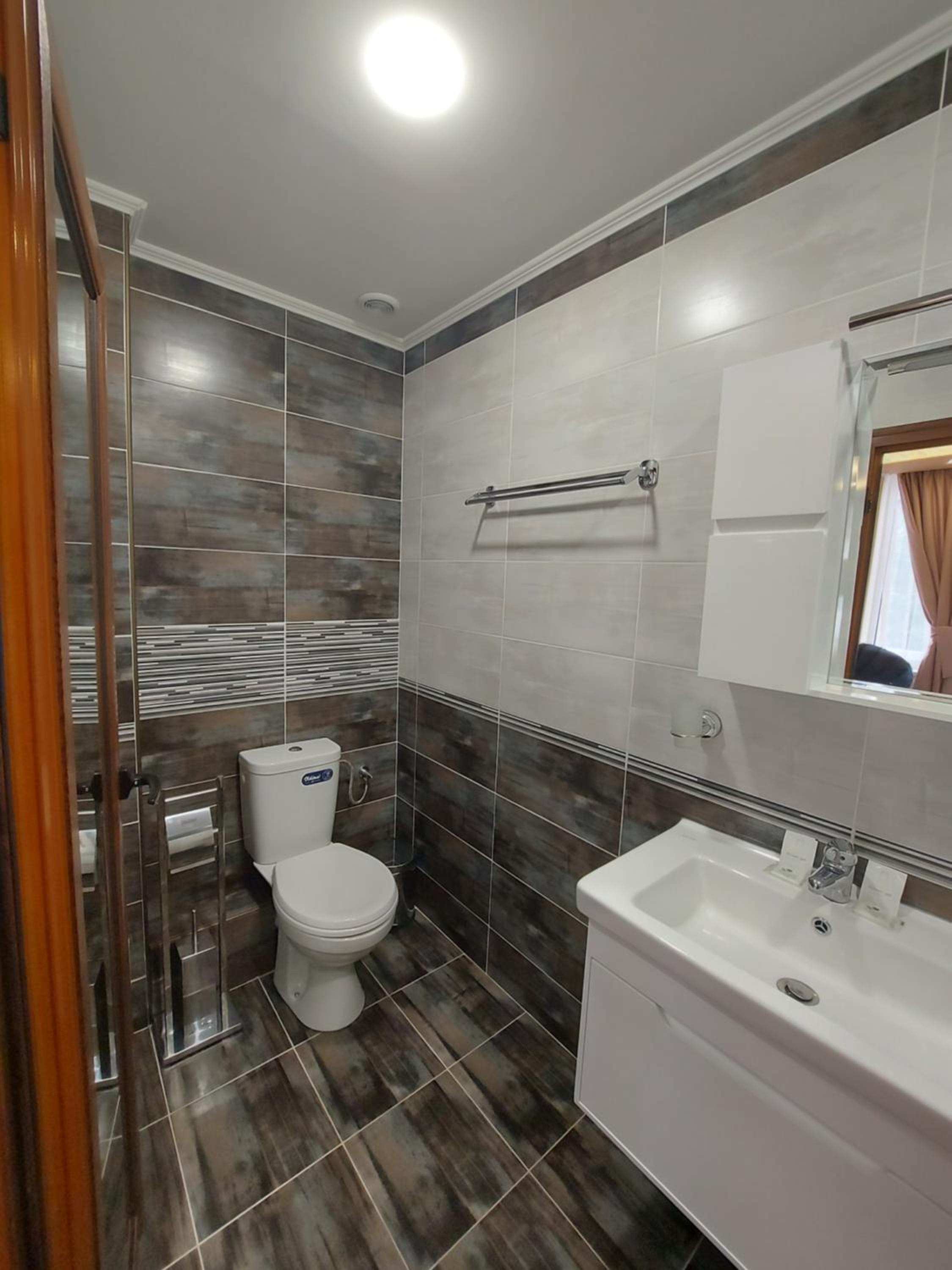 Банята към стаята не беше ок. Сбутата в някакво помещение с огромен скос. Ако си по висок от 1.70 не може да се изкъпеш нормално. Или си удрях главата в скоса или допирах тоалетната чиния. Определено чувството не беше готино. Хубаво е да качвате снимки и на баните, поне да знаят хората каква стая да си запазят.