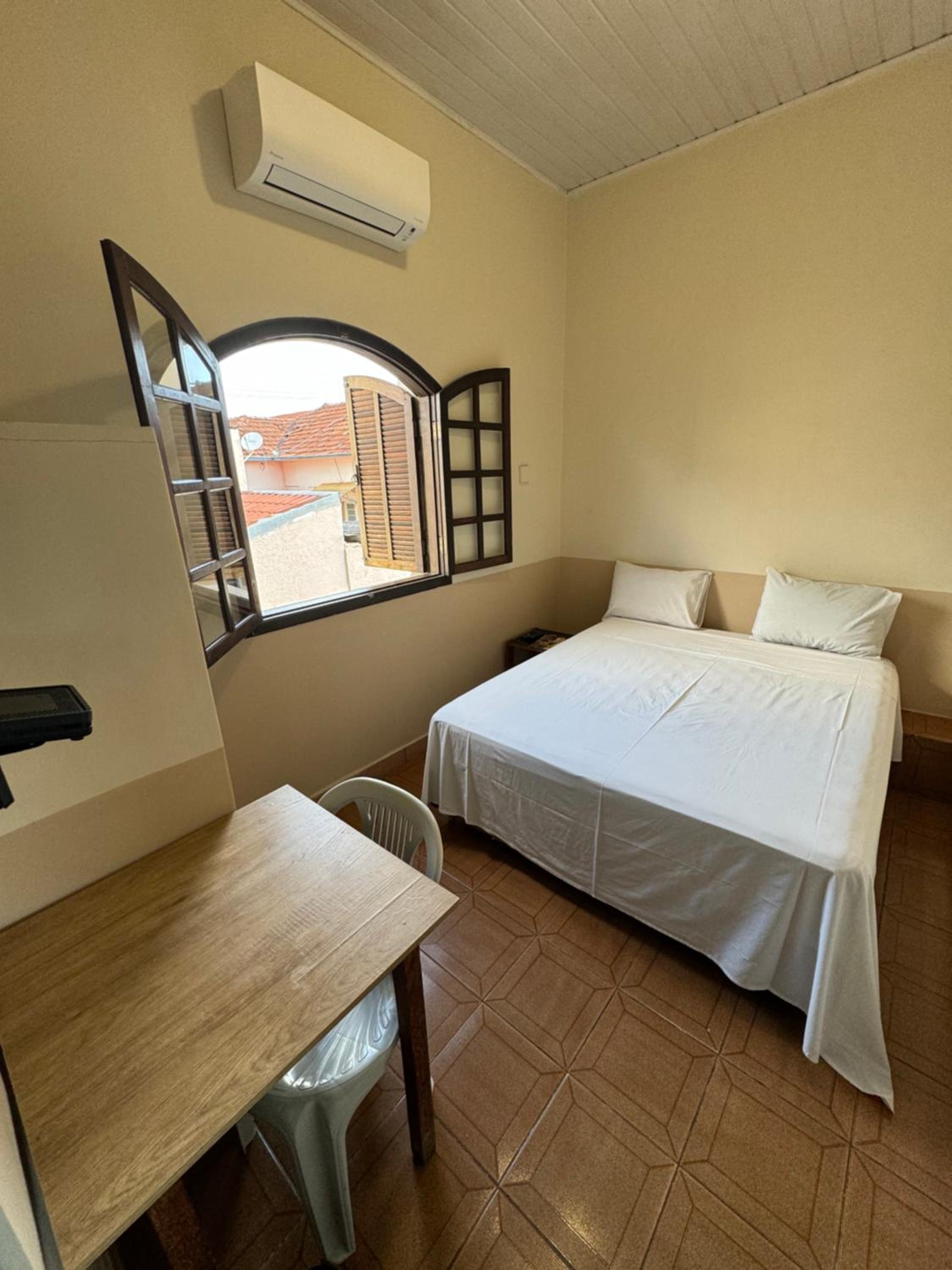 Suíte de bom tamanho e um pé direiyo bem alto, com ar condicionado, os lençóis bem limpinhos, banheiro com aparência de recém reformado, toalhas limpinhas e super macias.