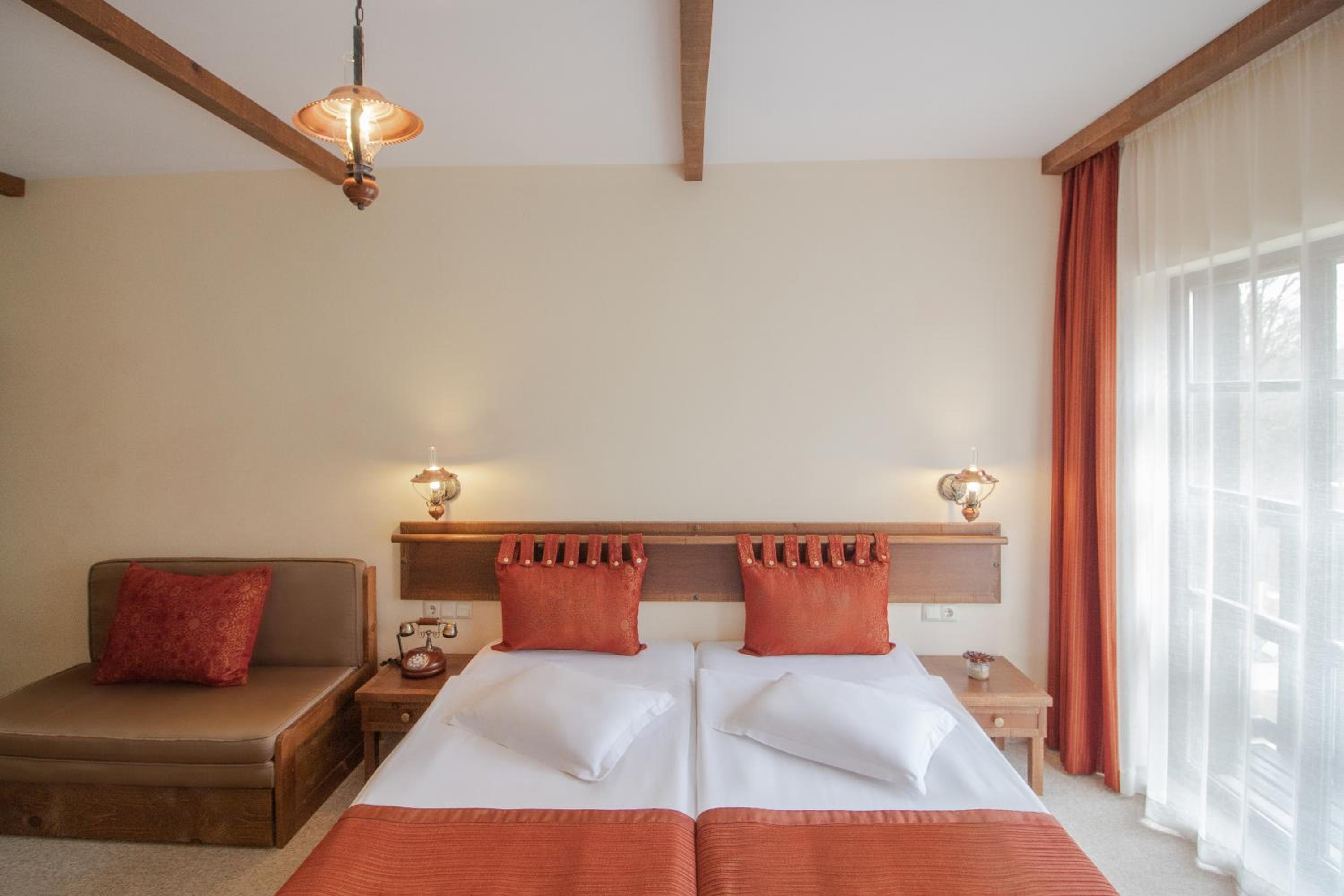 Cozy Rooms with Modern Comforts: Experience comfort in the traditionally decorated rooms with wooden floors, air conditioning, satellite TV, and private bathrooms.
