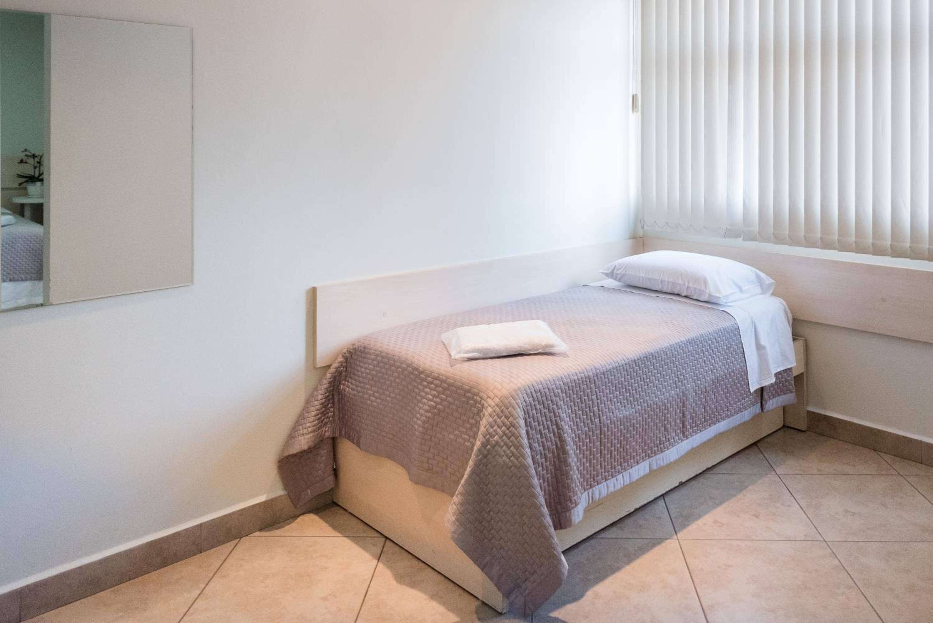Quarto desprovido de qualquer decoração, nem um abajur ou uma luz mais indireta. Lençol de cama remendado.