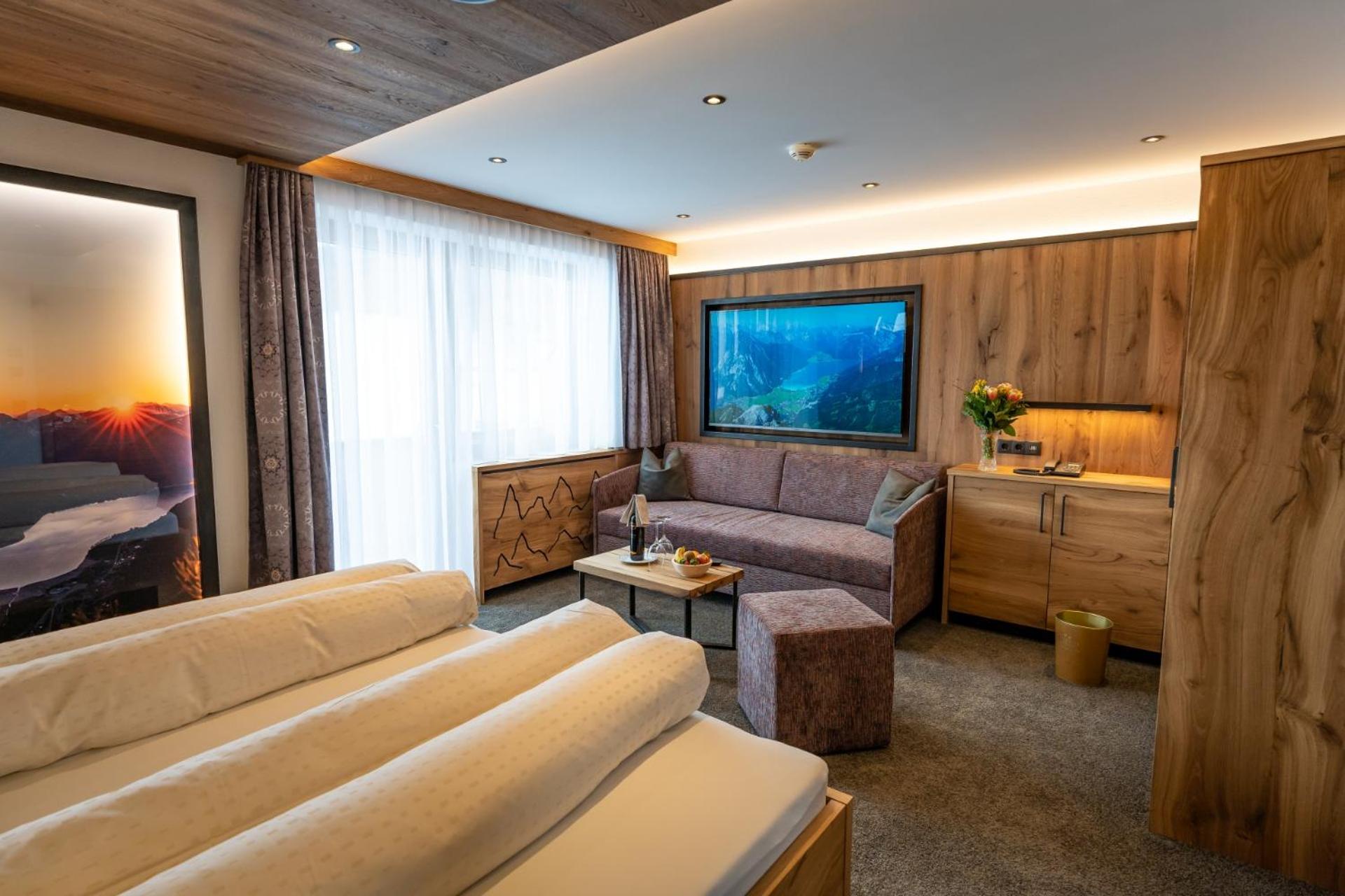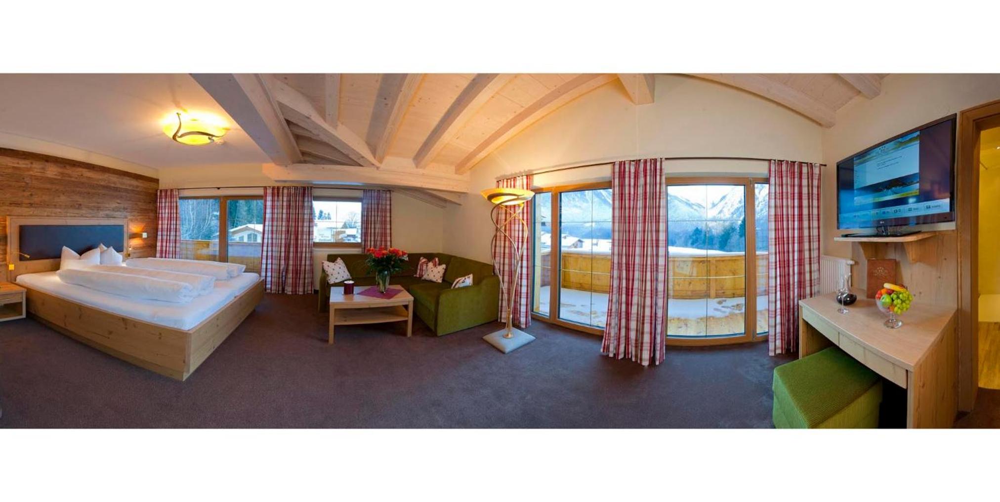 The Hotel Huber Hochland offers stunning panoramic views of the Bannwald Forest and Maurach countryside from its fitness and relaxation rooms with floor-to-ceiling windows. Most rooms also come with a balcony for guests to enjoy the picturesque surroundings.