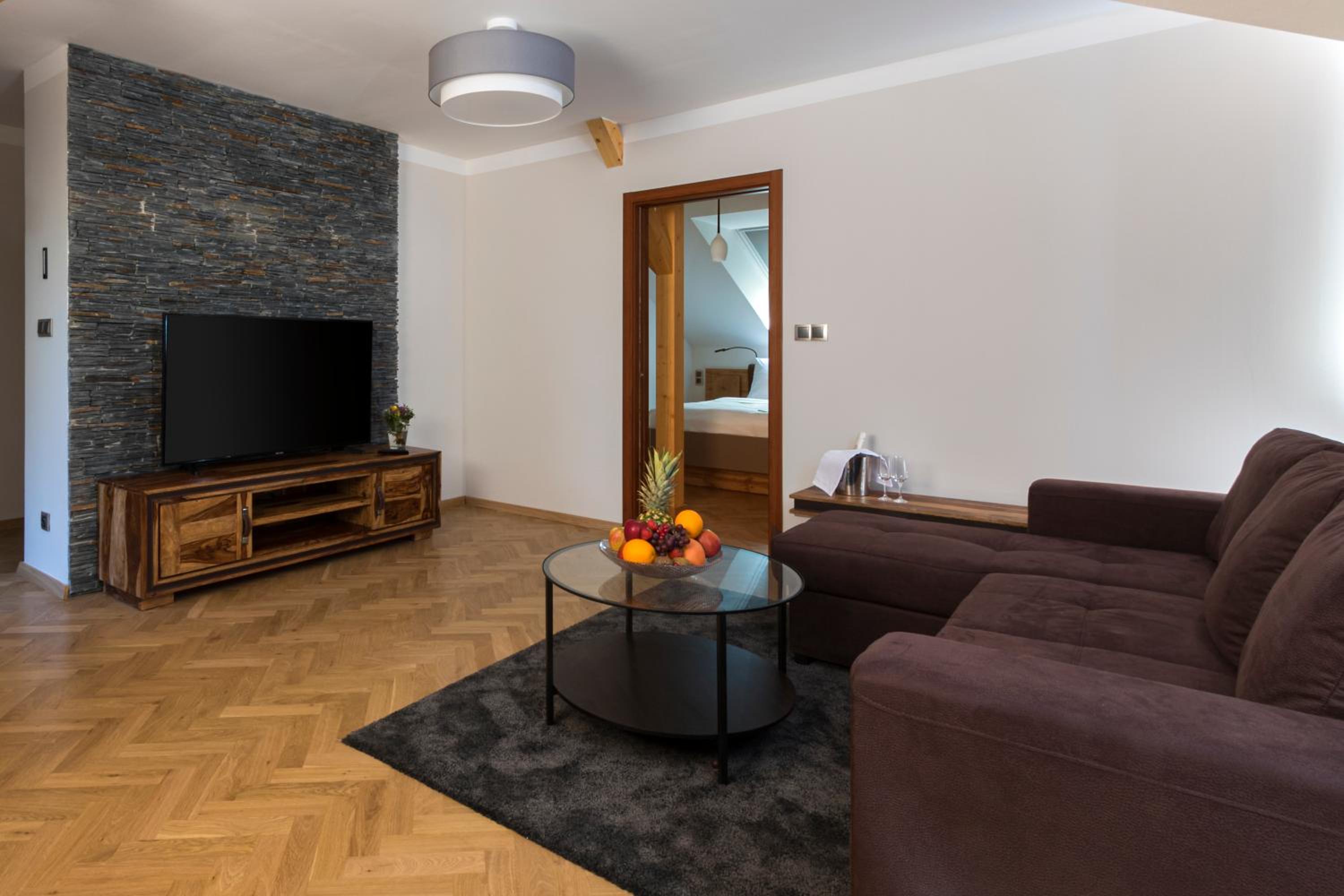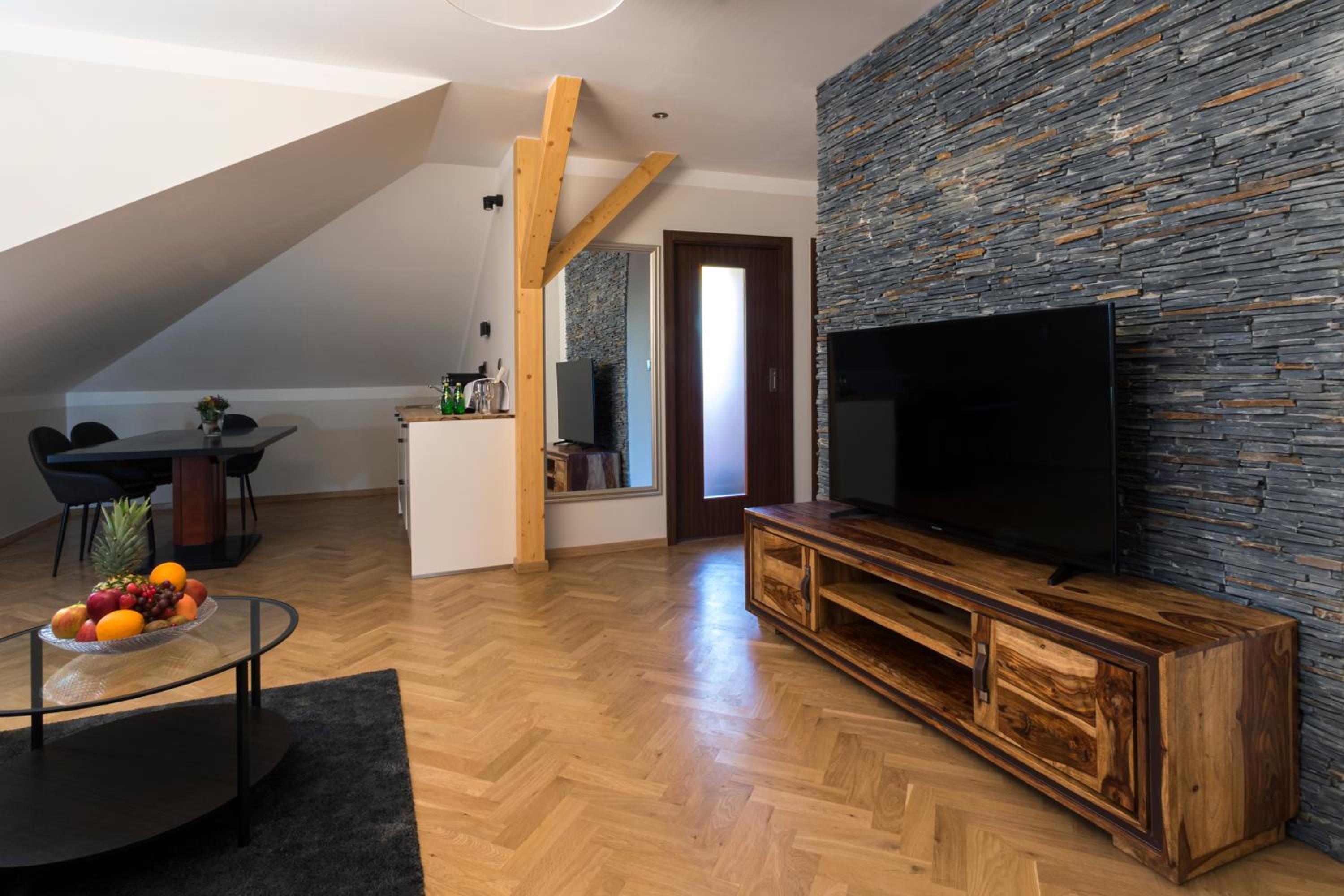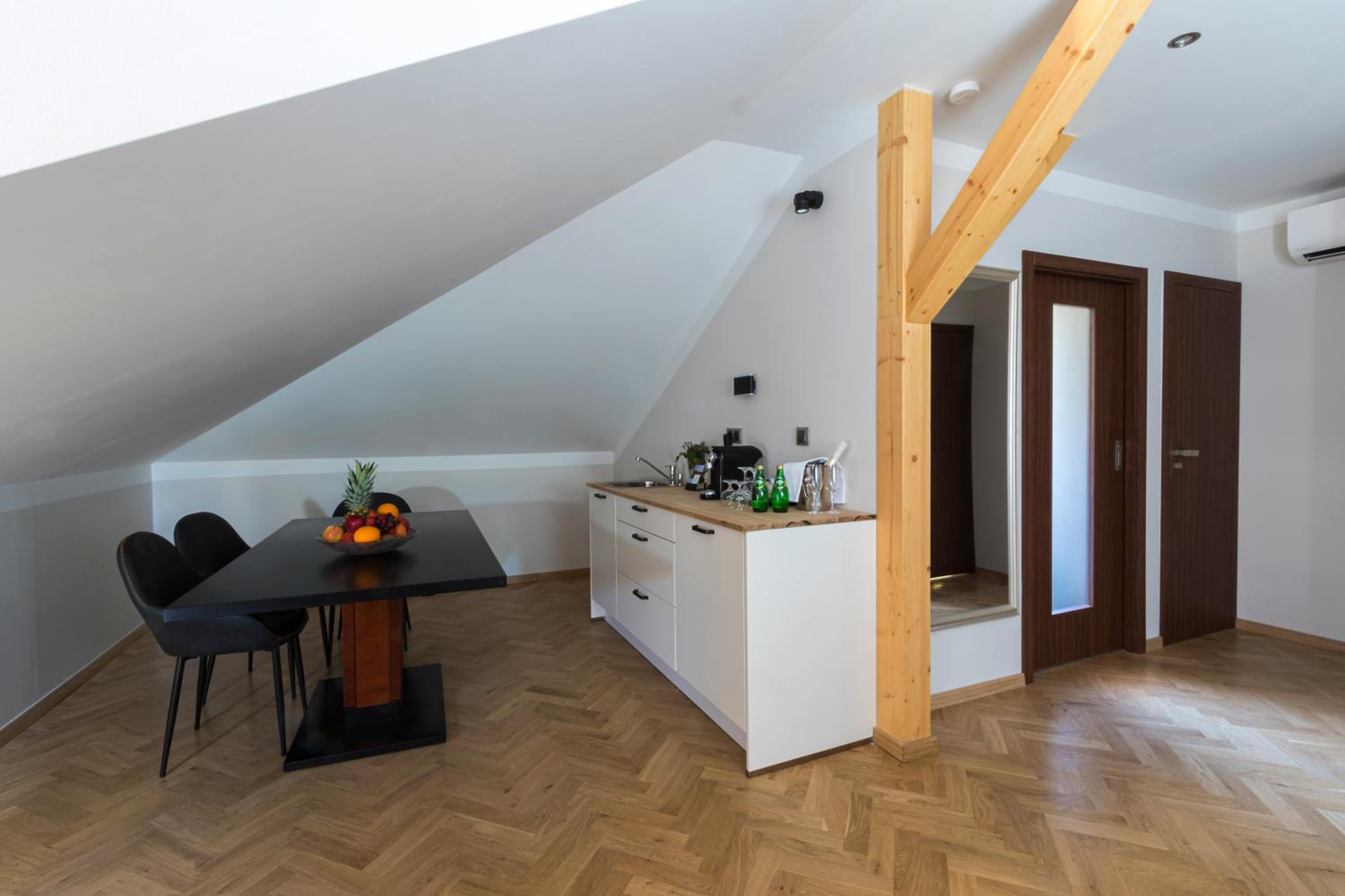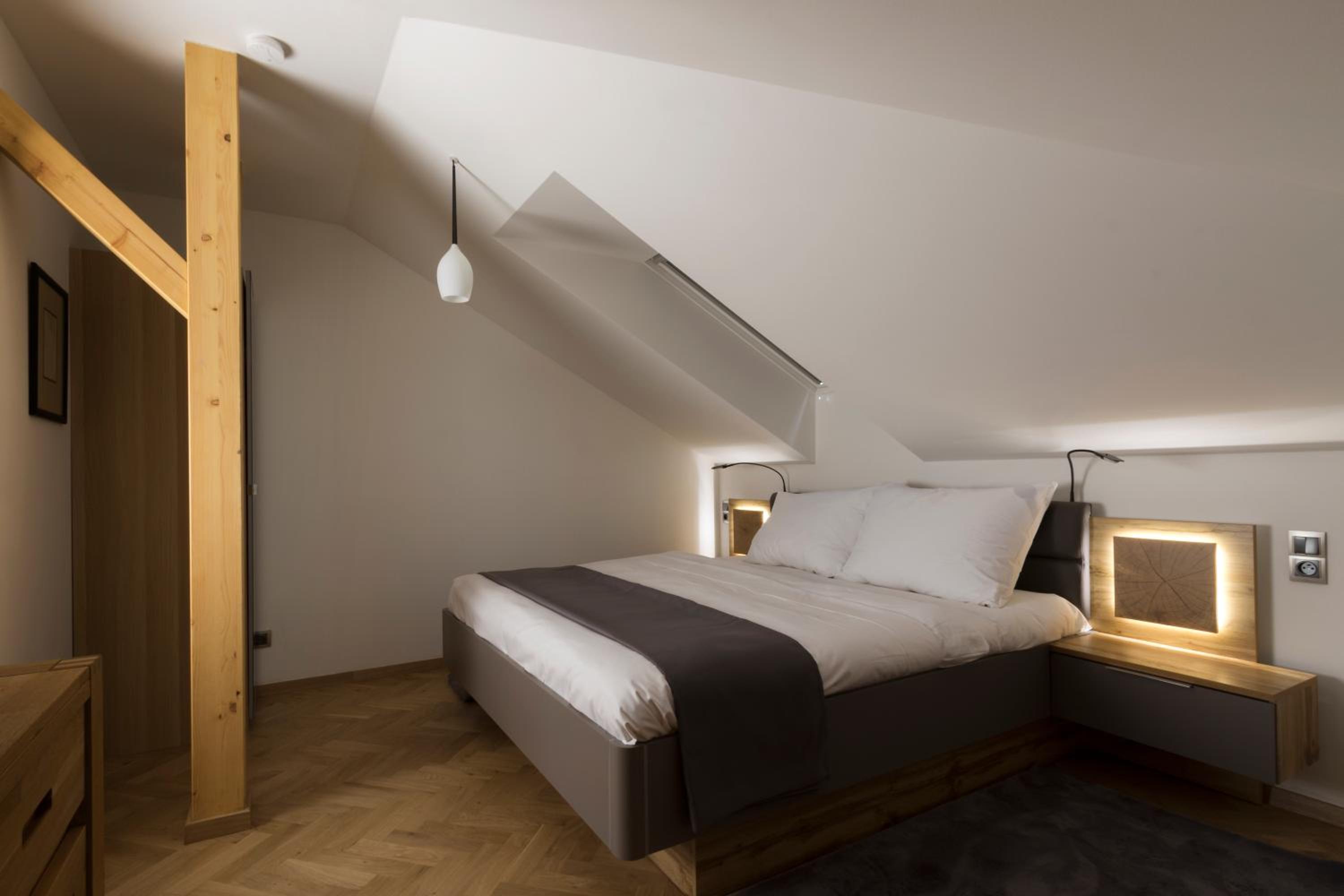 Schody w pokoju to porażka. Są niebezpieczne nawet dla dorosłej i młodej osoby. Strome i śliskie. Karta do pokoju ząbkowana o 9:50 mimo że wymeldowanie było do 10 i nie mogliśmy skorzystać z łazienki po śniadaniu. Śniadanie bardzo skromne. Nawet kawy nie dostałam z ekspresu bo tylko za dodatkową opłatą. W pokoju rolety w oknach nie działają, od nocnego stolika noga wypadała a w lodówce zero barki hotelowego i tylko pustki i rdzę było widać. Jednym słowem stosunek ceny do udogodnień to porażka. Nie polecam tego miejsca nawet na jeden dzień.