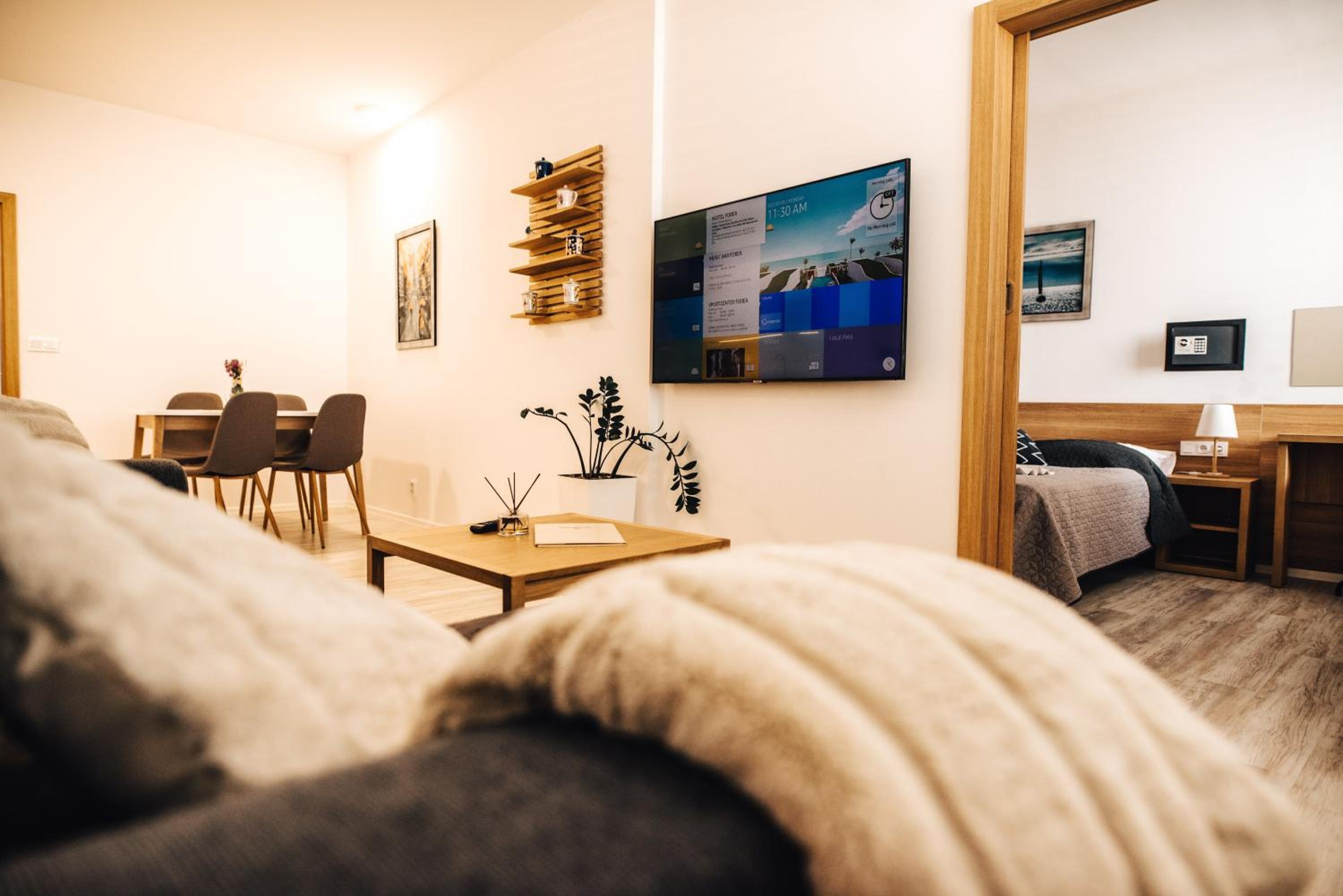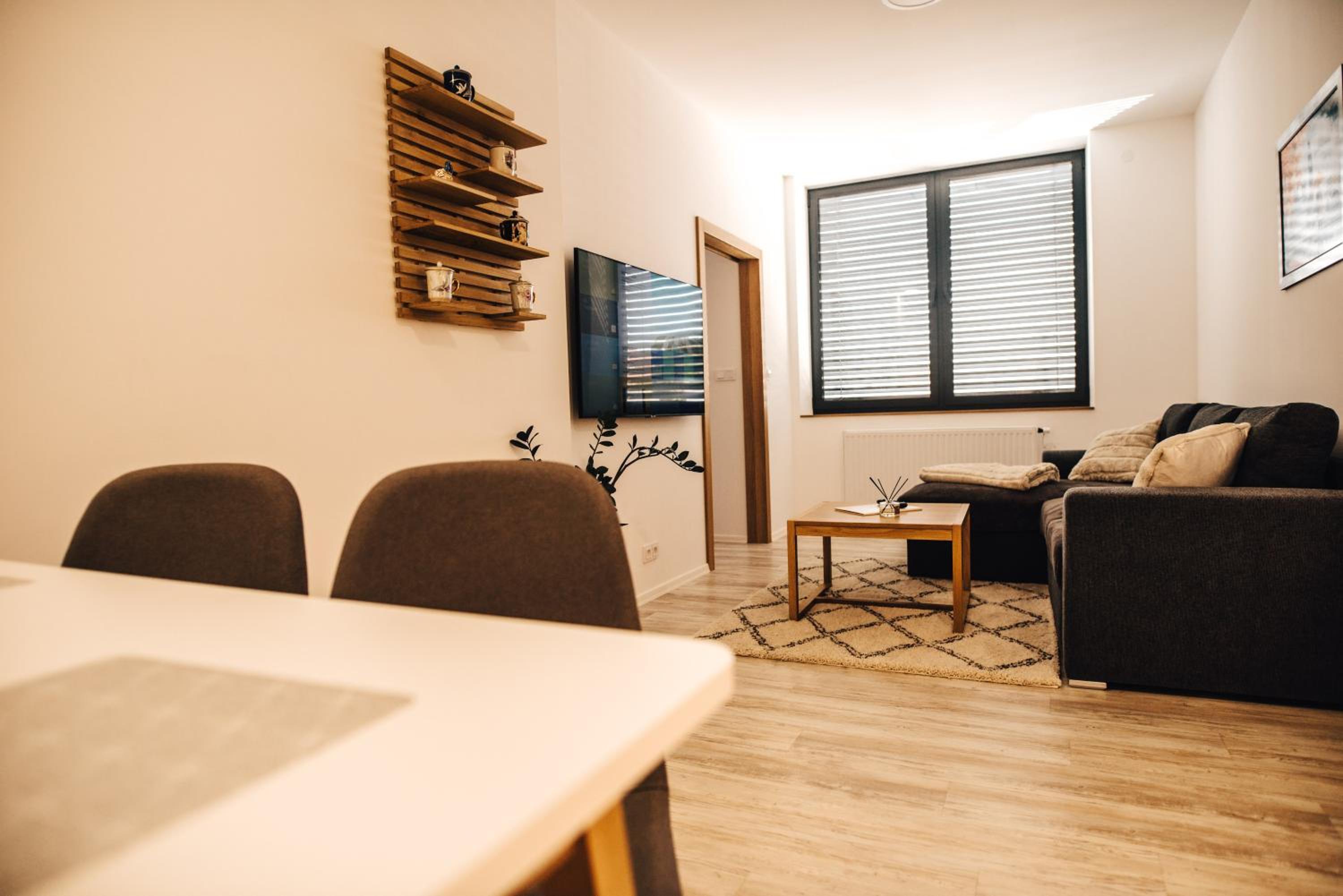Perfektni poloha, meli jsme apartman se 3 loznicemi, takze velmi pohodlne pro 2 rodiny s detmi, ktere chteji byt spolu. V prizemi prijemna kavarna s detskym koutkem.
