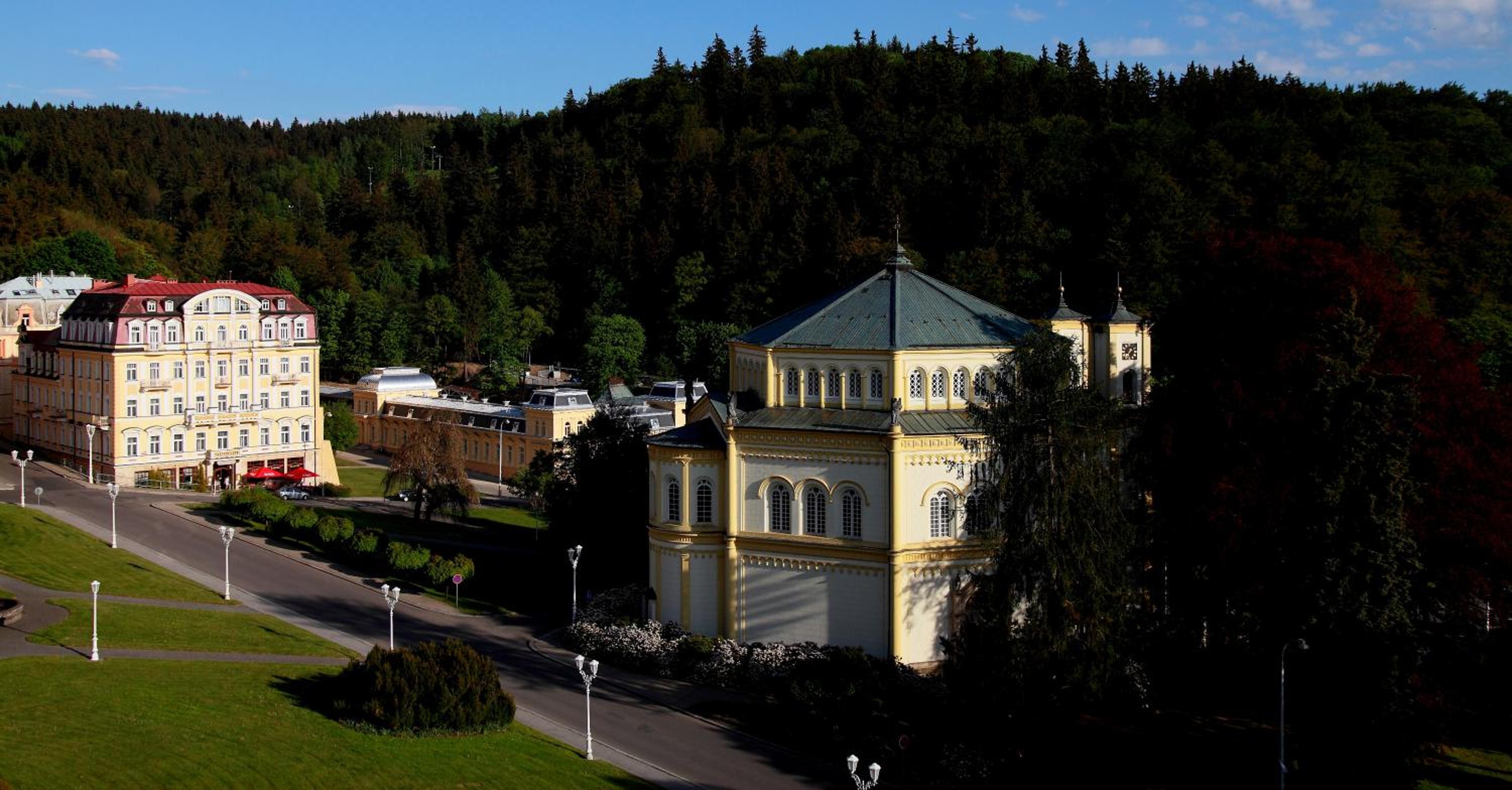 Hotel stojí na úžasném místě nad kolonádou. Vyřeší dobře parkování ve dvoře hotelu.