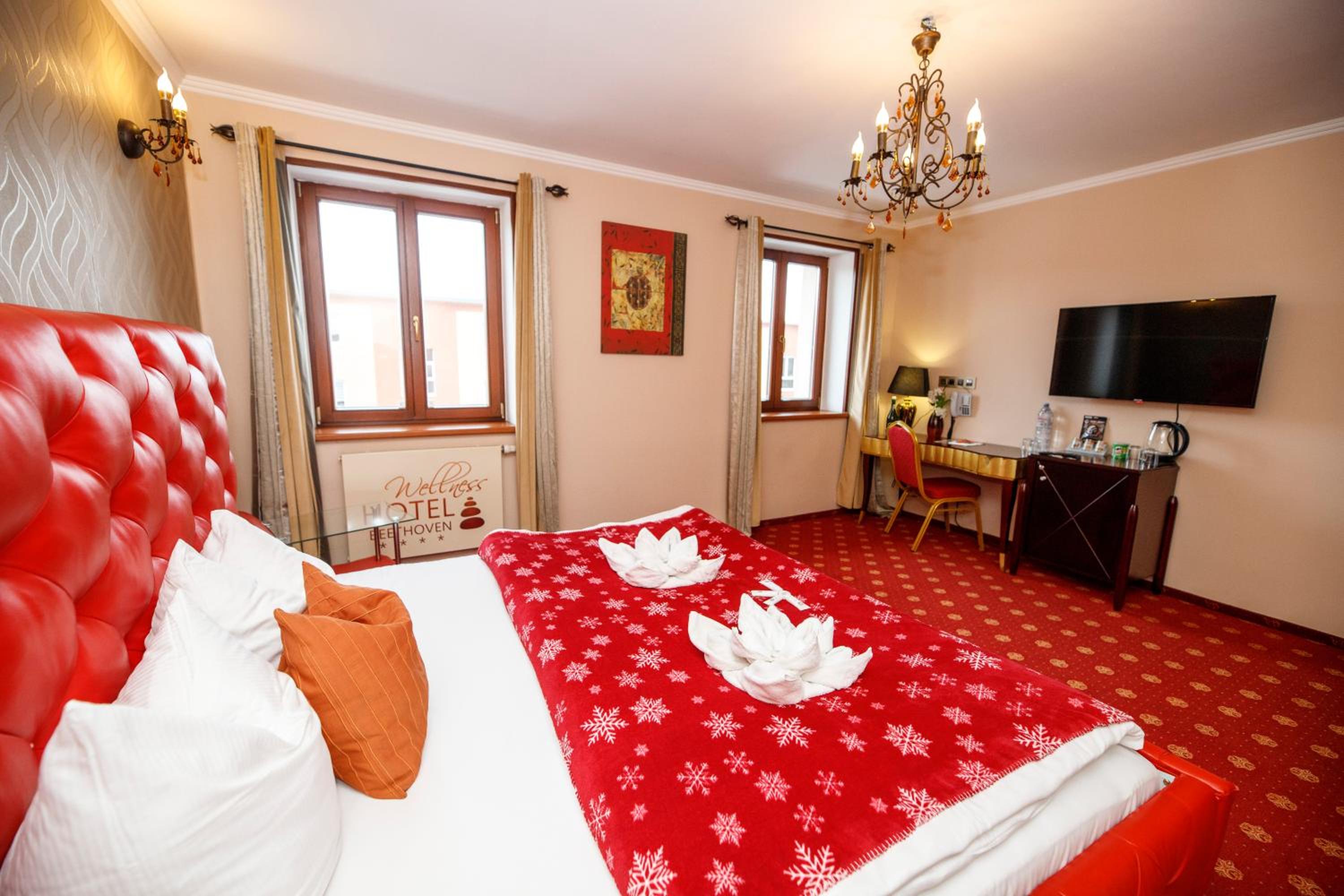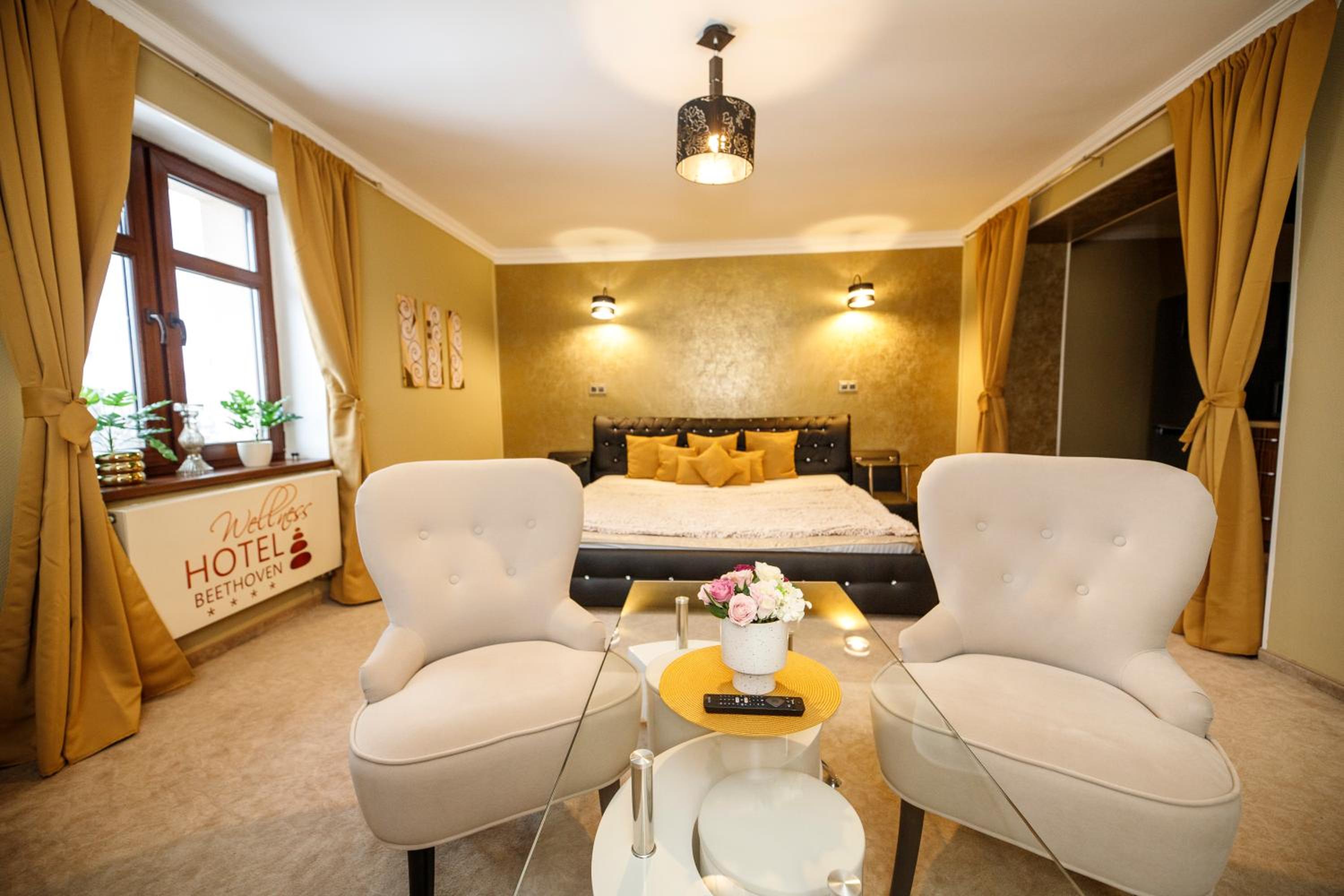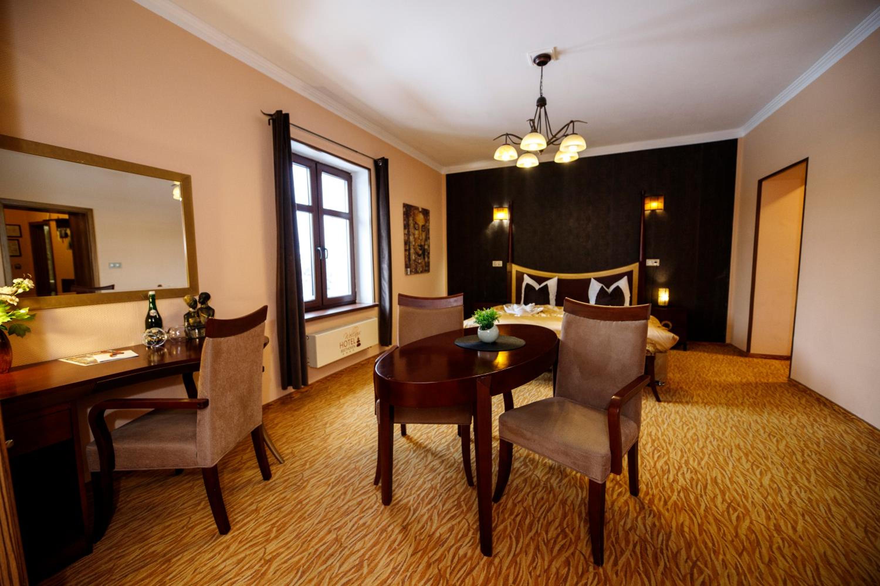 Wellness Hotel Beethoven in Chomutov offers cosy rooms with a touch of elegance. Each room features a seating area, flat-screen TV, and a stylish bathroom. Upgrade to rooms with a kitchenette and separate living space for added comfort. Unwind at the wellness center, complete with a whirlpool, steam room, and infrared sauna.