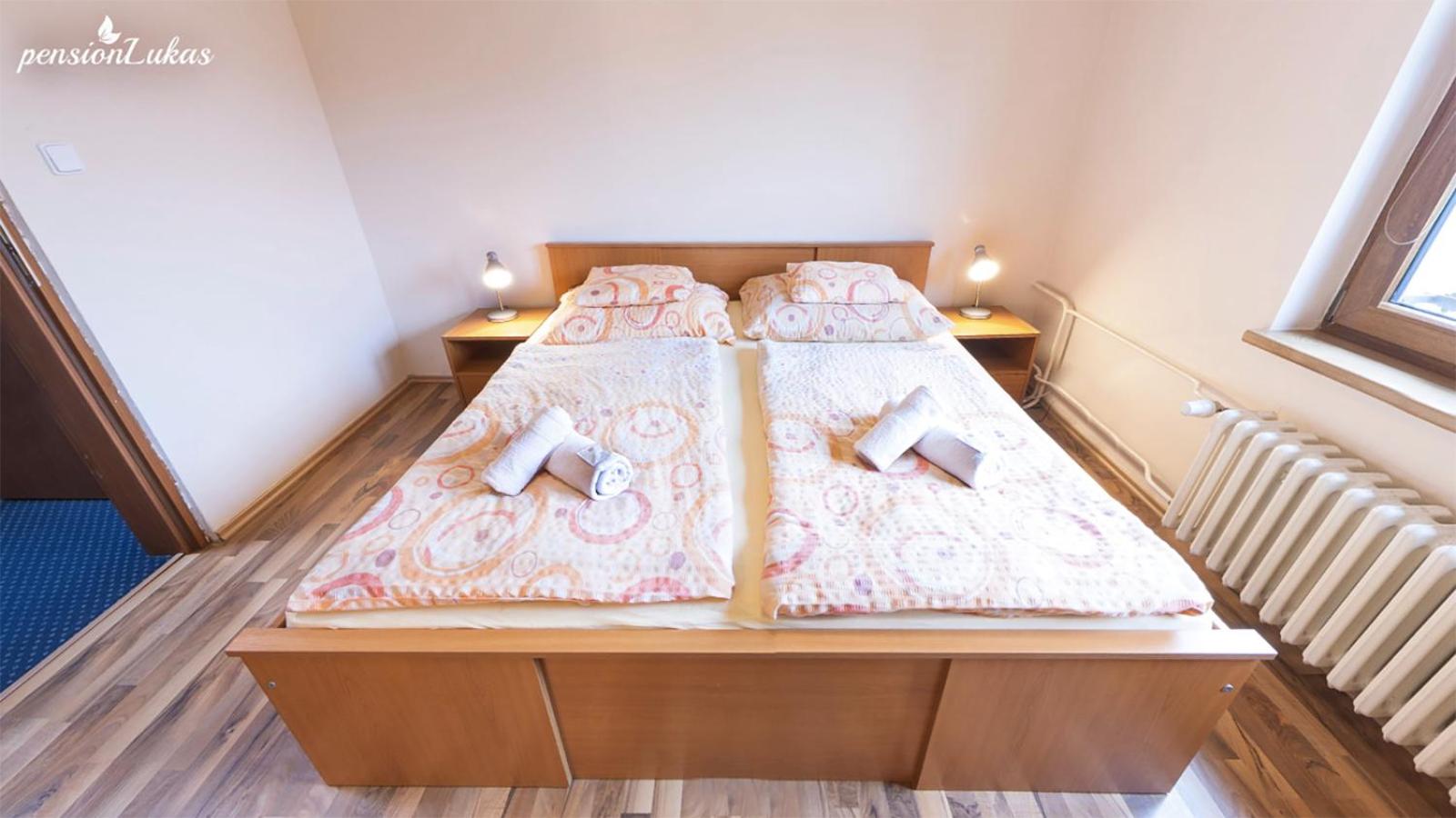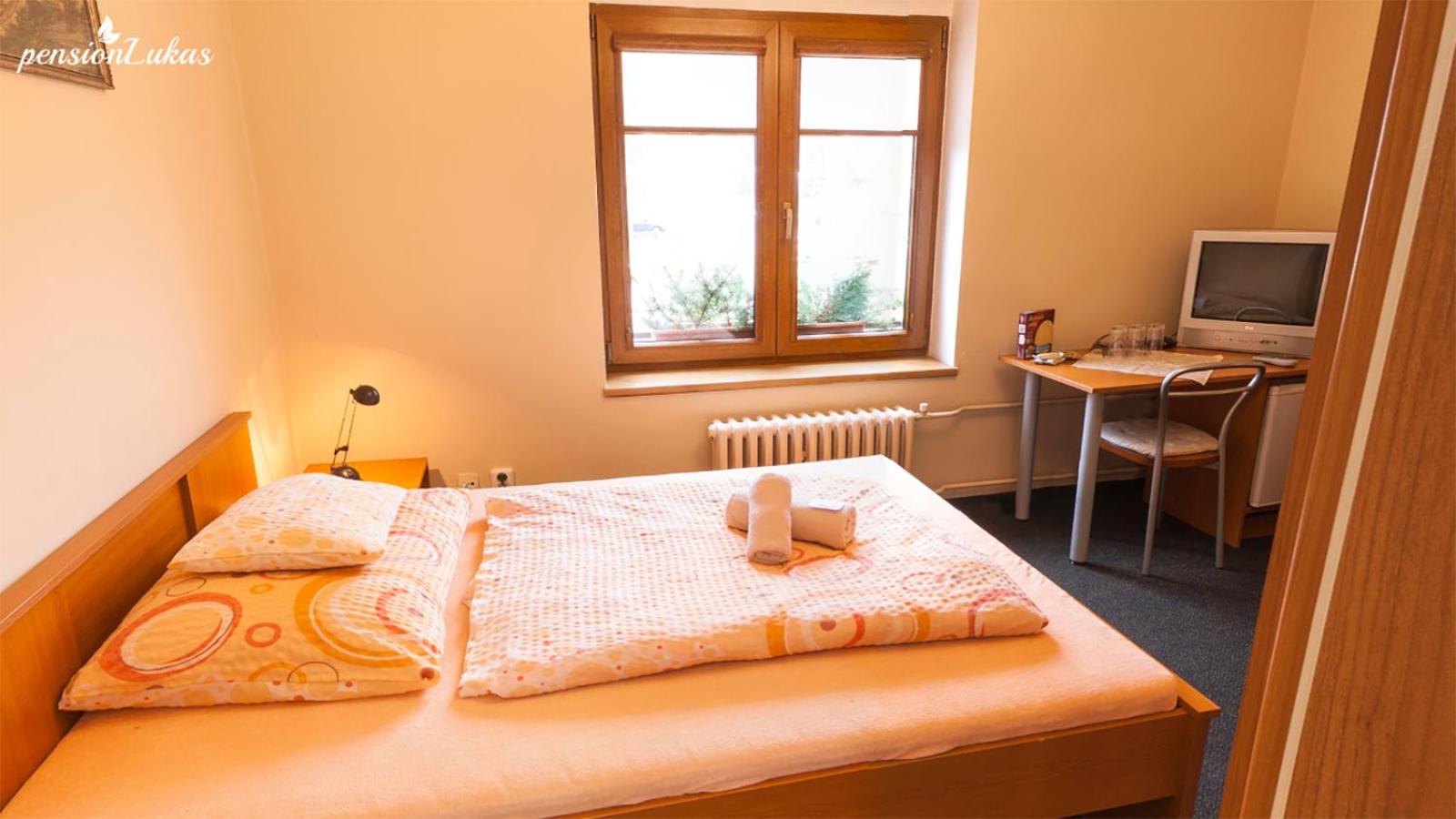 Pohodlné a příjemné zařízení pokoje, velká koupelna, umístění penzionu a možnost mít s sebou psa.