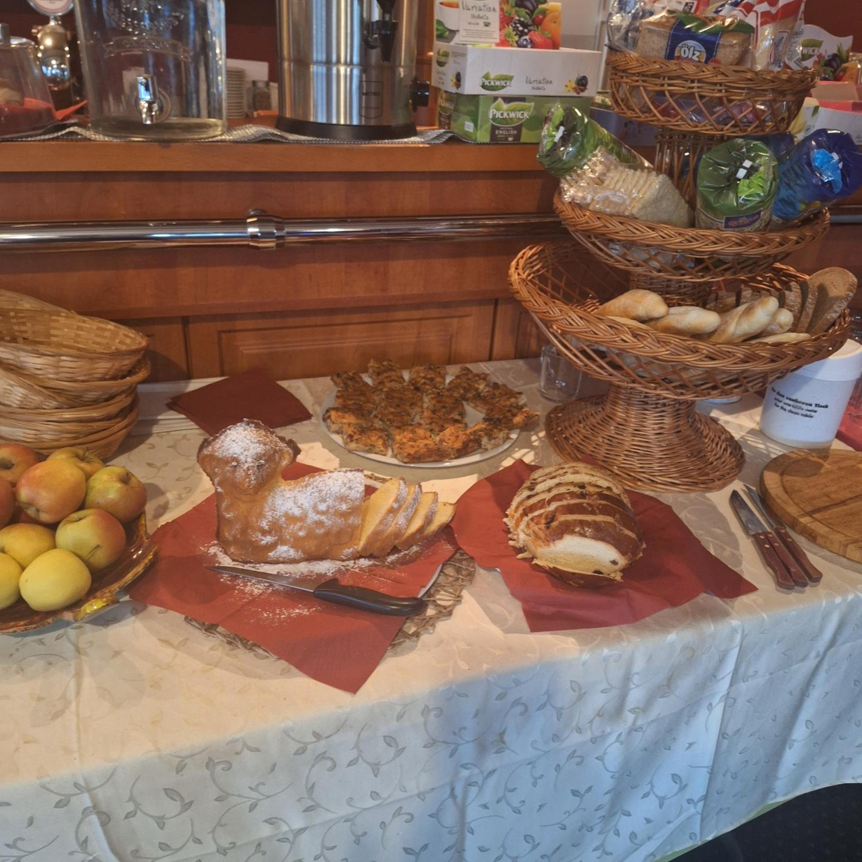 Frühstücksteller stehen schon vorbereitet am Tisch, das ist schlecht für Hygiene, Umwelt und Vegetarier, da man sich nicht komplett selbst aussuchen kann was man möchte.