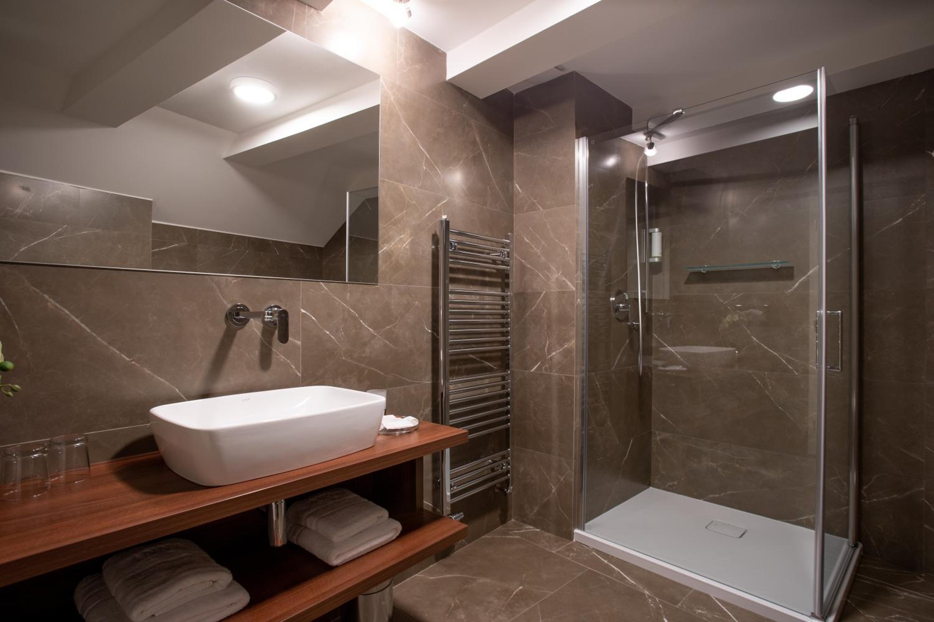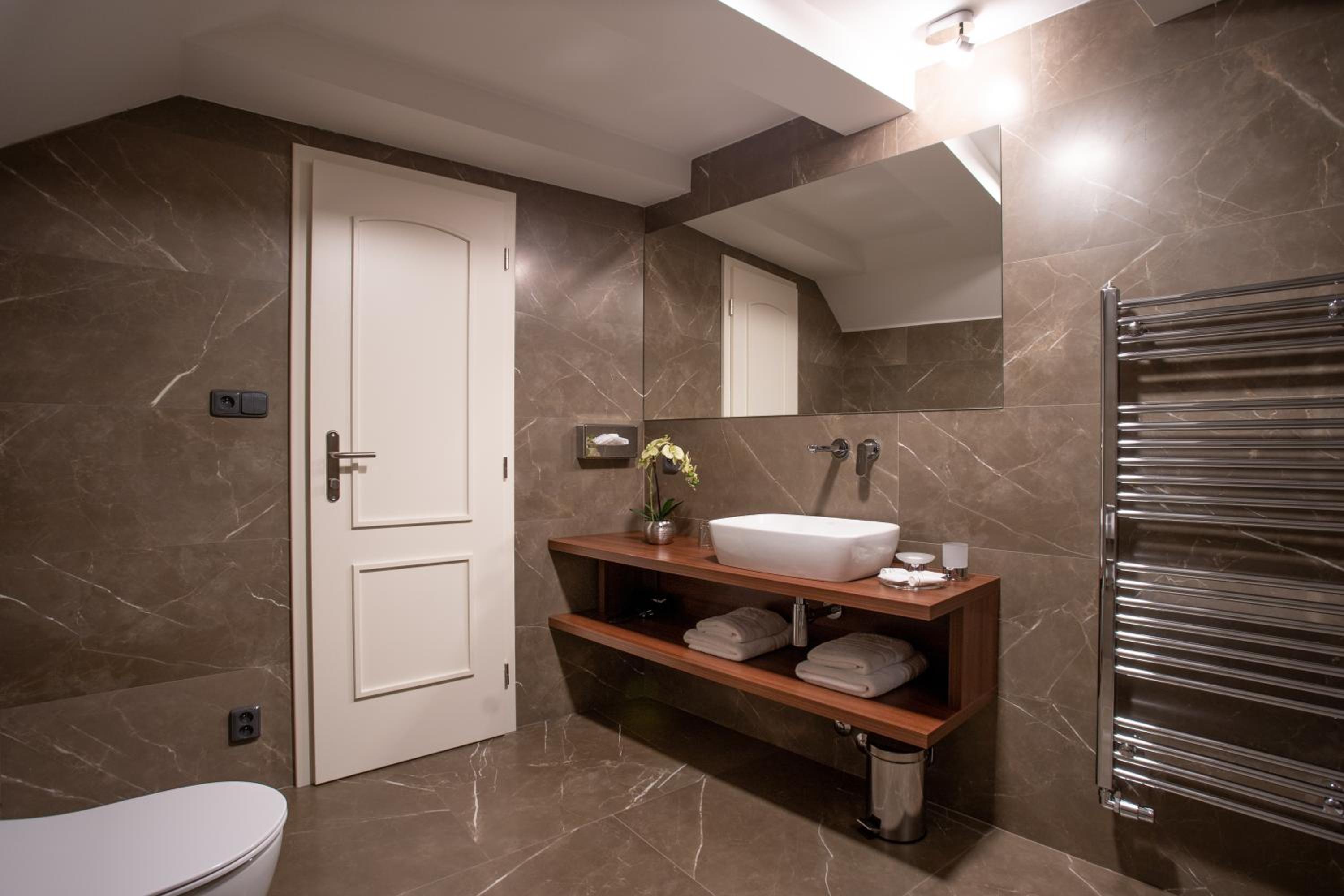 Použité krásné a kvalitní materiály, bohužel zpracování by chtělo zlepšit (okousané dlaždice, na podlaze v dlažbě velká mezera ničím nevyplněna), sprchový kout by se zasloužil lepší péči v čištění.